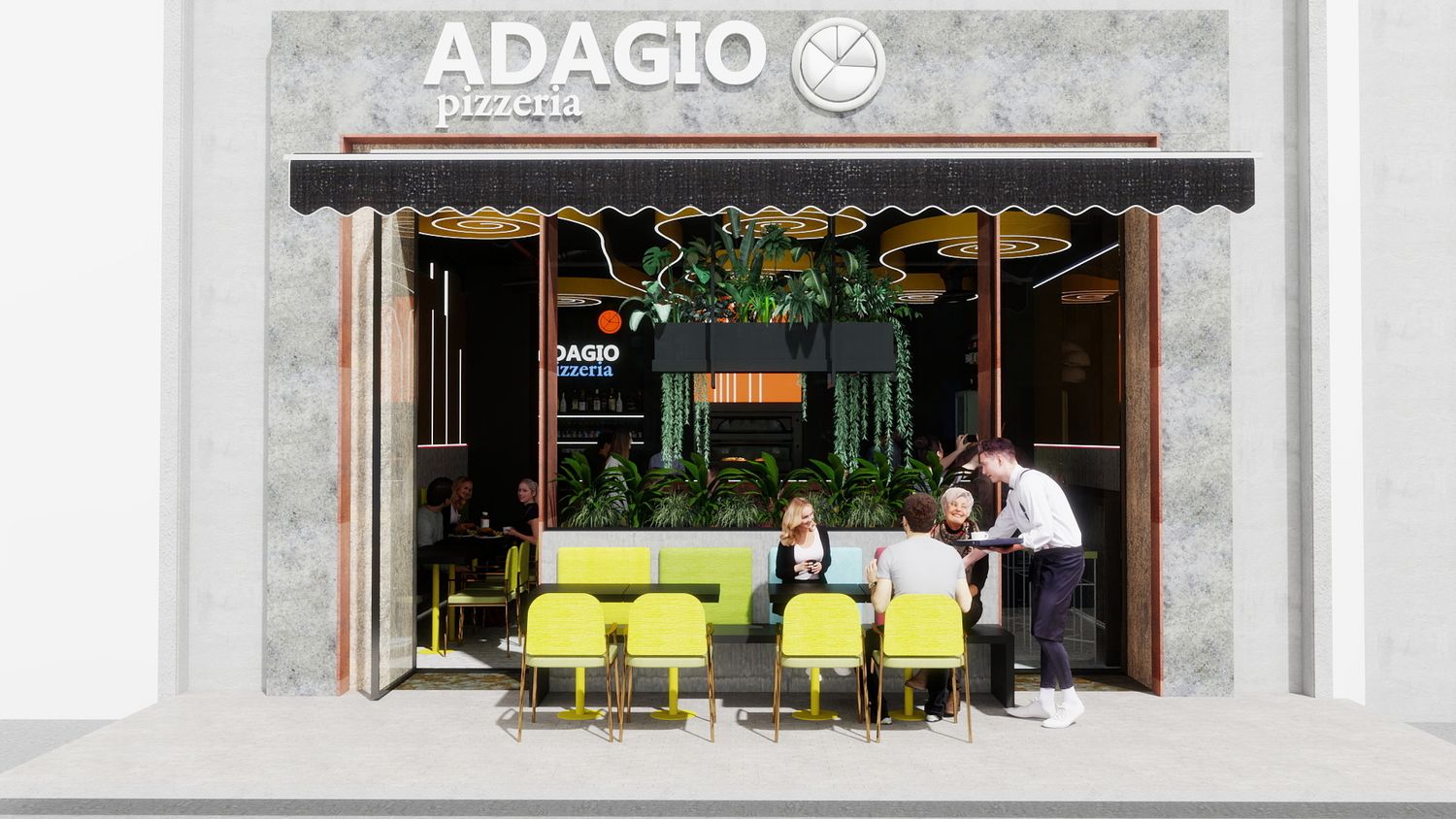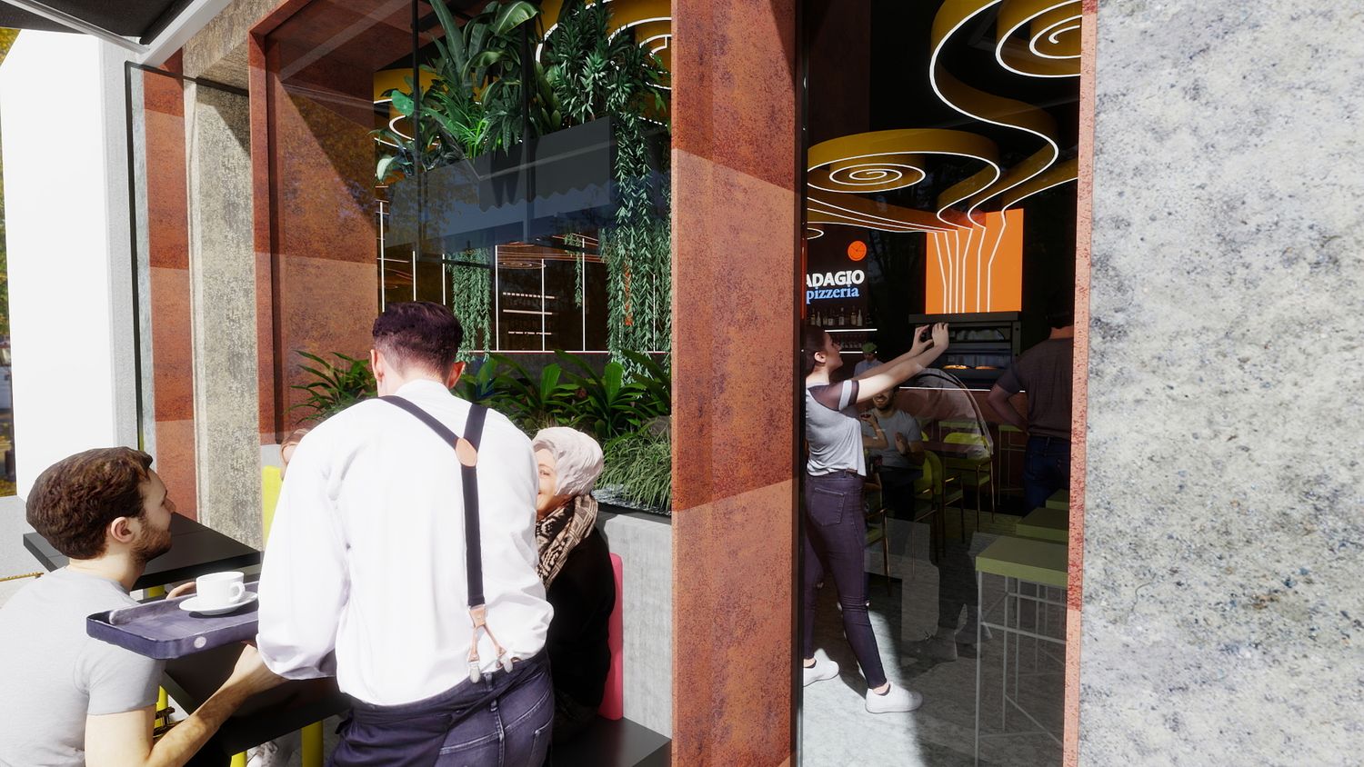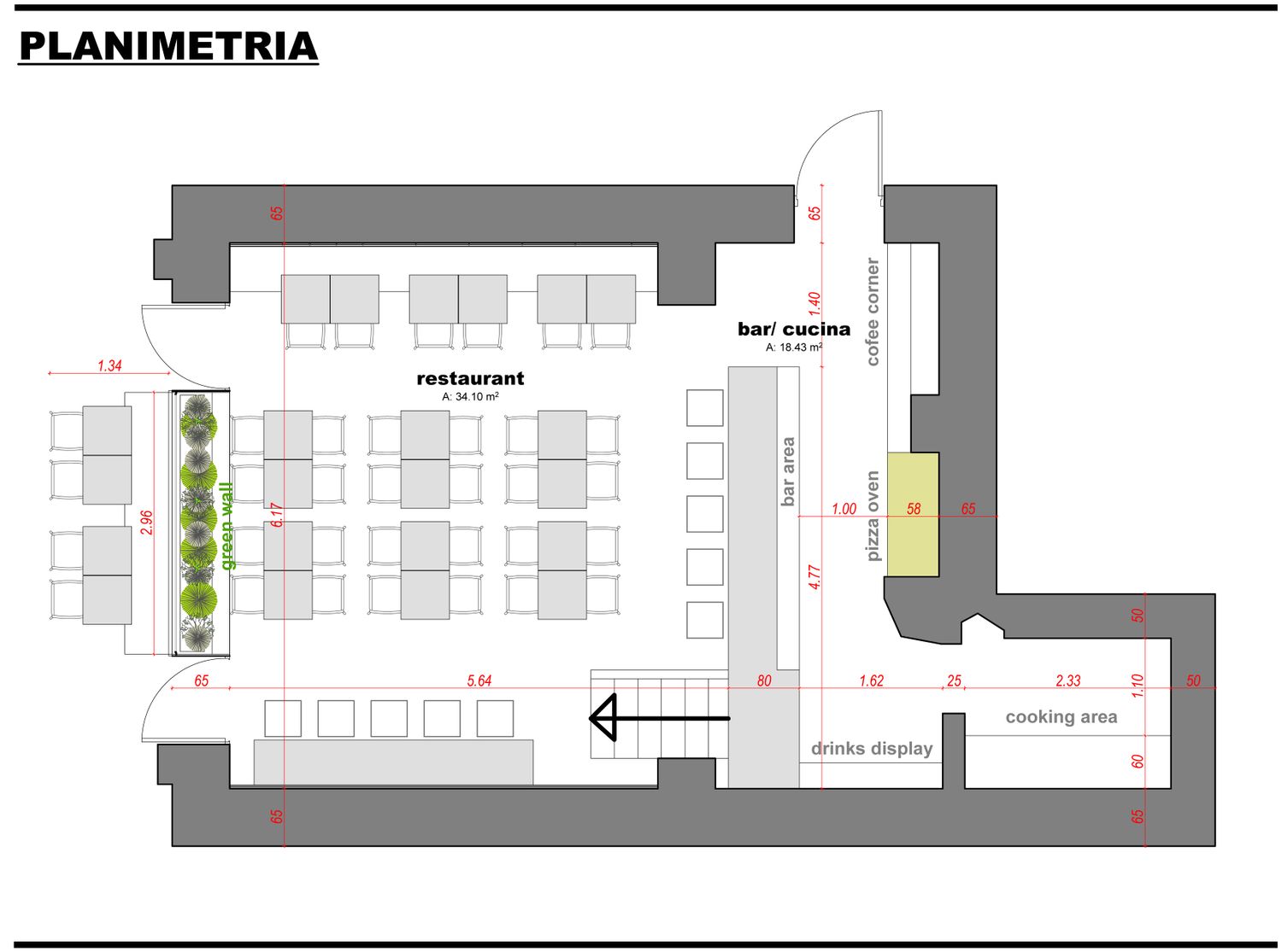 Le porte sono state arretrate sul filo facciata per non ostacolare il flusso pedonale e garantire una migliore gestione dei flussi interni. Lo spazio bar e il forno a vista dispongono di aree di deposito e servizio sufficienti, ma saranno sviluppati in dettaglio insieme al cliente, in coerenza con l’idea di design proposta.