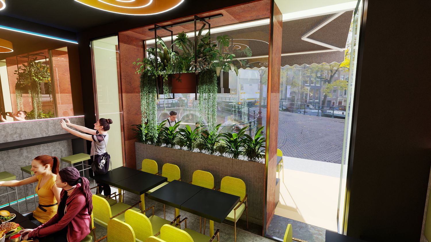 Lo spazio è aperto e trasparente verso l’esterno: le grandi vetrate e il sistema di apertura con pannello centrale mobile permettono, nella stagione estiva, di connettere pienamente interno ed esterno. Sono previsti 44 posti a sedere interni e 10 in terrazza.