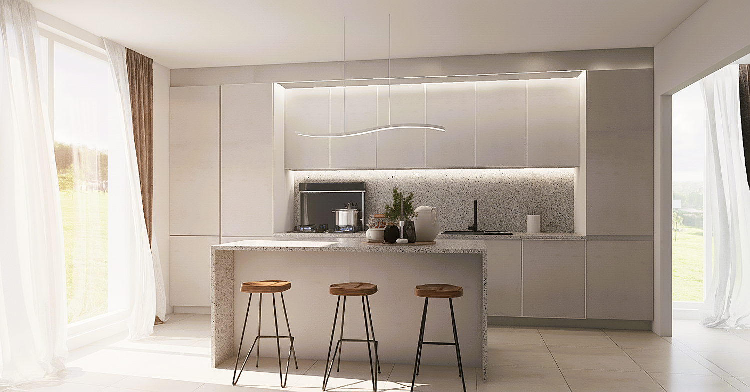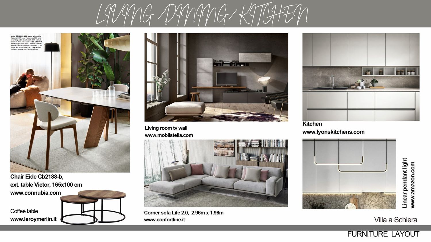 The proposed custom made kitchen and tv unit can be replaced with similar solutions from the preferred furniture stores.