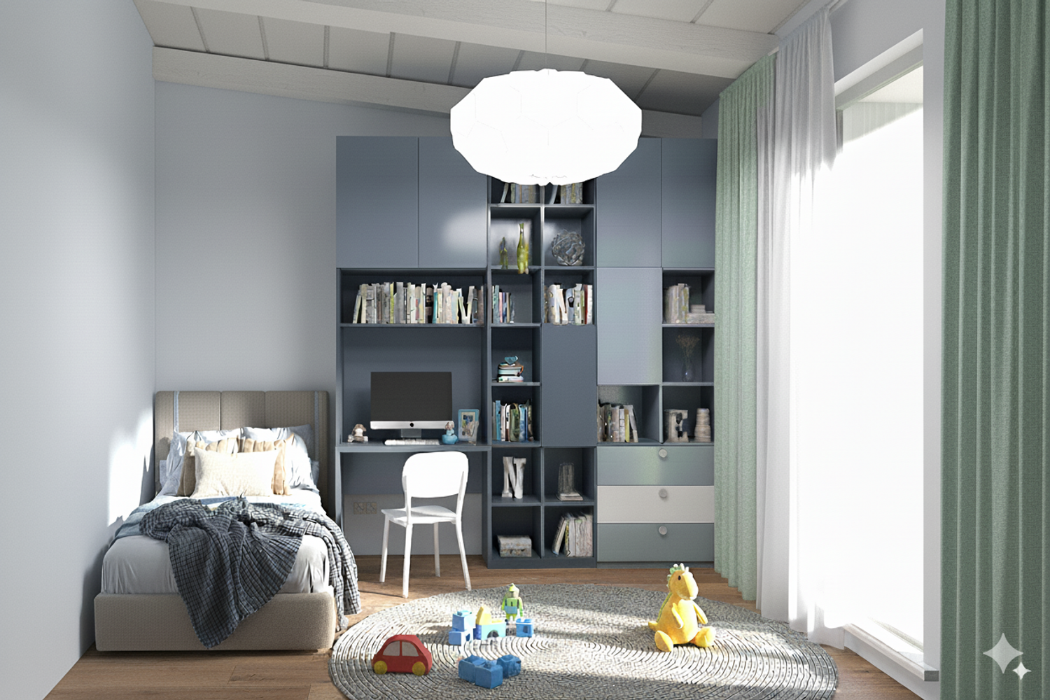 Furniture layout in bedrooms is optimized for your comfort and free flow throughout the house. Furniture is selected following your references and recommendations. There is a dedicated study area planned in bedroom of the younger boy.
