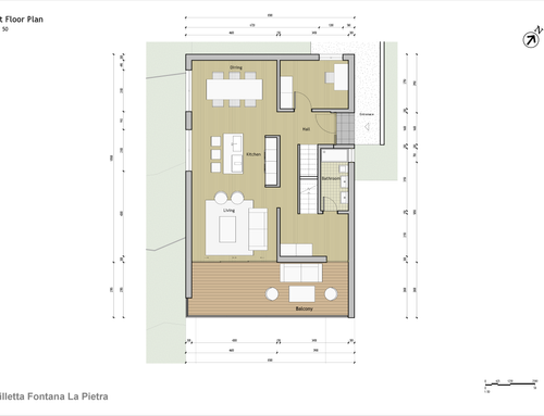Al primo piano ci interessa che sia realizzato un'open space con eventualmente la cucina a vista, un bagno completo di doccia e un piccolo rispostiglio.