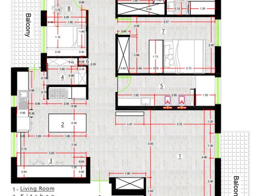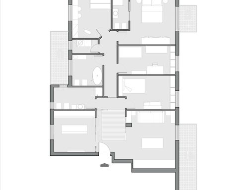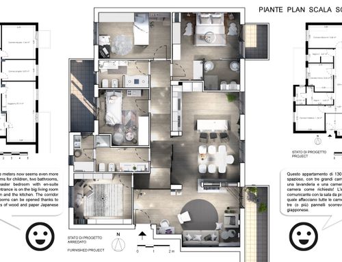 La zona notte prevede la matrimoniale con accesso diretto al bagno e tre vivaci camere per i bambini, i quali avranno accesso al bagno dal corridoio, mantenendo la possibilità di fruire del terzo servizio.