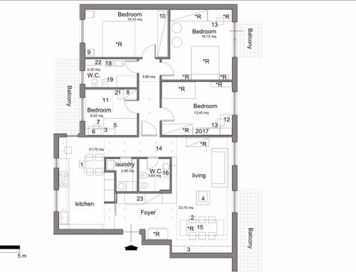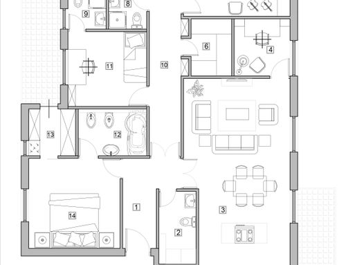 Vorremmo concepire una grande zona giorno, con una spaziosa e attrezzata cucina e un accogliente salone, separati dalle minime barriere necessarie, in modo da mantenere all'occorrenza una configurazione più o meno aperta e grande luminositÃ