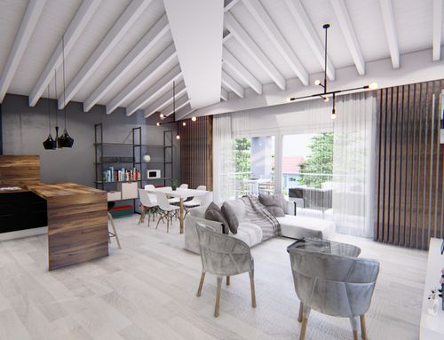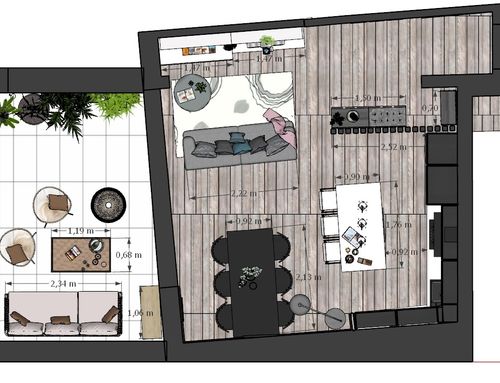 We would like to furnish the living area of our new apartment. It's an open space of about 37sqm with a very high exposed white beam ceiling (min. 291 - max 474). We would like a medium-sized kitchen with island or peninsula (2/3 stools), extendable table (at least up to 2m) and living area with sofa at least 3 seats (TV connections predisposed in the wall bordering the double bedroom). We would like a well-proportioned room, which also allows us to organize dinners or evenings with friends. The property is new and finished with a light gray wood-effect porcelain stoneware floor and underfloor heating (so no excavations on the ground). The upper central beam will be covered with a white plasterboard, the lighting prepared is with applique. We like colors such as white, black and gray in a modern and / or Nordic style with wooden elements. Thank you!