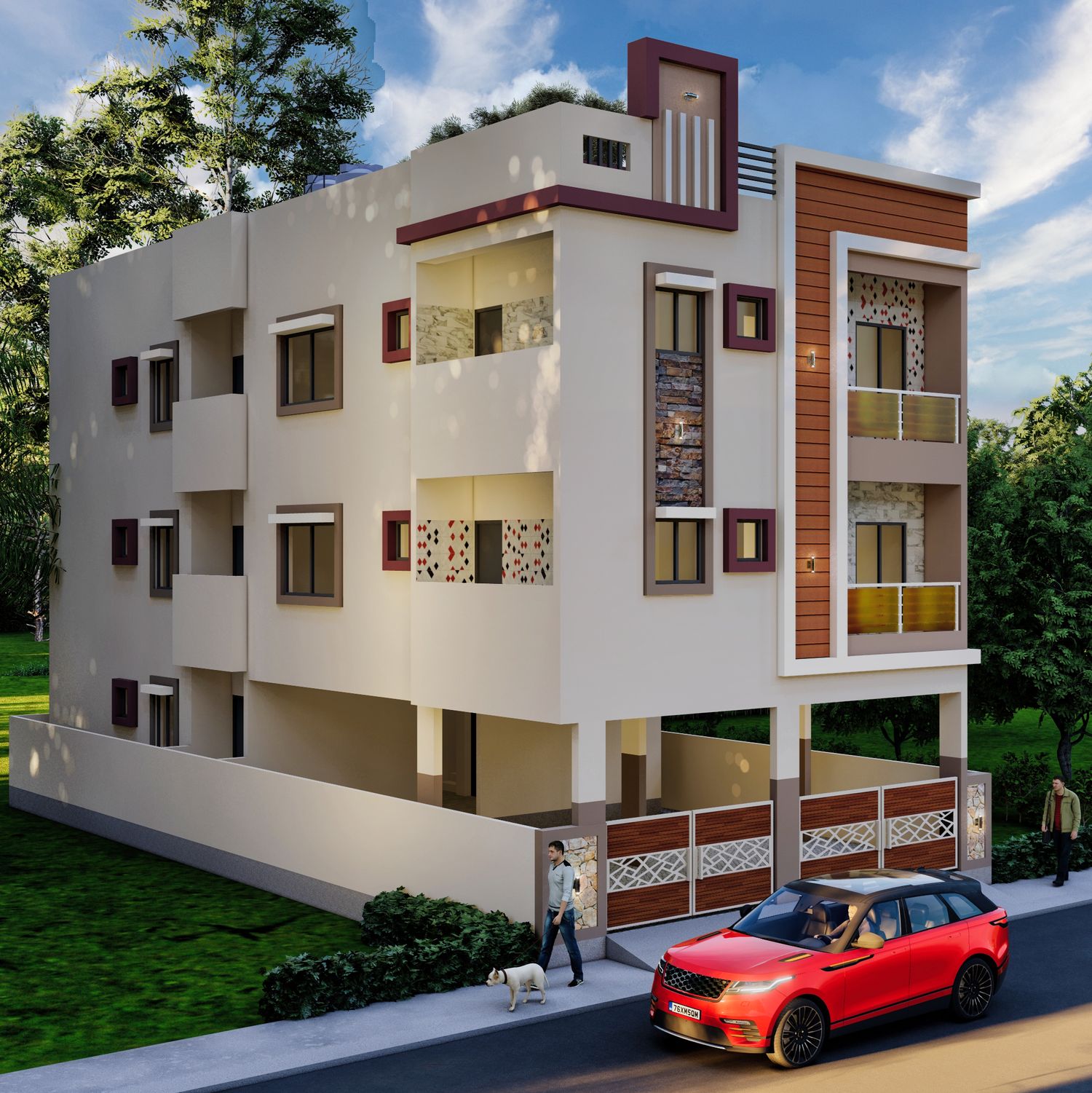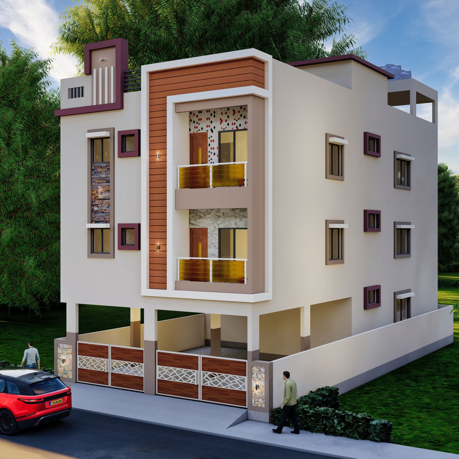 Key structural elements include cantilevered balconies with varied railing opacities and distinct vertical framing that breaks the visual mass of the building. The layout incorporates spacious stilt parking on the ground level and optimized residential units above. As the construction manager, I oversaw all on-site execution, ensuring high-fidelity translation of the 3D visualization into reality, with strict attention to material quality and structural integrity.