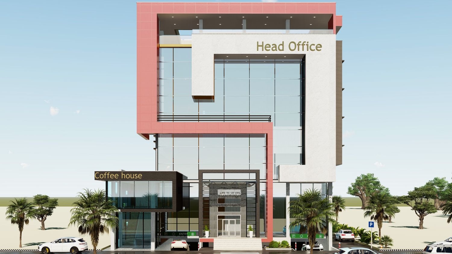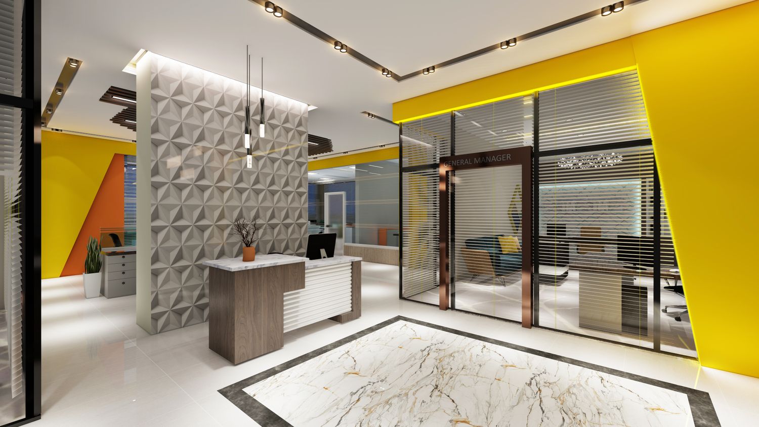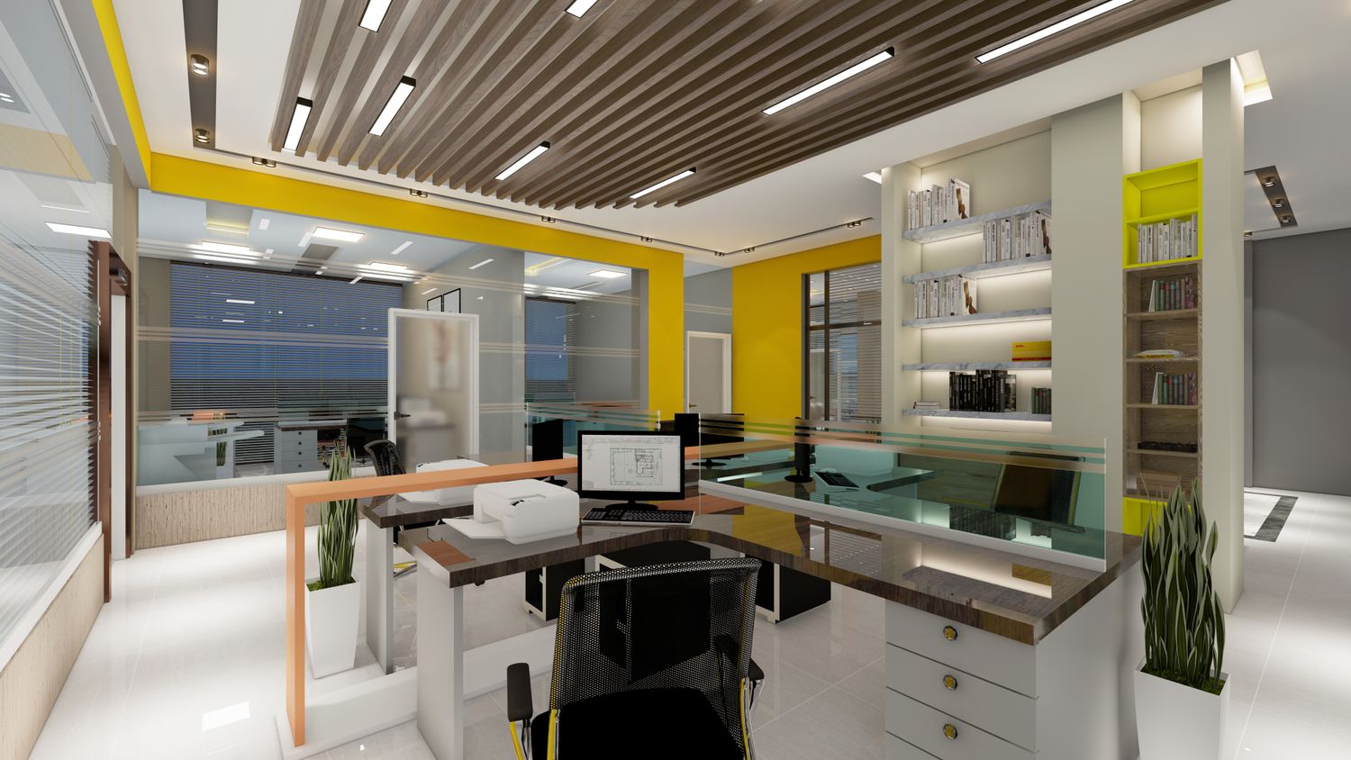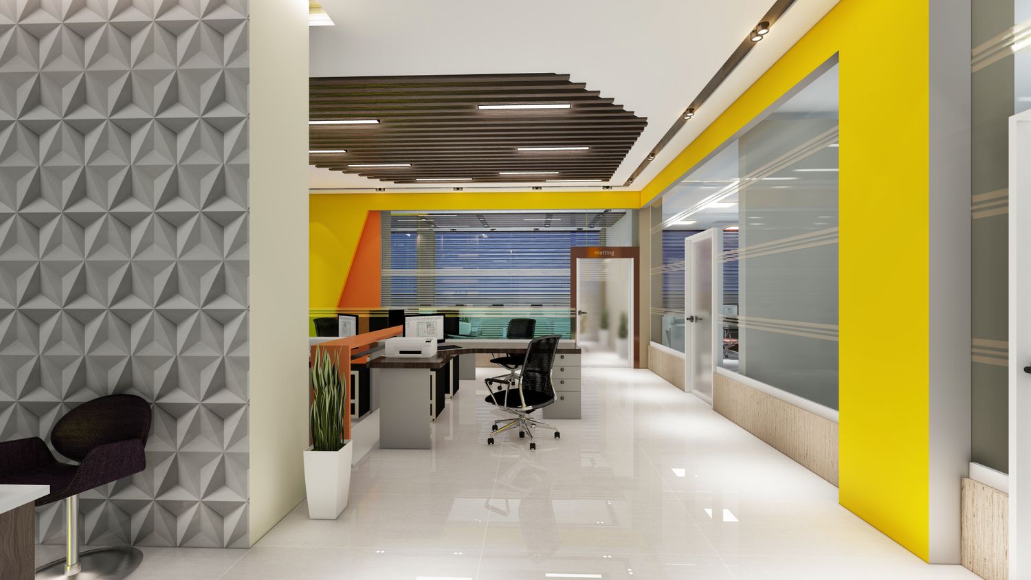 office interior design and building exterior.