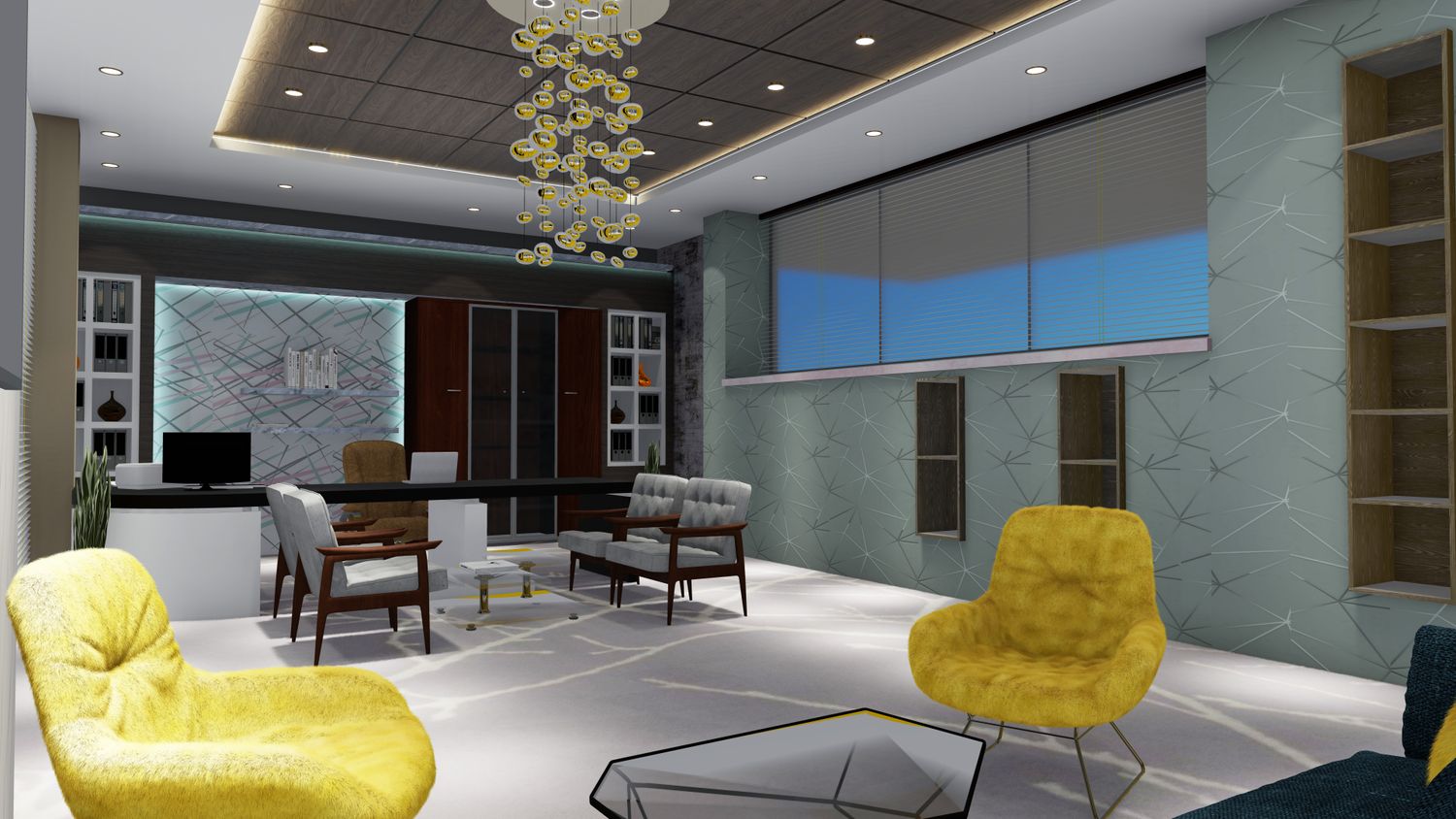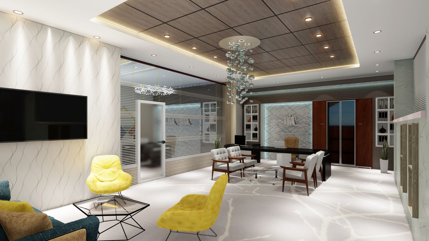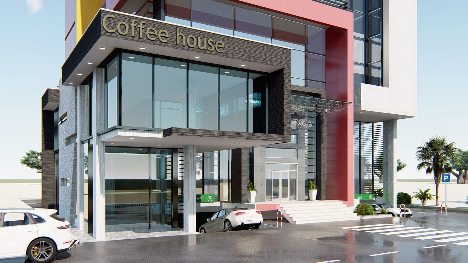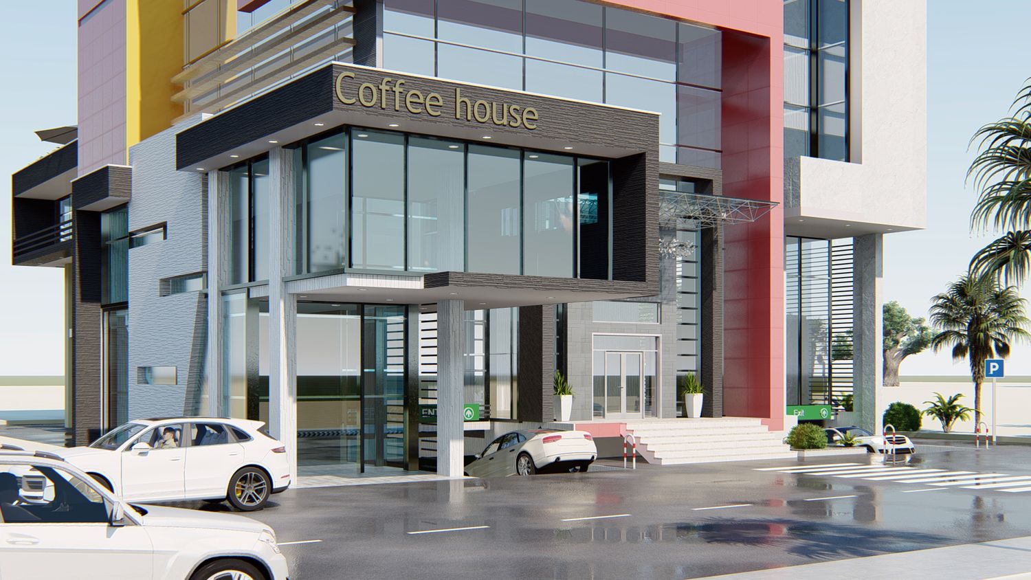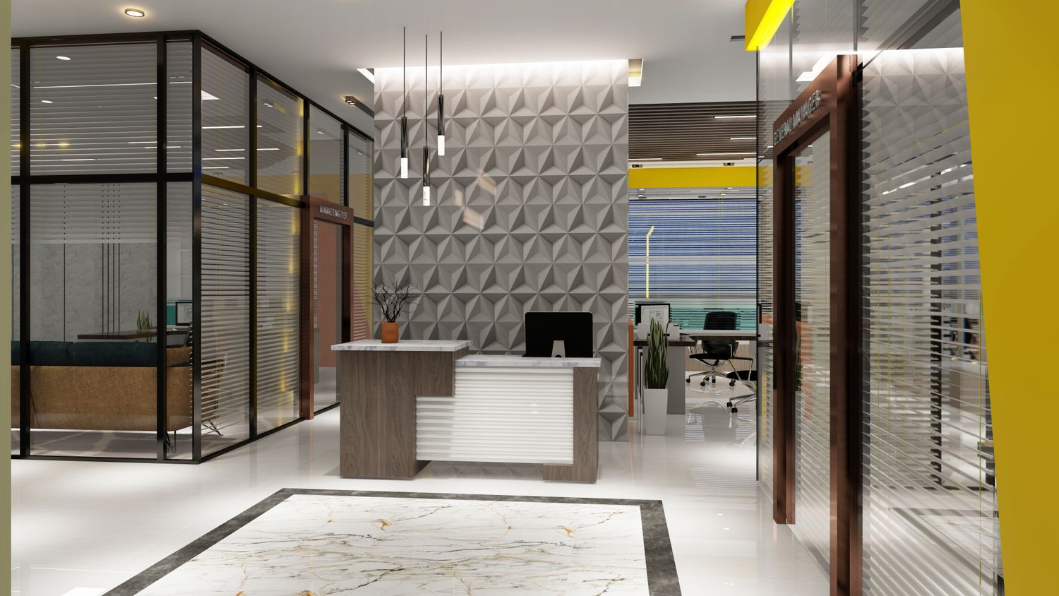 office interior design and building exterior.