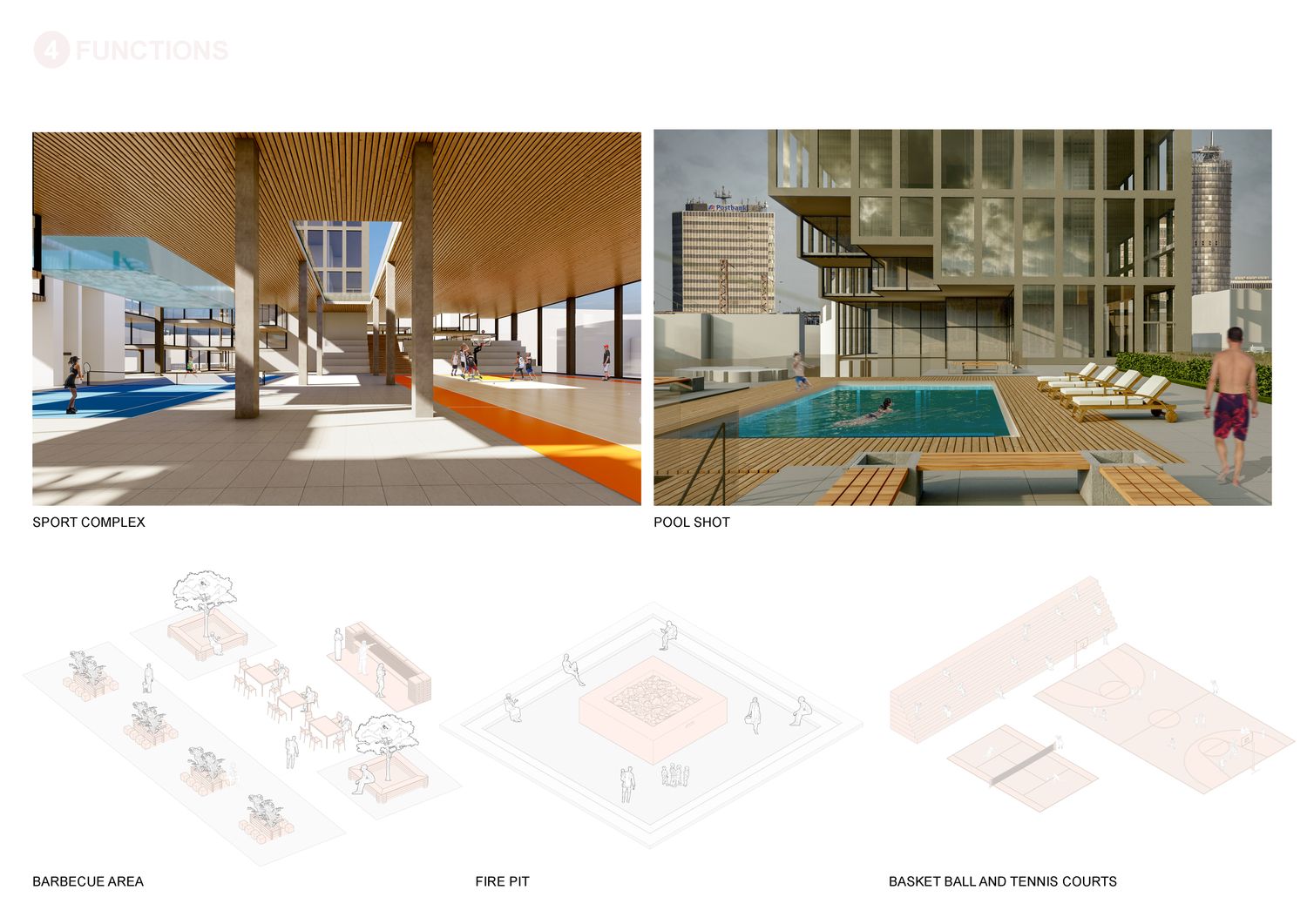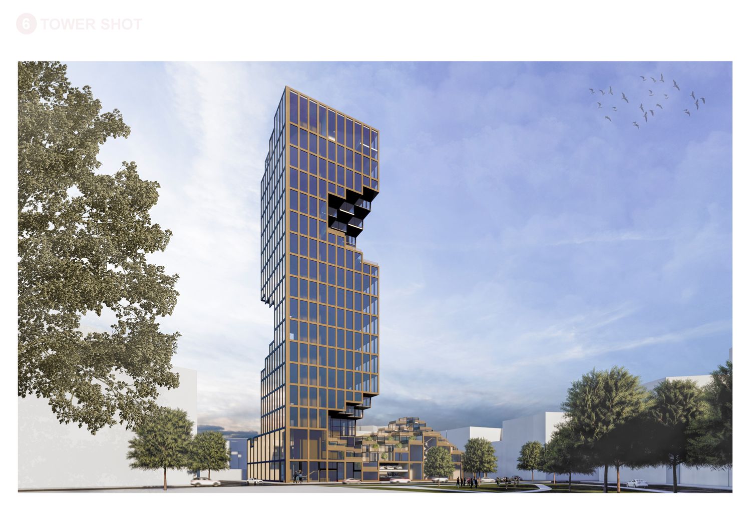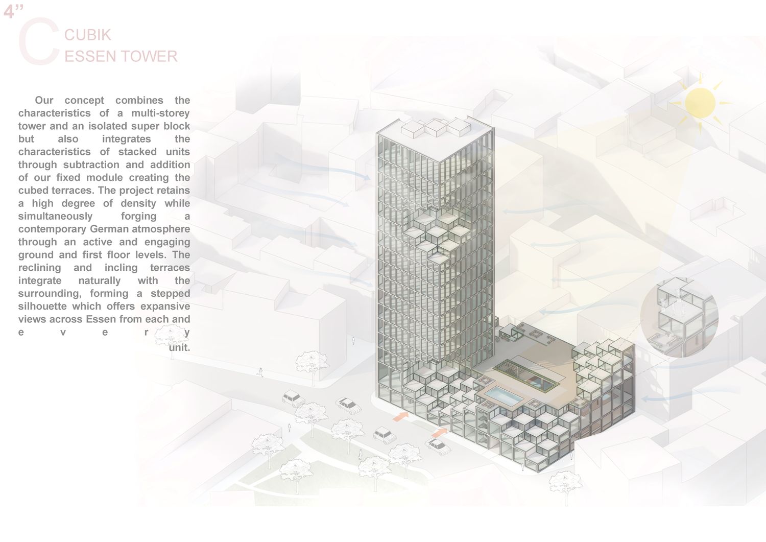 Our concept combines the characteristics of a multi-storey tower and an isolated super block but also integrates the characteristics of stacked units through subtraction and addition of our fixed module creating the cubed terraces. The project retains a high degree of density while simultaneously forging a contemporary German atmosphere through an active and engaging ground and first floor levels. The reclining and incling terraces integrate naturally with the surrounding, forming a stepped silhouette which offers expansive views across Essen from each and every