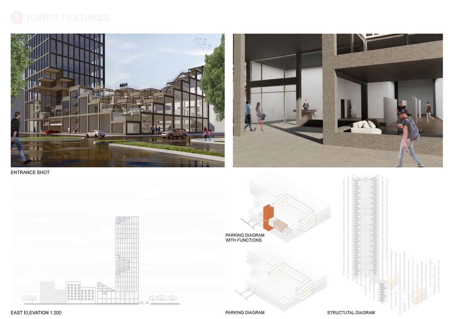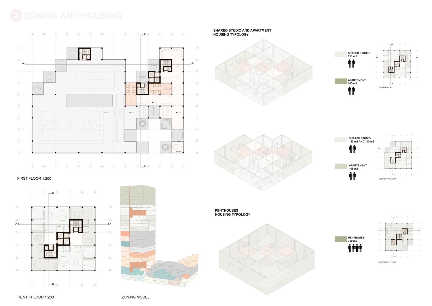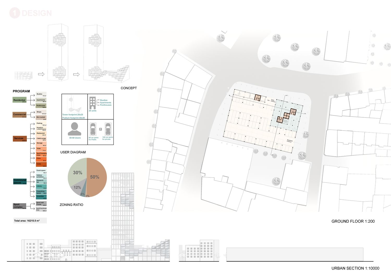 Our concept combines the characteristics of a multi-storey tower and an isolated super block but also integrates the characteristics of stacked units through subtraction and addition of our fixed module creating the cubed terraces. The project retains a high degree of density while simultaneously forging a contemporary German atmosphere through an active and engaging ground and first floor levels. The reclining and incling terraces integrate naturally with the surrounding, forming a stepped silhouette which offers expansive views across Essen from each and every