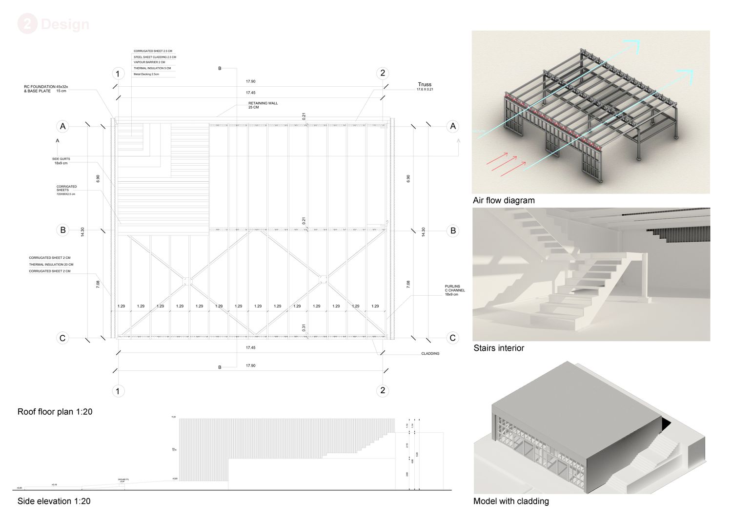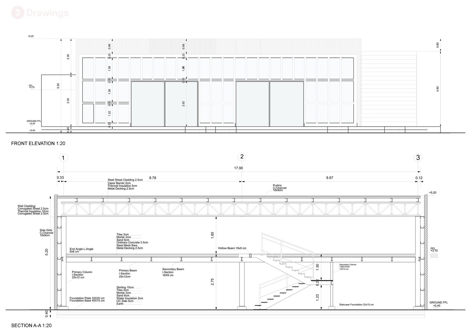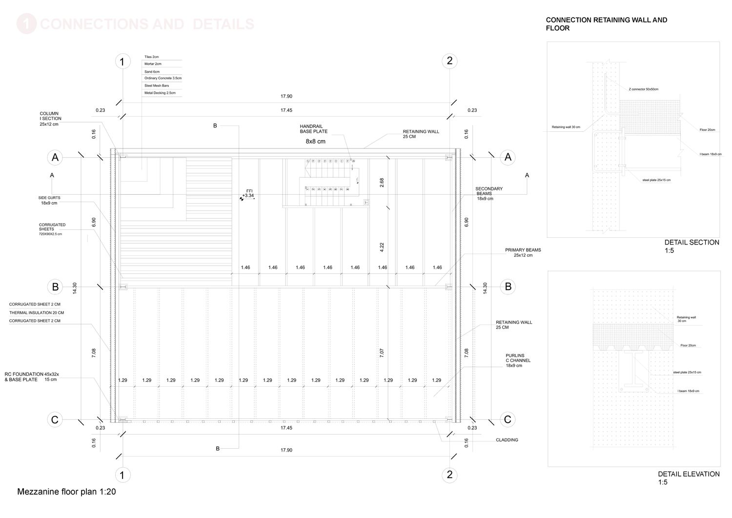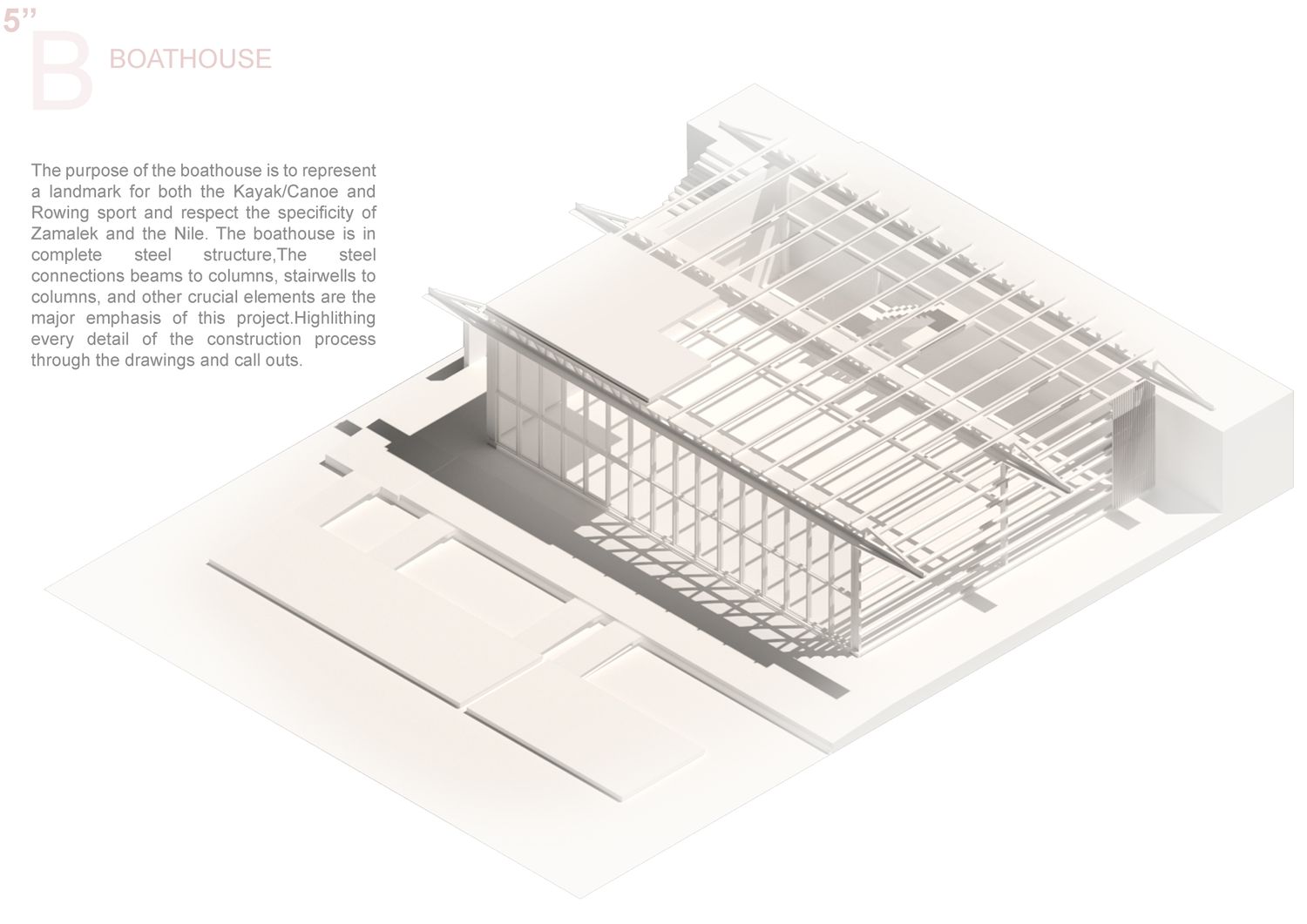 The purpose of the boathouse is to represent a landmark for both the Kayak/Canoe and Rowing sport and respect the specificity of Zamalek and the Nile. The boathouse is in complete steel structure,The steel connections beams to columns, stairwells to columns, and other crucial elements are the major emphasis of this project.Highlithing every detail of the construction process through the drawings and call outs.
