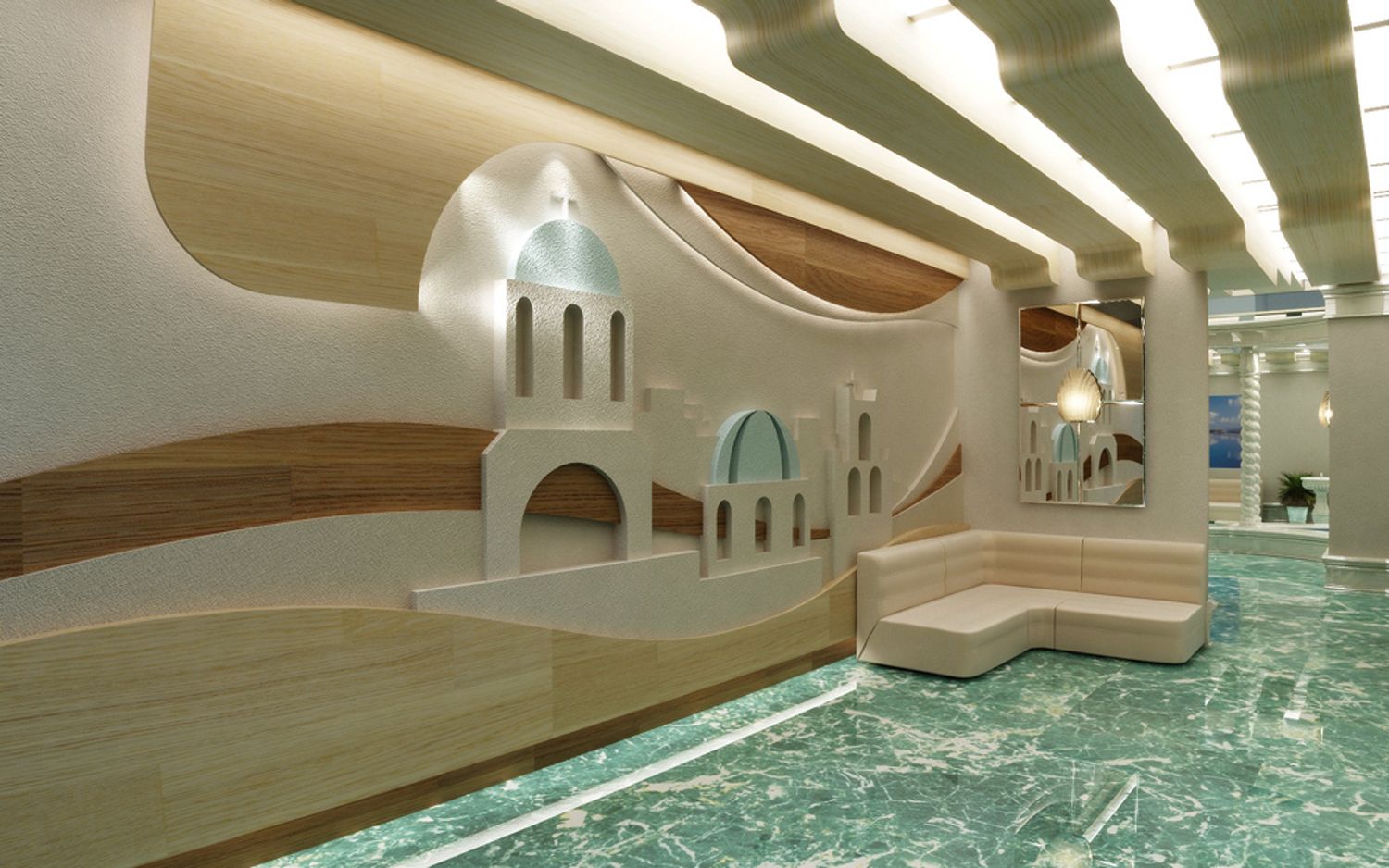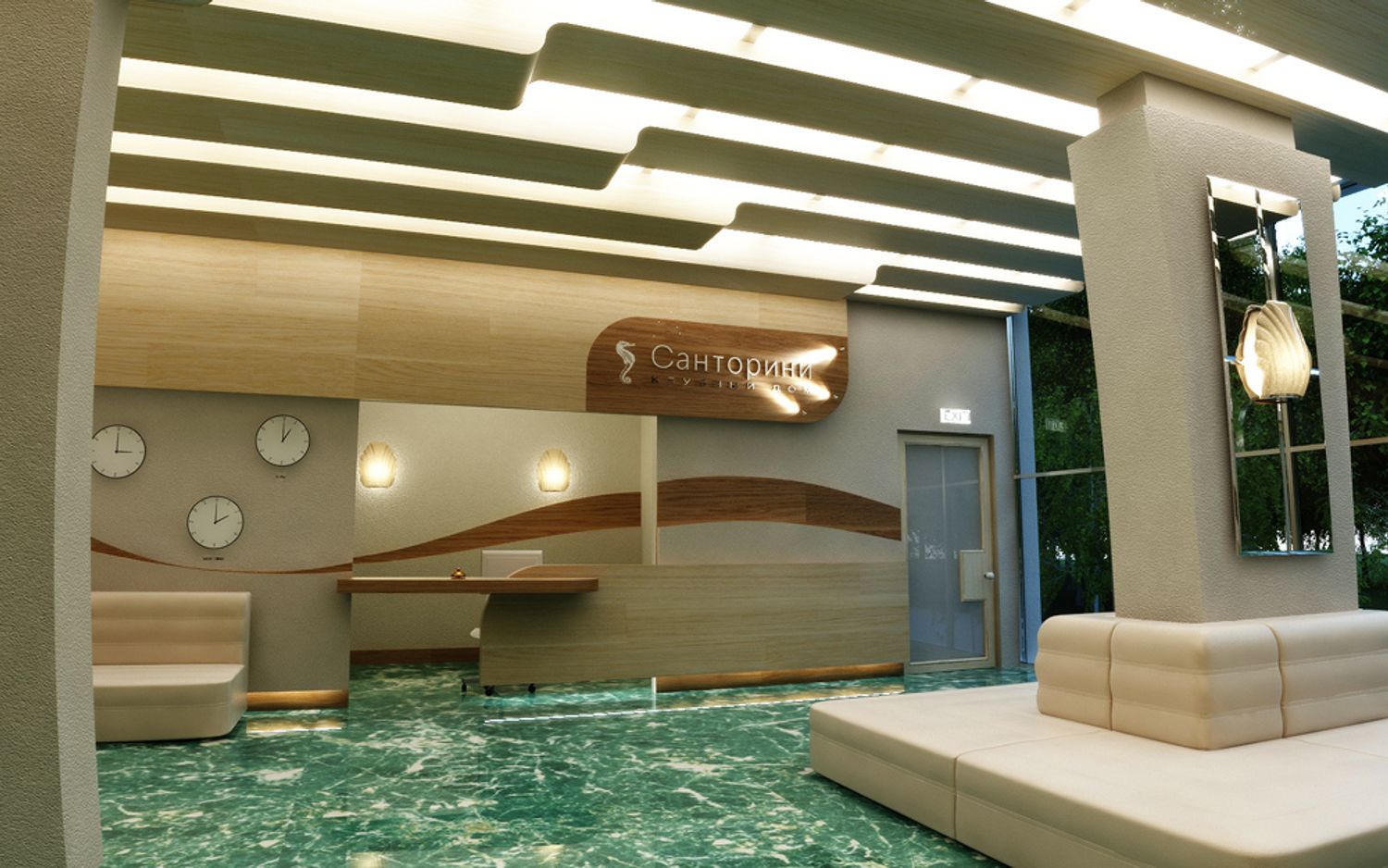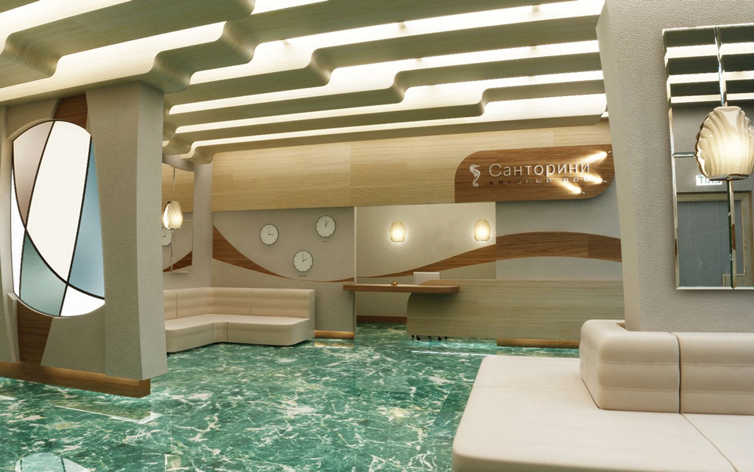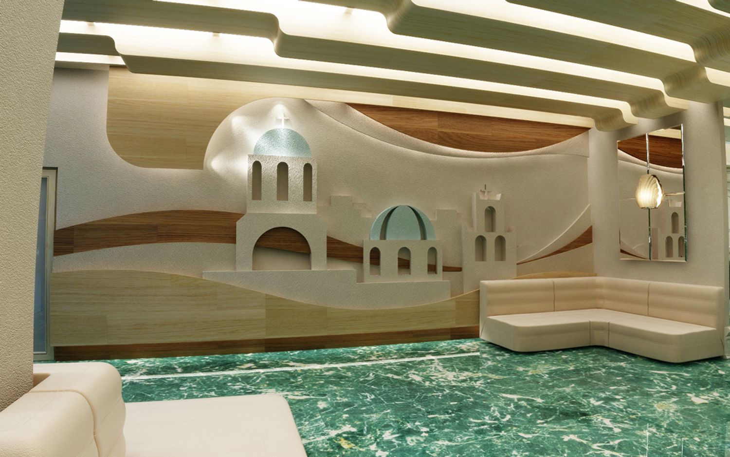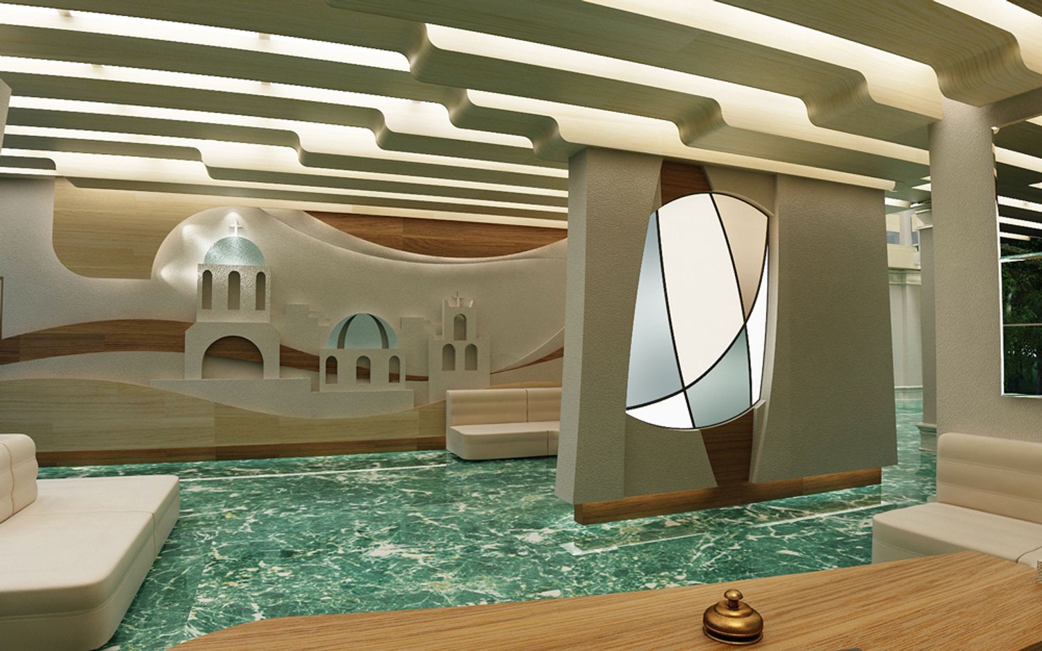 The interior design is made in the style of the Greek island of Santorini, with a recognizable view on one of the walls of the hall. The blue marble on the floor is perceived as the sea surrounding the island.