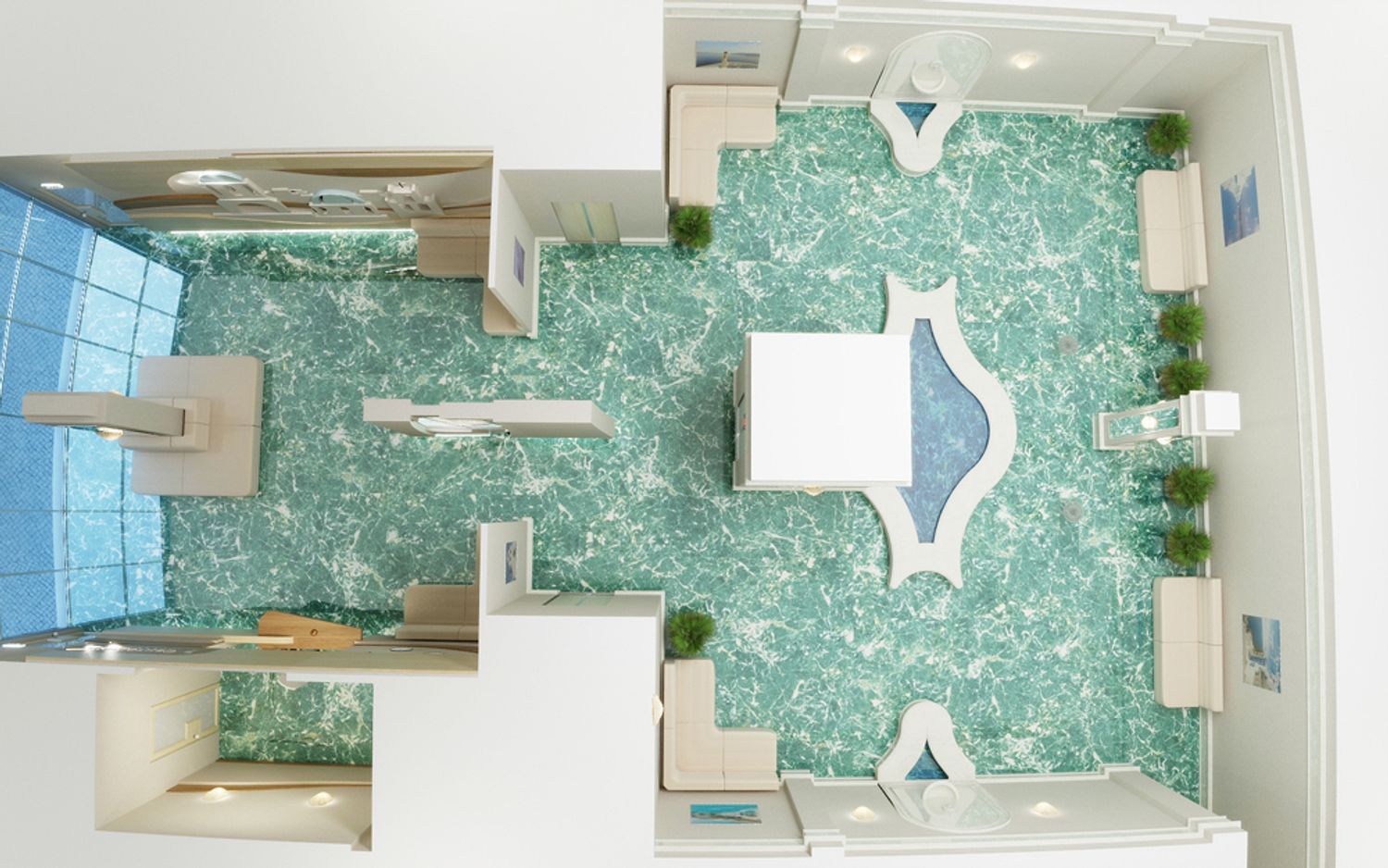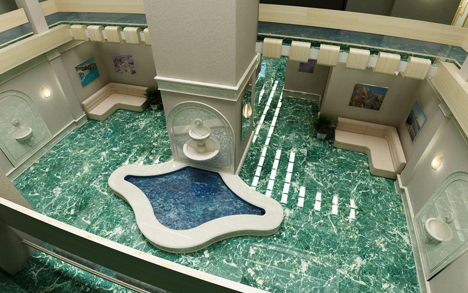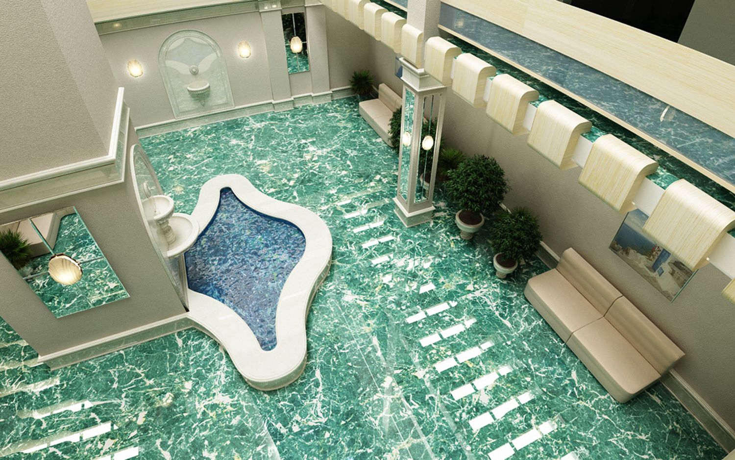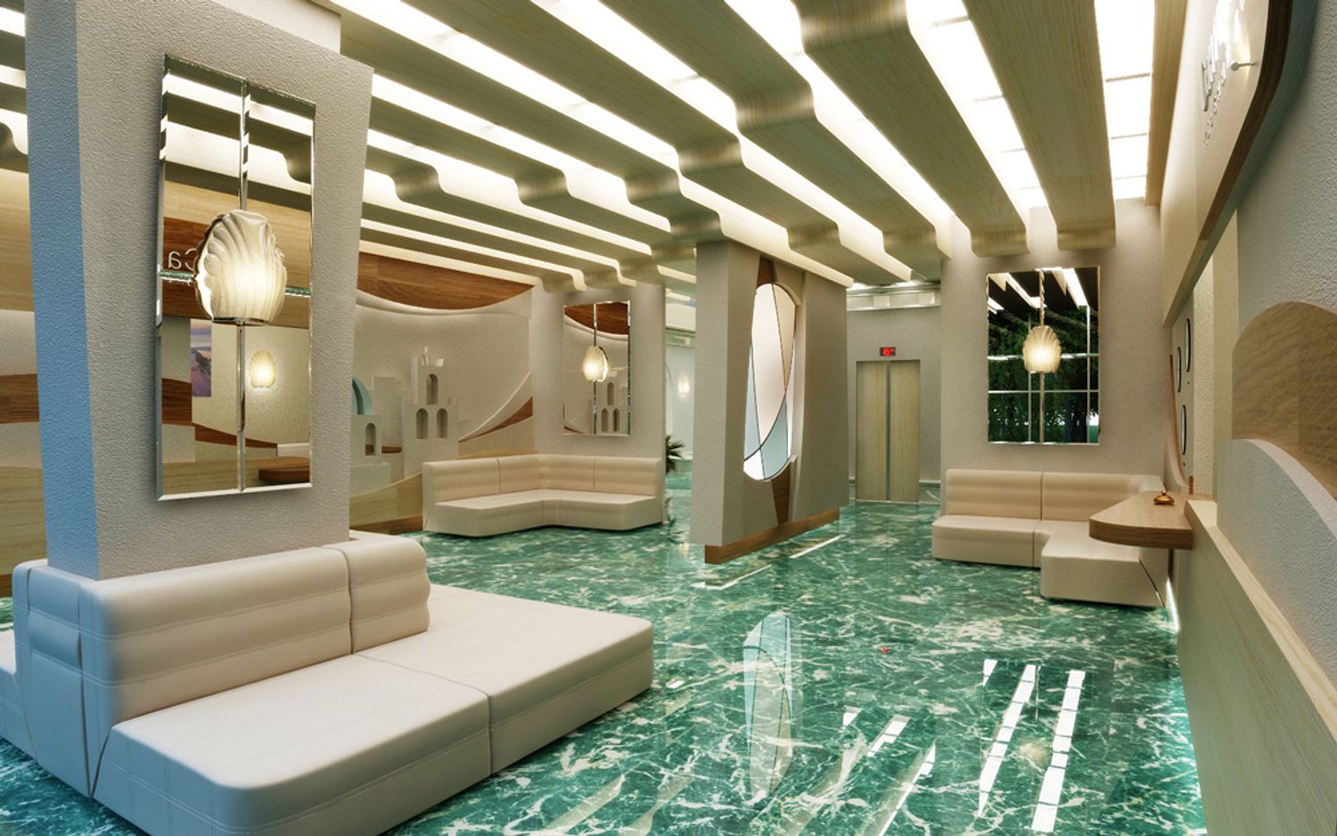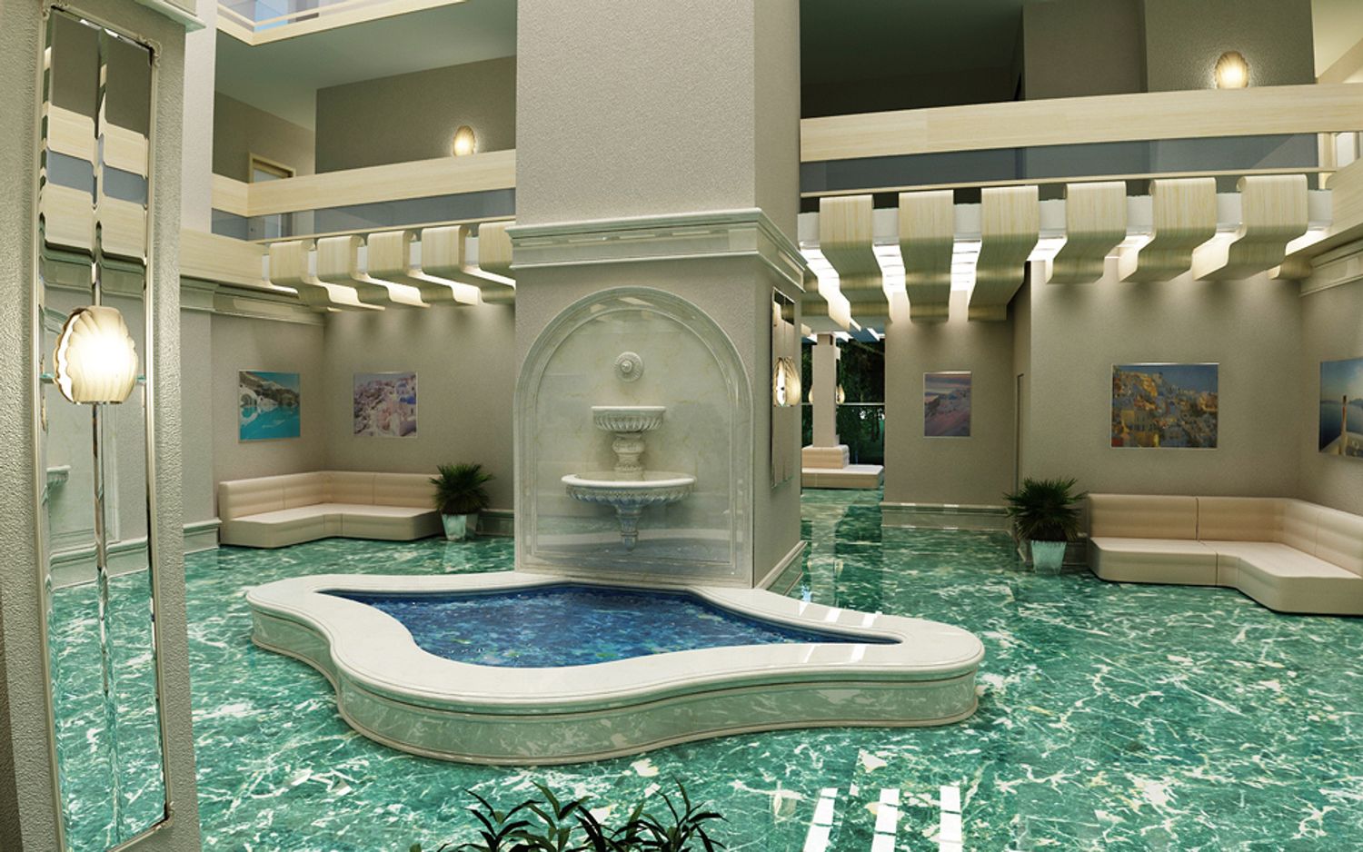 The interior design is made in the style of the Greek island of Santorini, with a recognizable view on one of the walls of the hall. The blue marble on the floor is perceived as the sea surrounding the island.