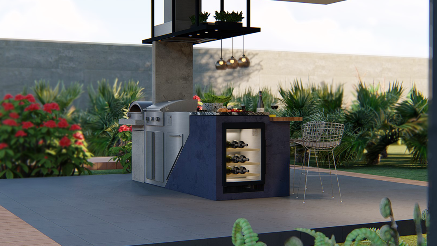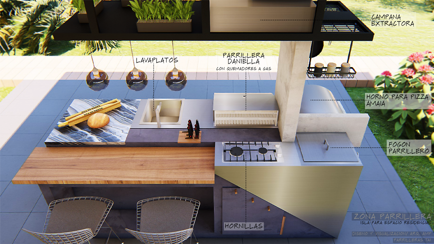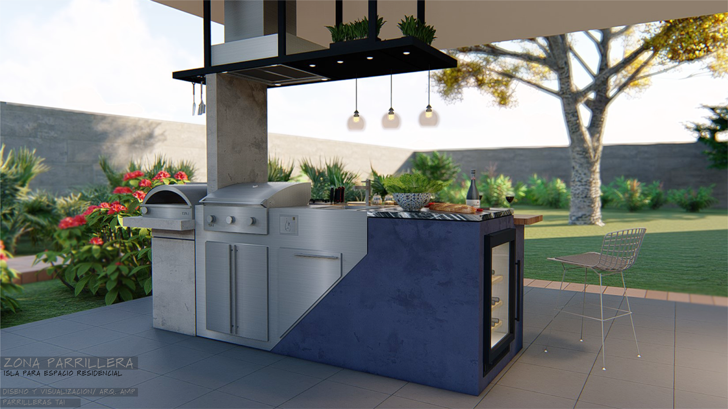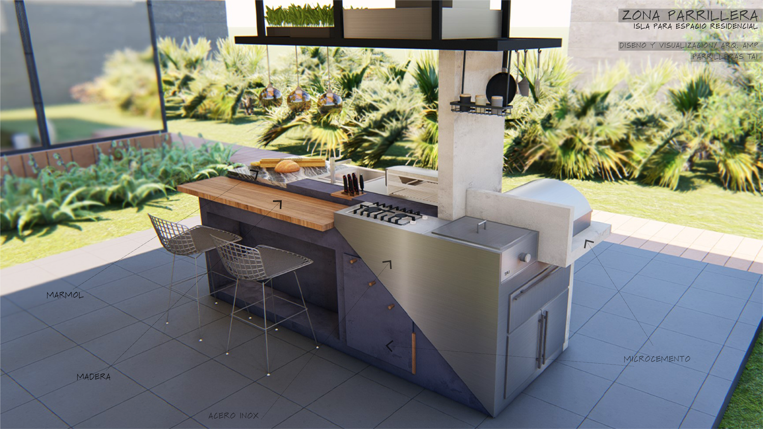 This BBQ Island is designed for a residential outdoor area, that blends aesthetically the industrial finish of the stainless steel equipment, with the rustic feel of the micro cement, perfect for a tropical space. It includes a diversity of cooking pieces of equipment, tools, storage area, and cut and eating tops, in a minimum module.