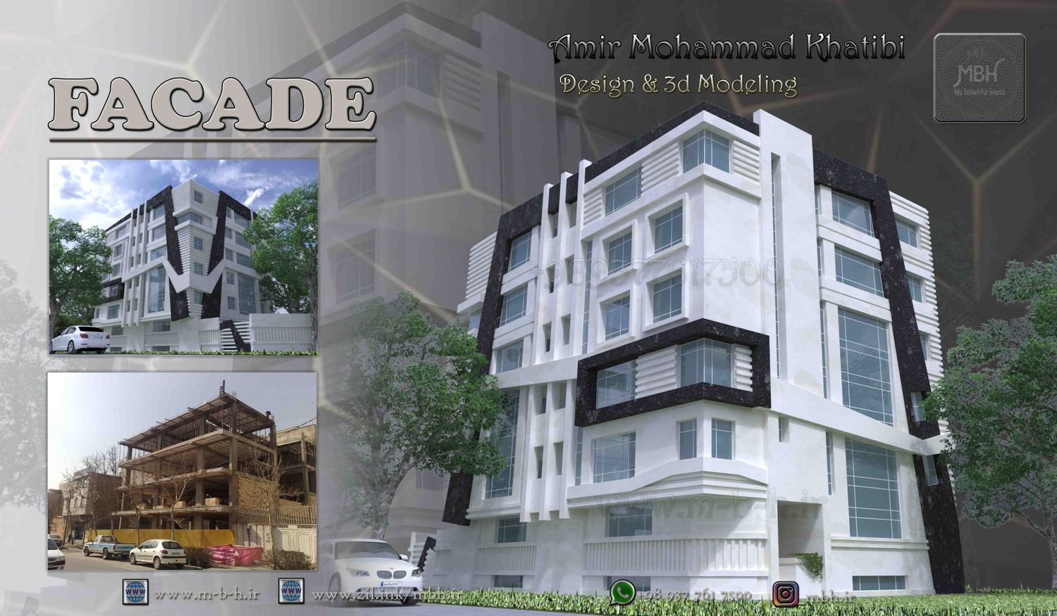 Architectural design and 3D rendering of the facade of an office complex in Tehran