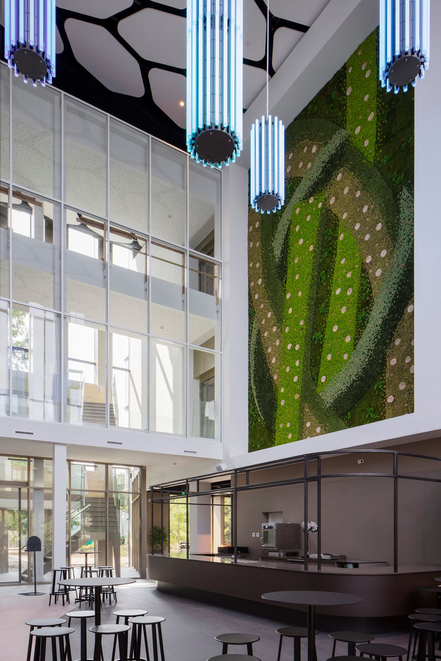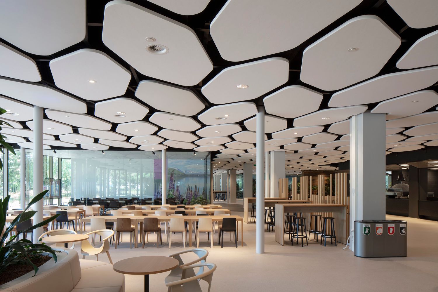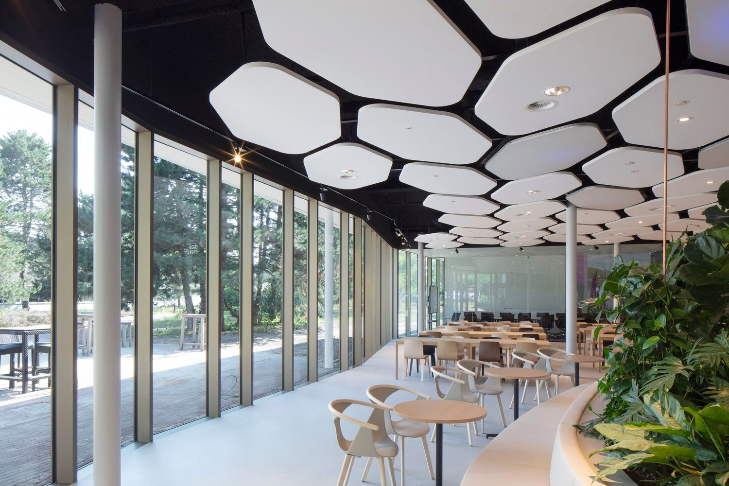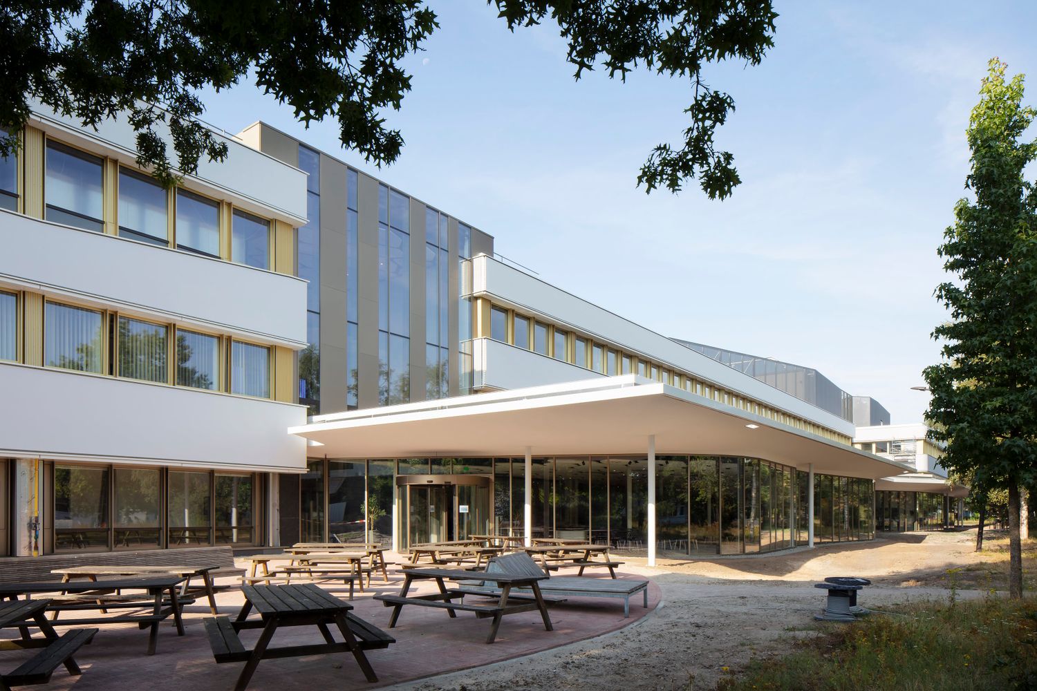 In addition to the transformation of the existing office buildings, a new volume was added. At ground level, a large central meeting and restaurant center was created, bordered on both sides by the green campus environment. The undulating facade of the new building is maximally transparent: the restaurant visually expands under the large canopies.