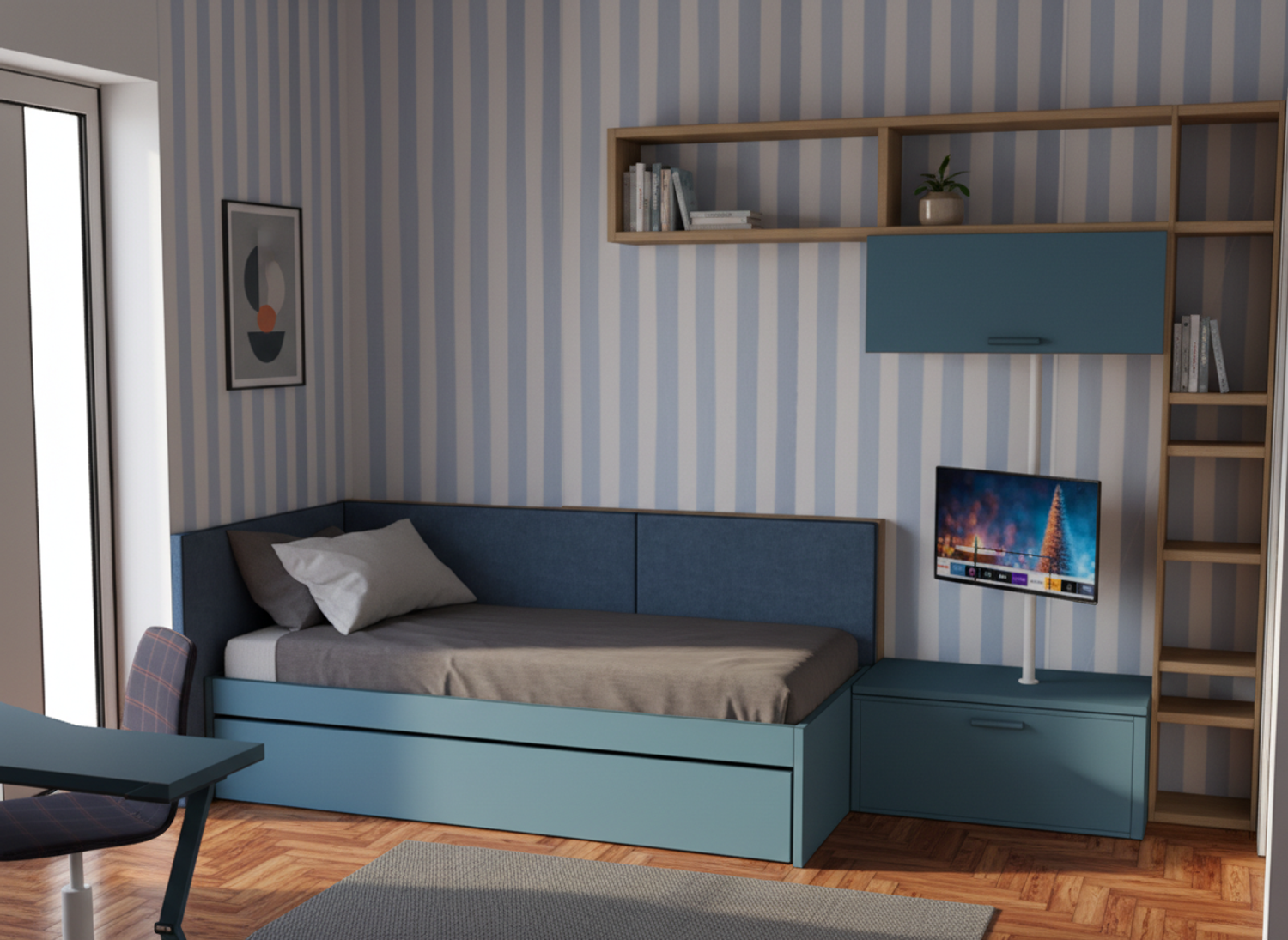 La scrivania è pensata come uno spazio dedicato allo studio, mentre la libreria contribuisce all’organizzazione e alla personalizzazione dell’ambiente.
