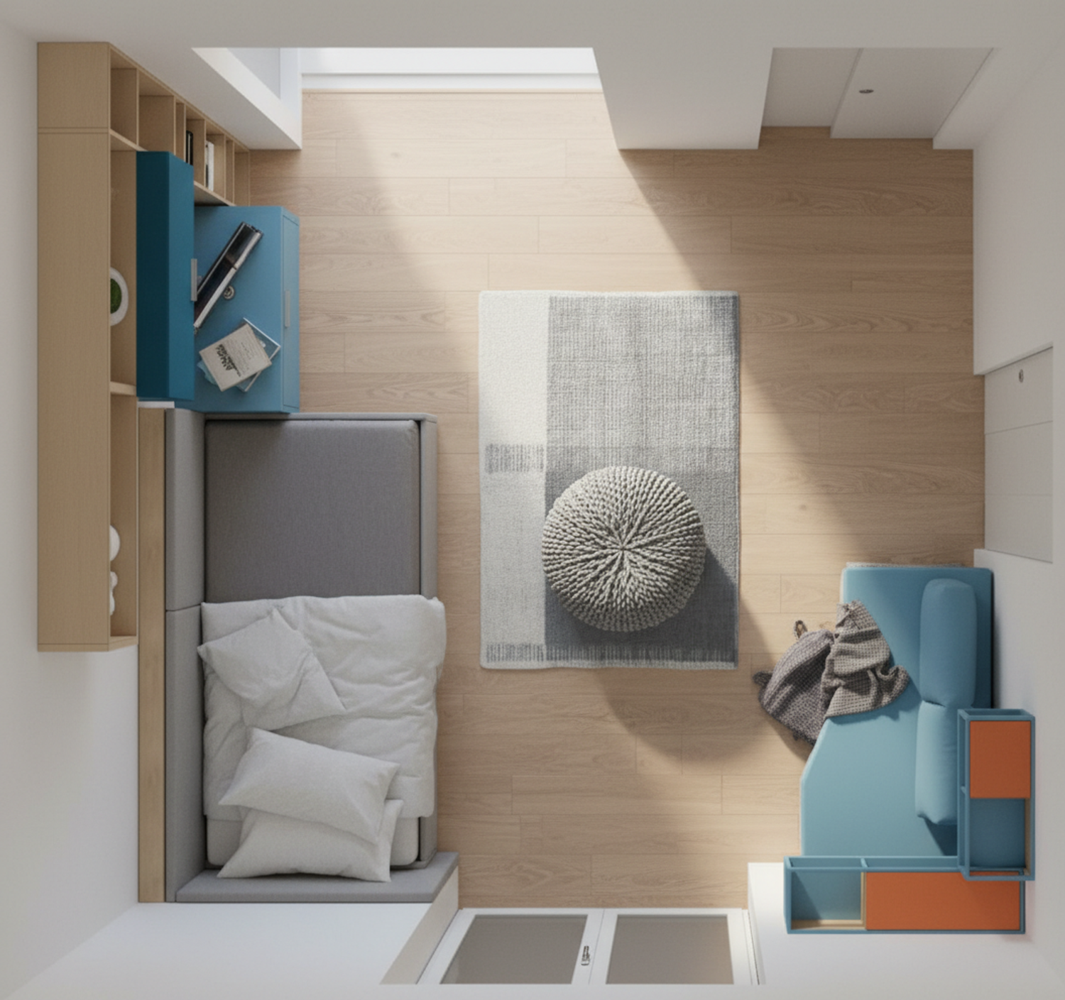 La disposizione degli arredi è studiata per garantire un equilibrio tra zona riposo, studio e tempo libero, favorendo