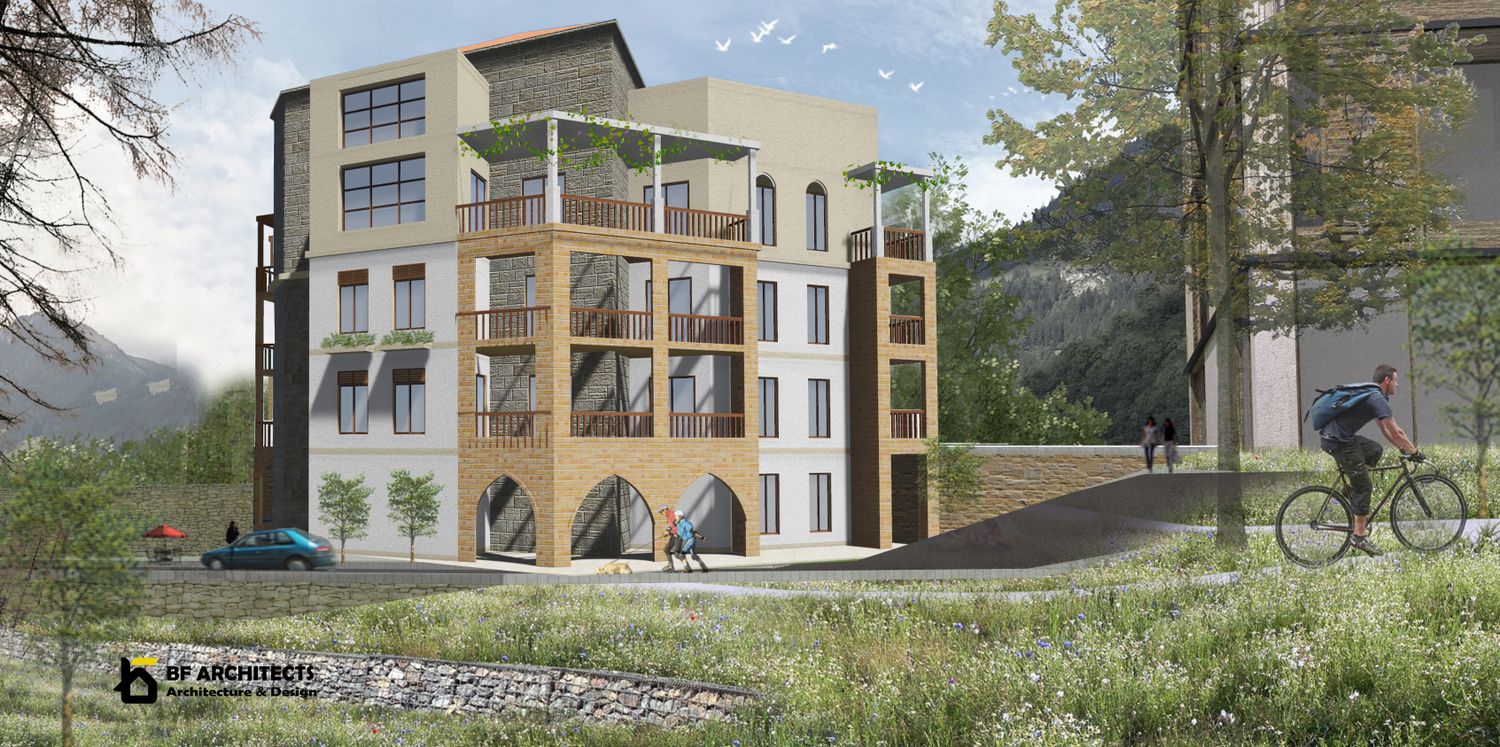 It ­follows the slope, yet still permits harmonious integration into the village community in a residential neighbourhood in Abadeye. The main entrance can be accessed via an open flight of stairs. Behind it, a two-story staircase unfolds.