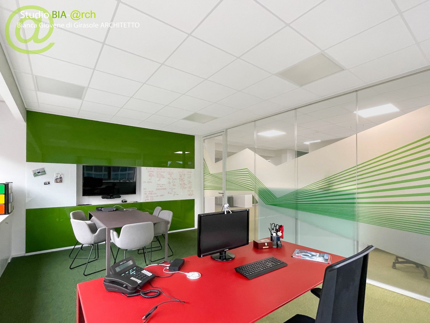 Sono state introdotte aree di brainstorming, phone booth, aree break e copy. Sono stati utilizzati materiali di ultima generazione fonoassorbenti, atossici e di rigenerazione dell’aria. L’uso del colore rende lo spazio incline alla creatività, gli spazi informali di collaborazione stimolano il lavoro di gruppo.