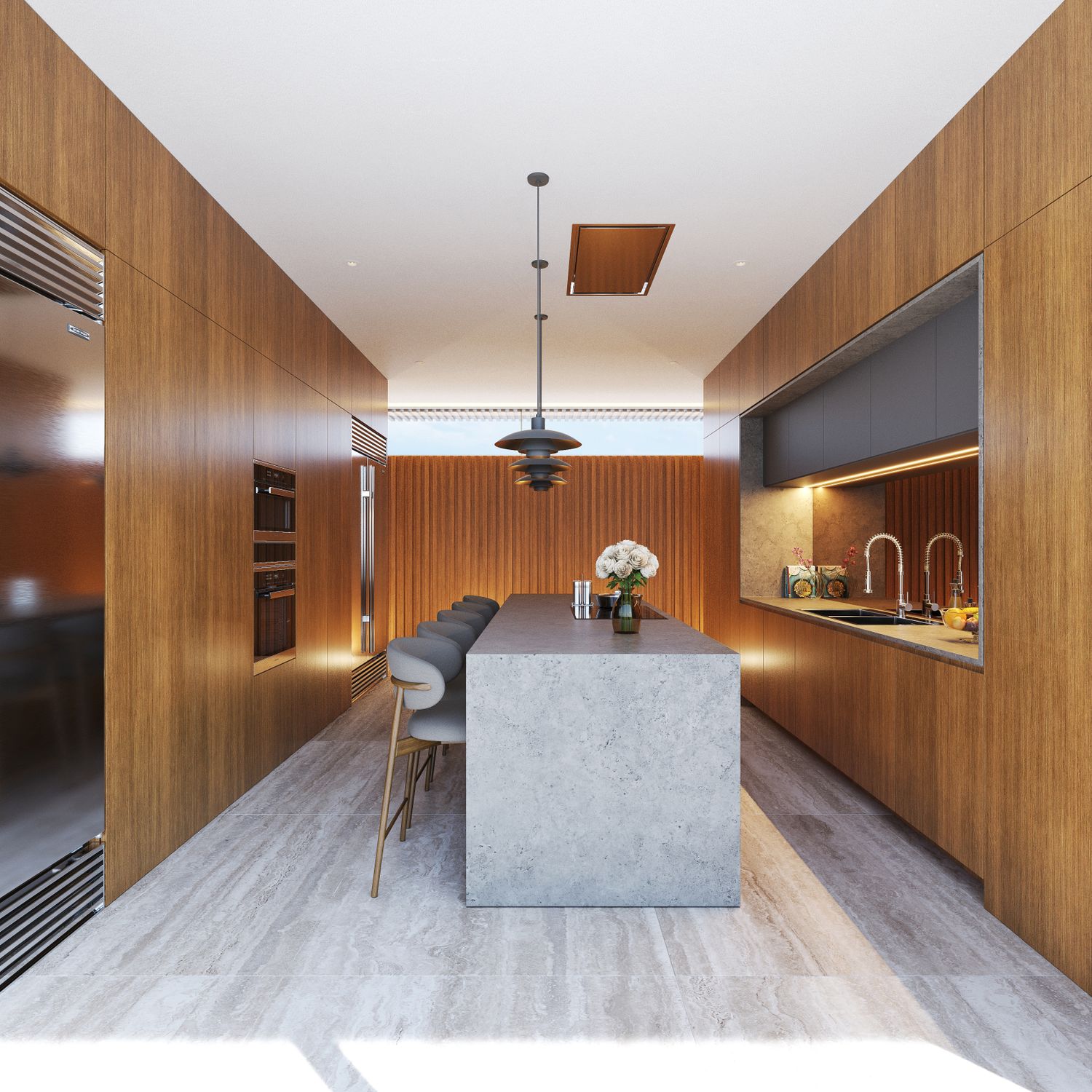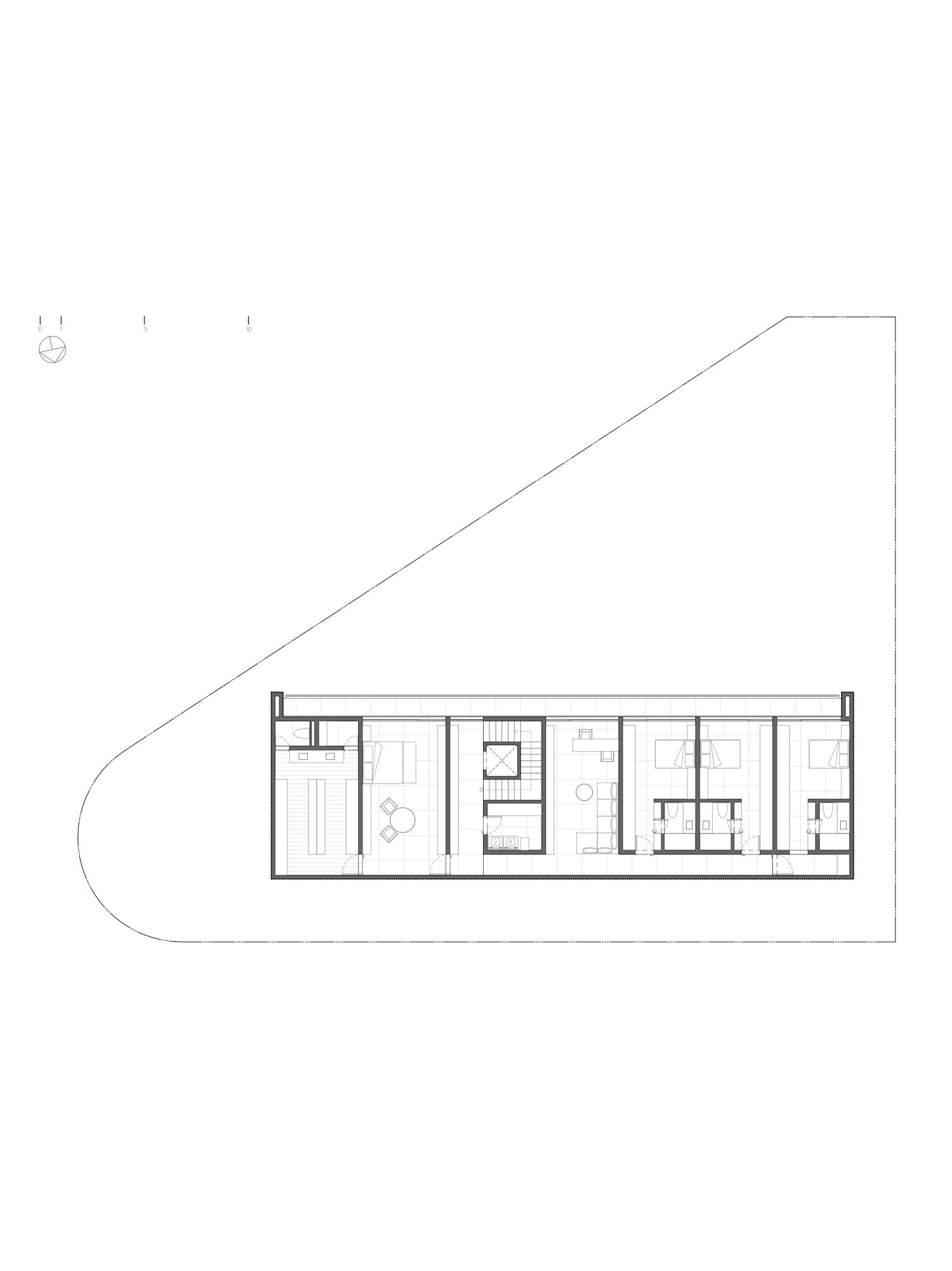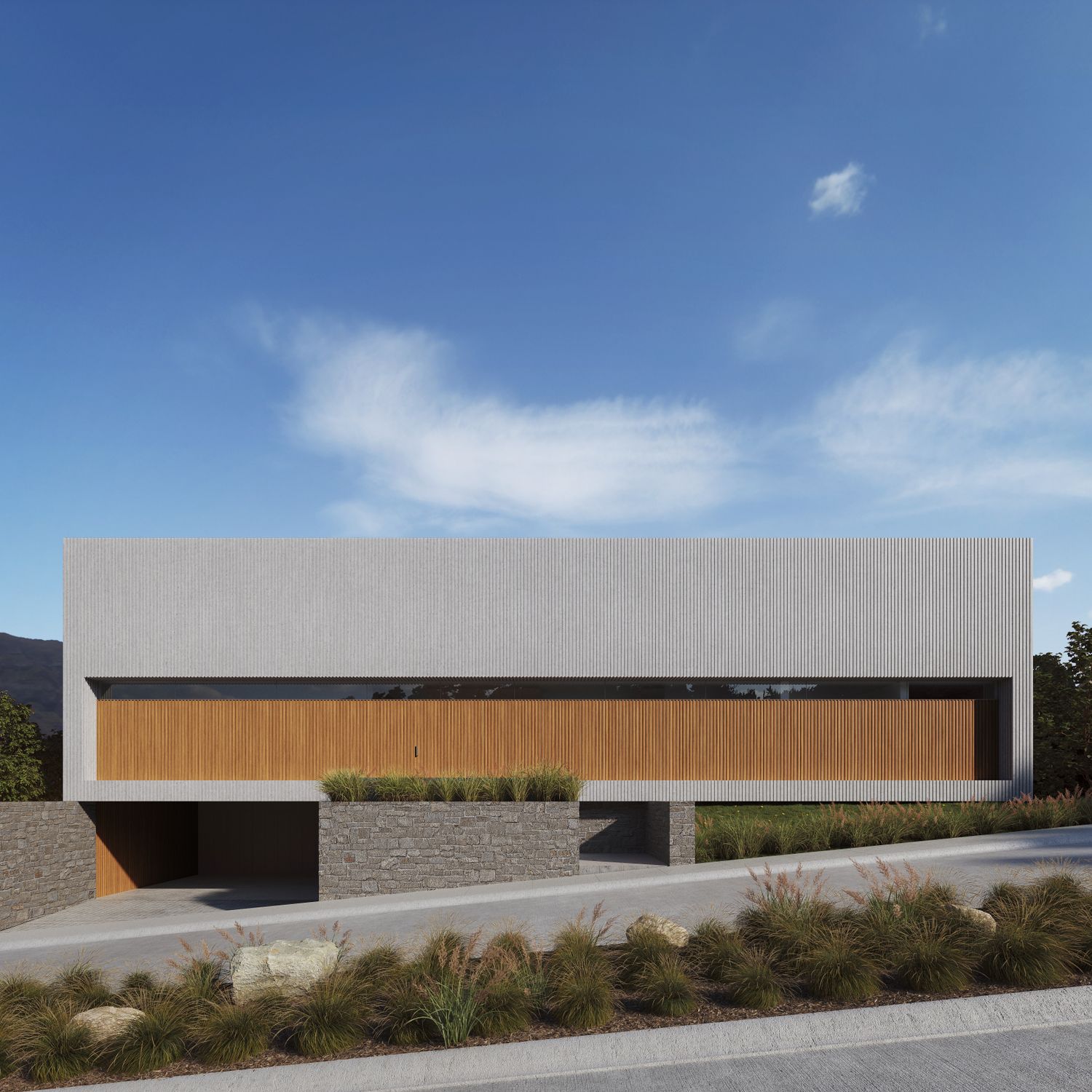 The project is a slim concrete block that hosts the social and private areas of the house, with a basement finished in stone, and every space on the house enjoys incredible sights of the mountains thanks to the house's floor to ceiling windows on the posterior facade.