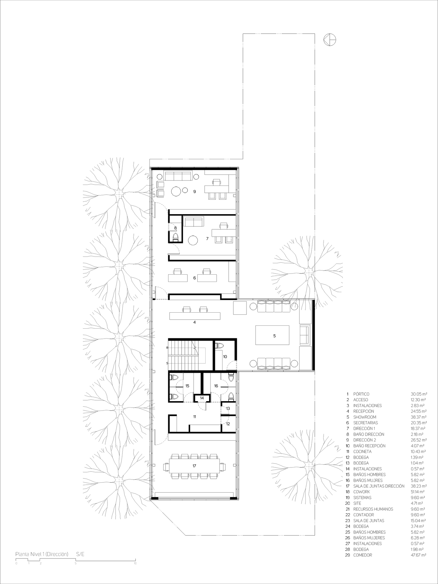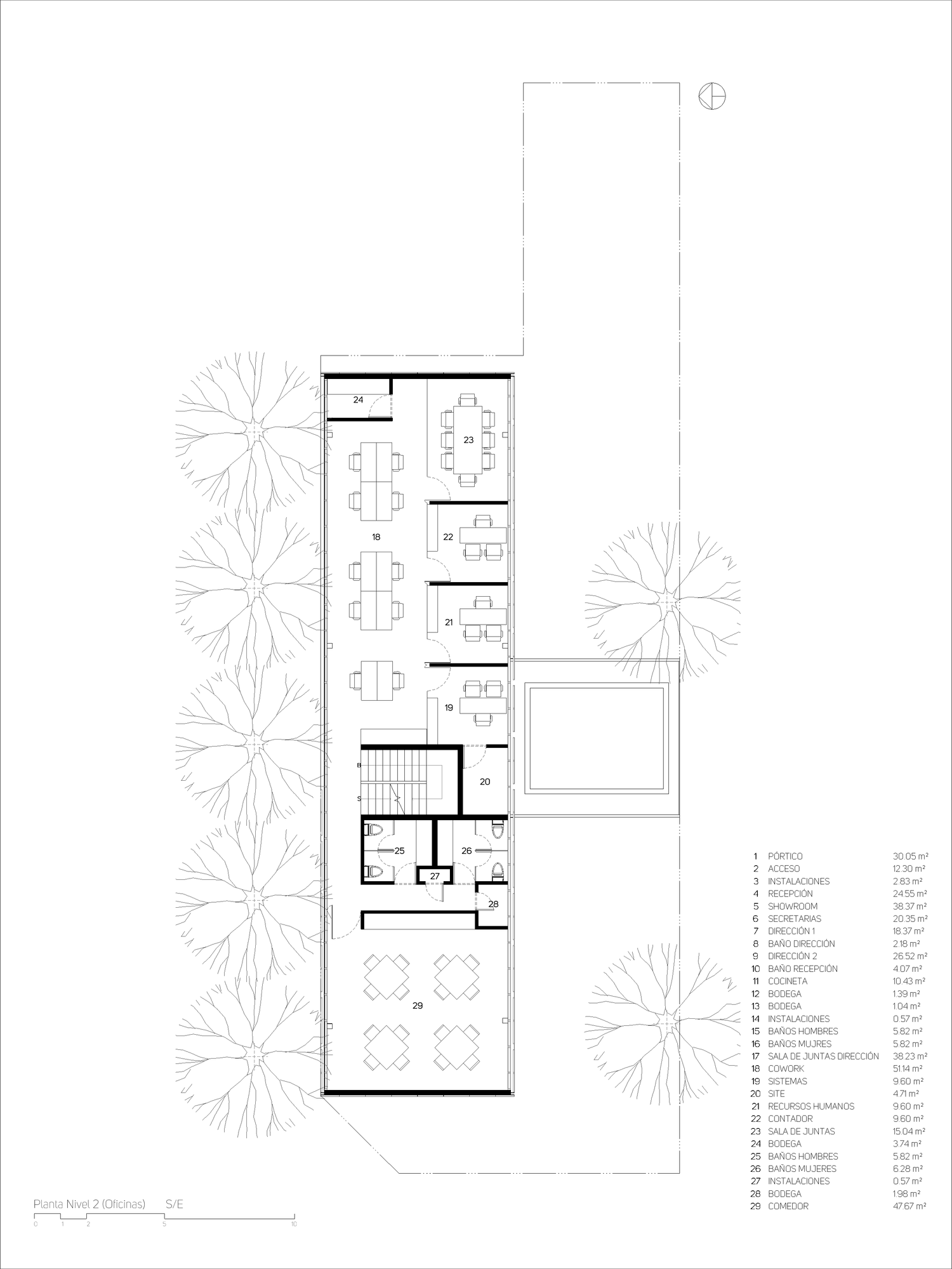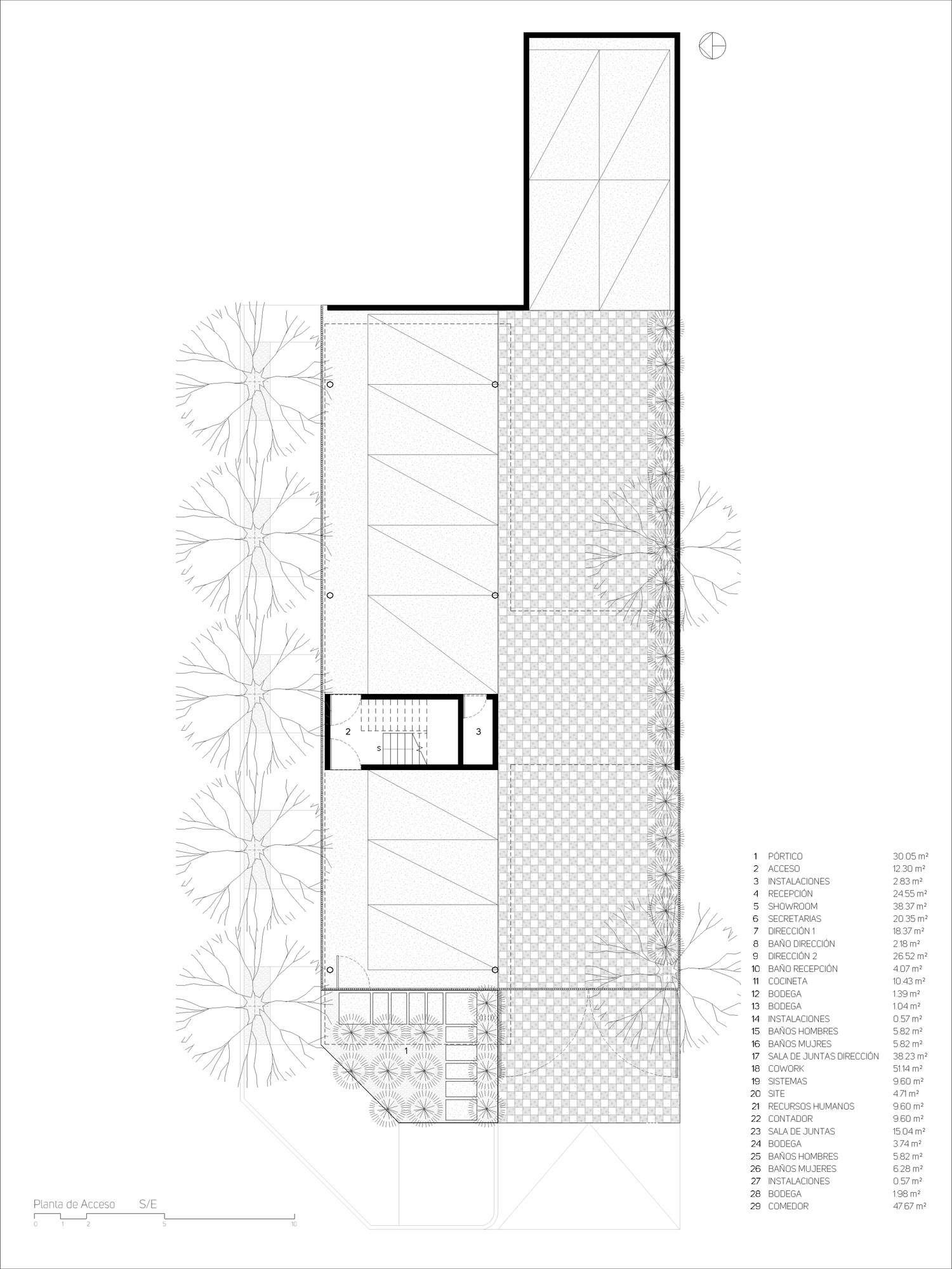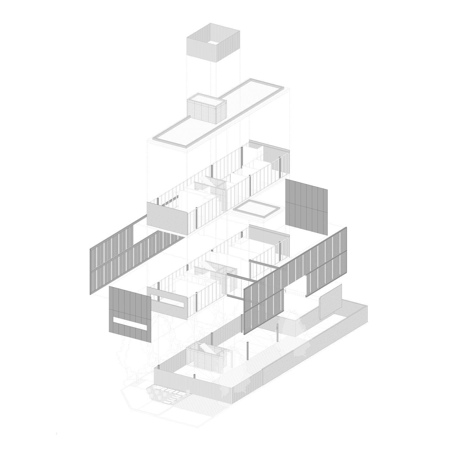 The project is developed on 3 levels. Each one with a different use. The ground level is a green parking lot, which integrates vegetation in order to work as a “patio” for the upper levels.