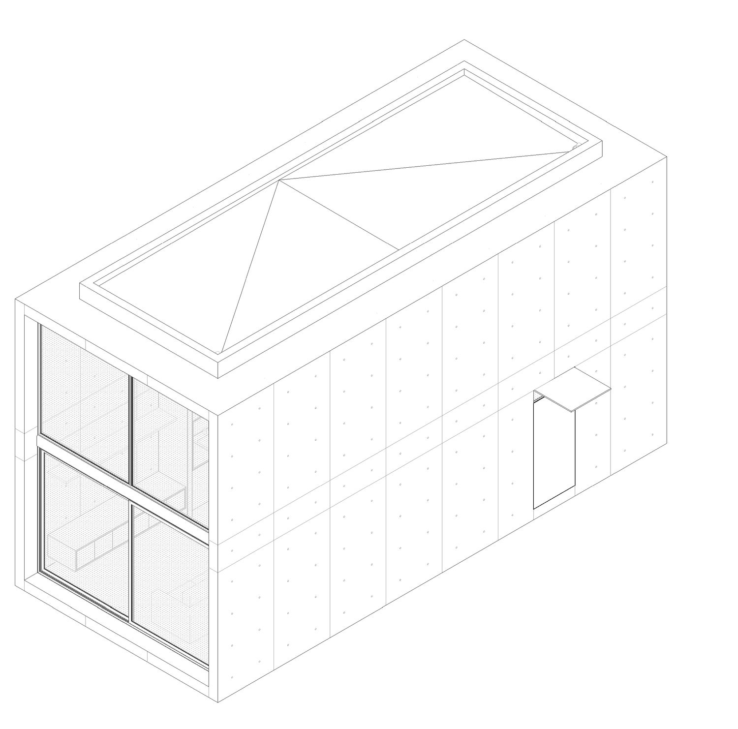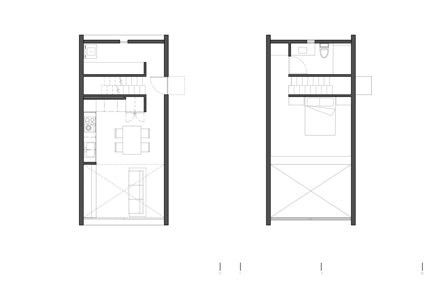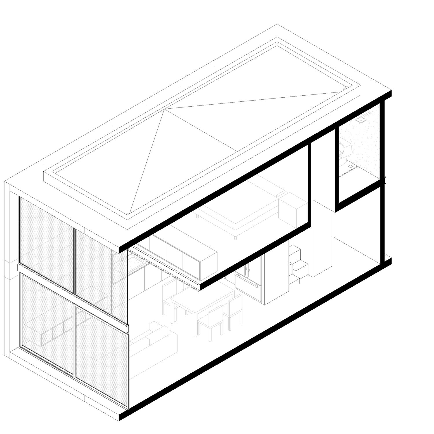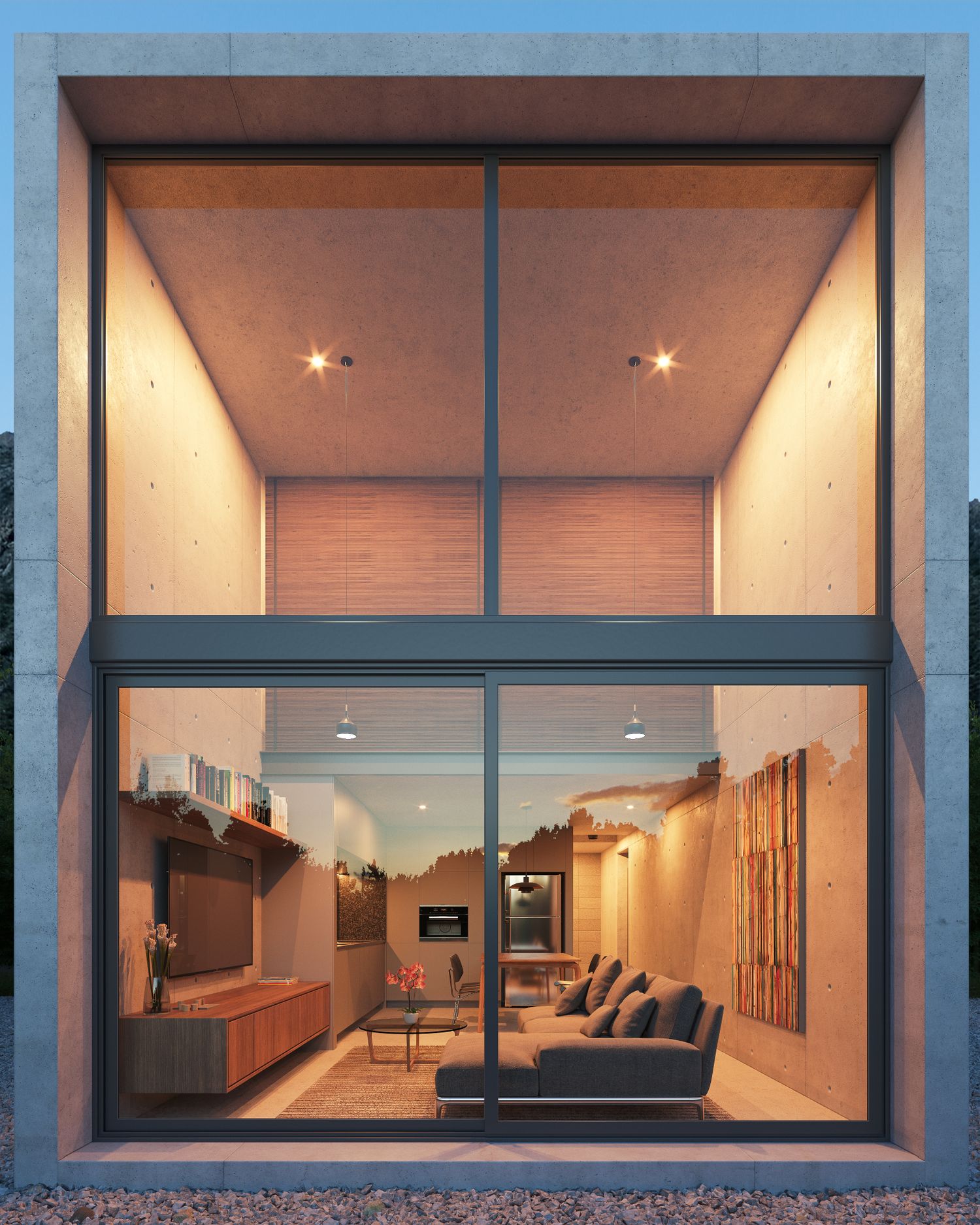 We proposed a concrete box, containing a kitchen, dining, living room, and laundry on the first level; and a mezzanine with the master bedroom and bathroom.