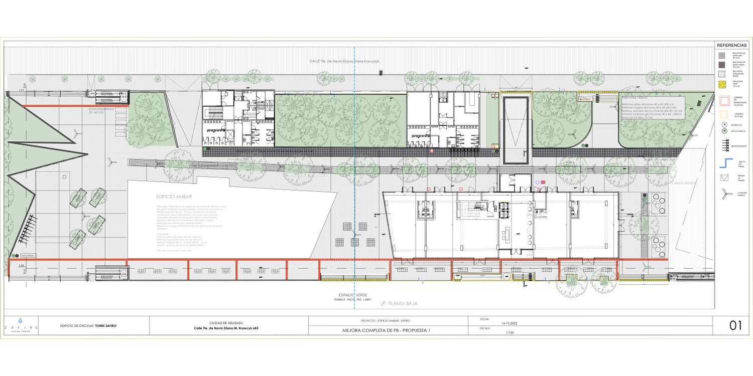 This is a 64583.46ft² building for comercial use. It provides eight floors of large offices. Each floor develops 4 sanitary nuclei and work spaces of 5672.581ft². The building is located on the Limay river coast and provides a gas and electric thermomechanical system. In winter with the low temperatures of Argentine Patagonia, the boilers located in a technical plant on the ninth floor use gas to heat the water that reaches the fan coils located on all floors, while in summer electric chillers are used to its cooling.