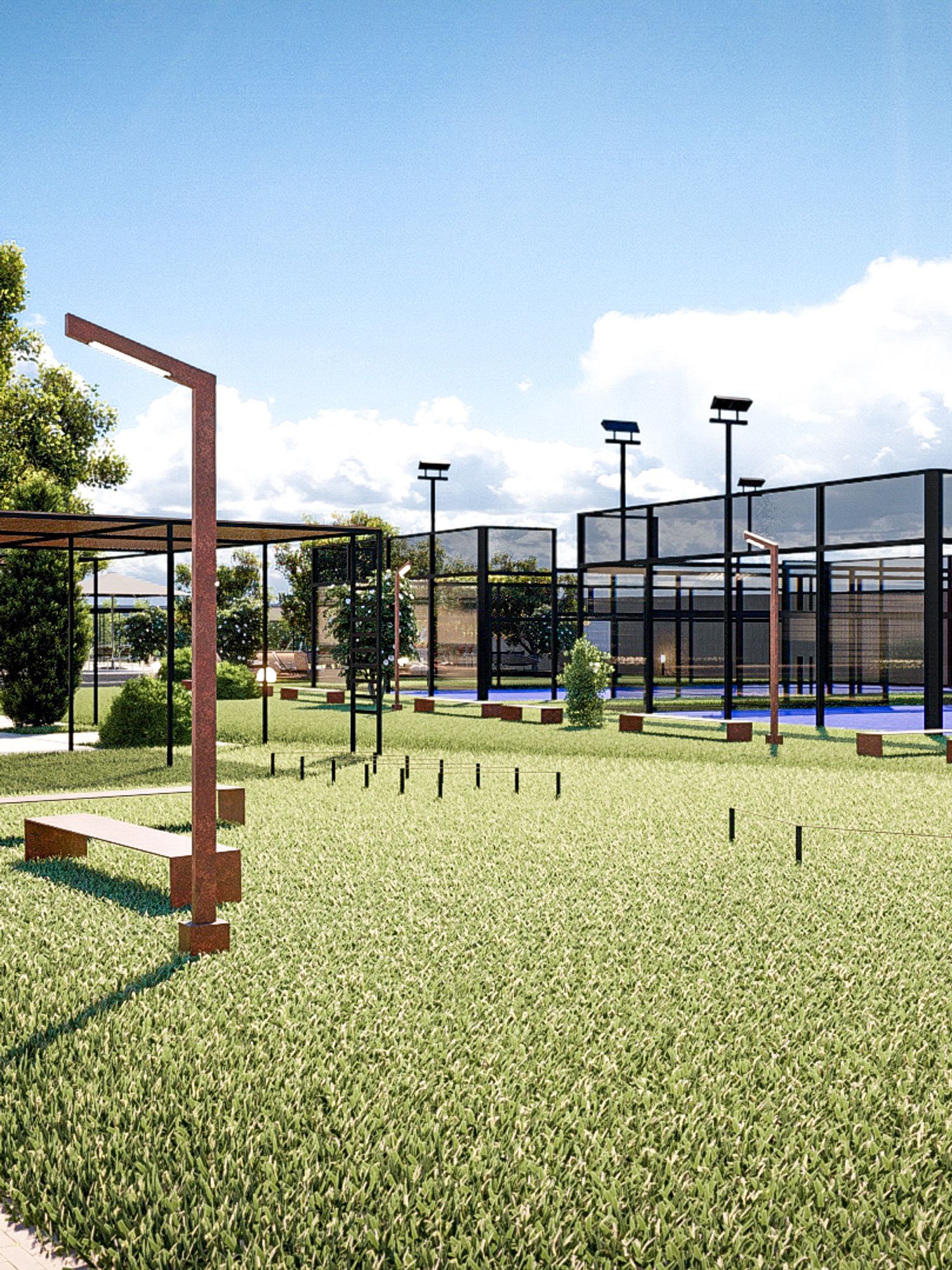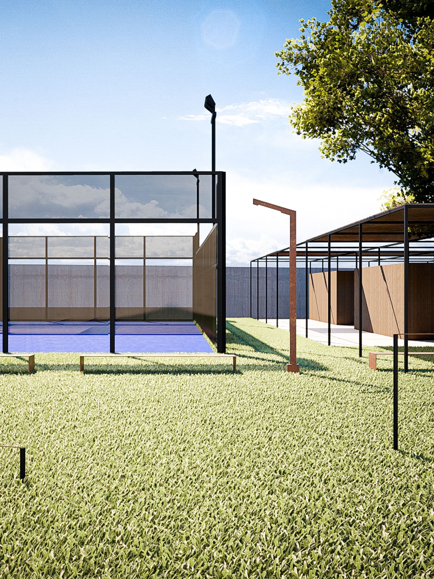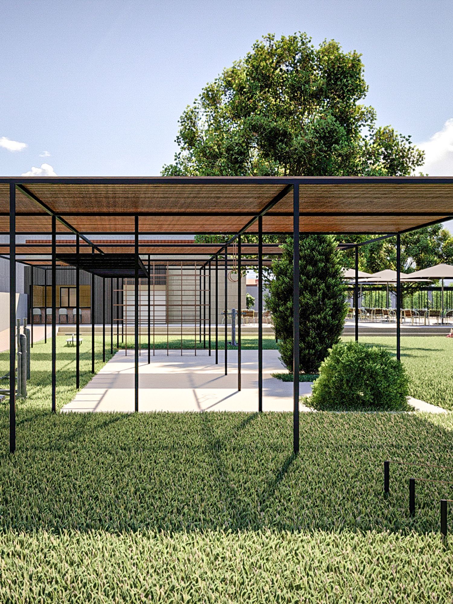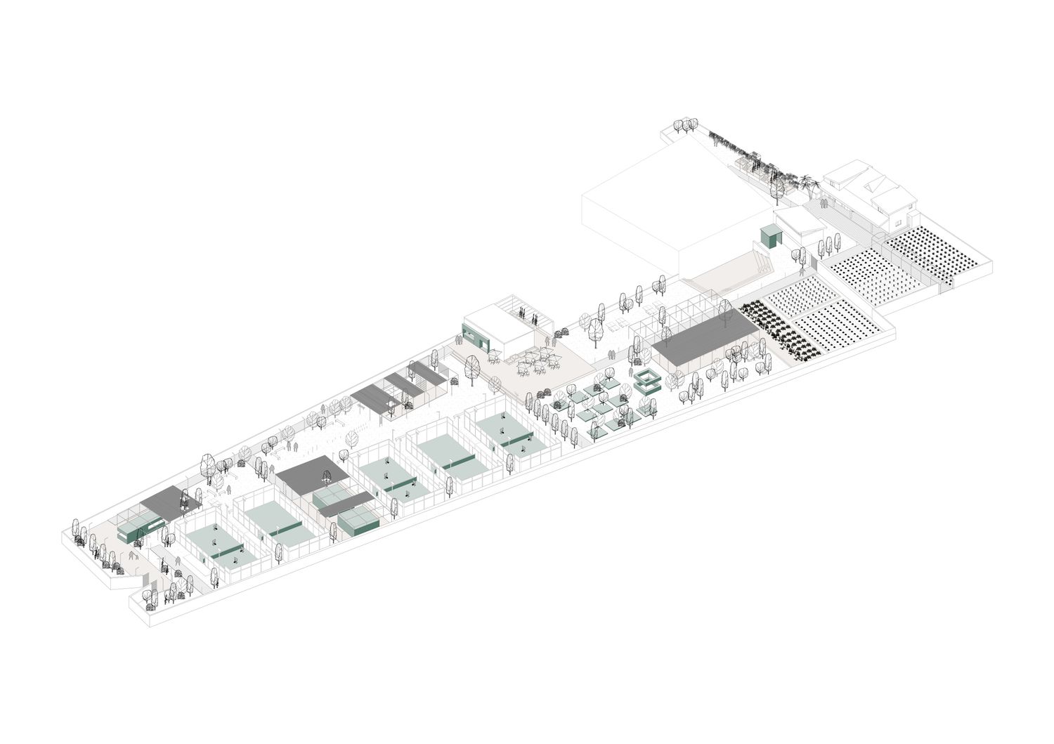 Si è tenuto conto della vocazione agricola del contesto pertanto sono sono state integrate zone dedicate alla coltivazione e zone dedicate allo sport, coesistendo all'interno della stessa area. Il punto ristoro nasce a partire da un rudere pre-esistente.