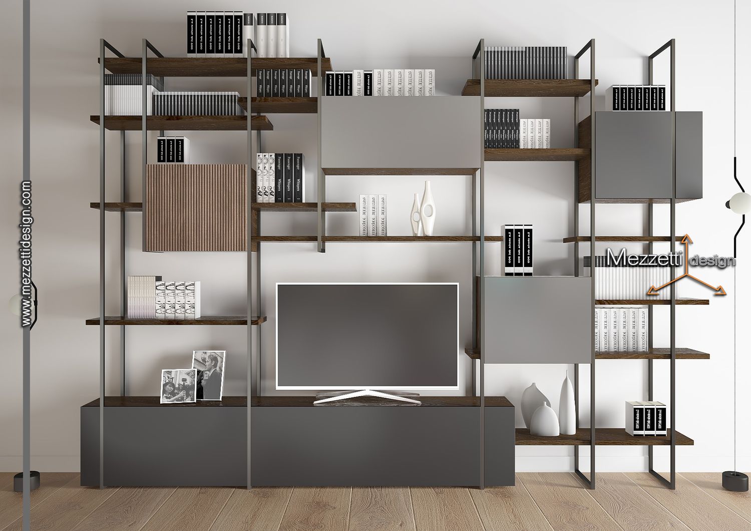 Libreria tv, realizzata con montanti in metallo a sezione quadrata, ripiani in legno, essenza rovere tabacco, e contenitori in legno laccato satinato. Design Daniele Mezzetti. www.mezzettidesign.com
