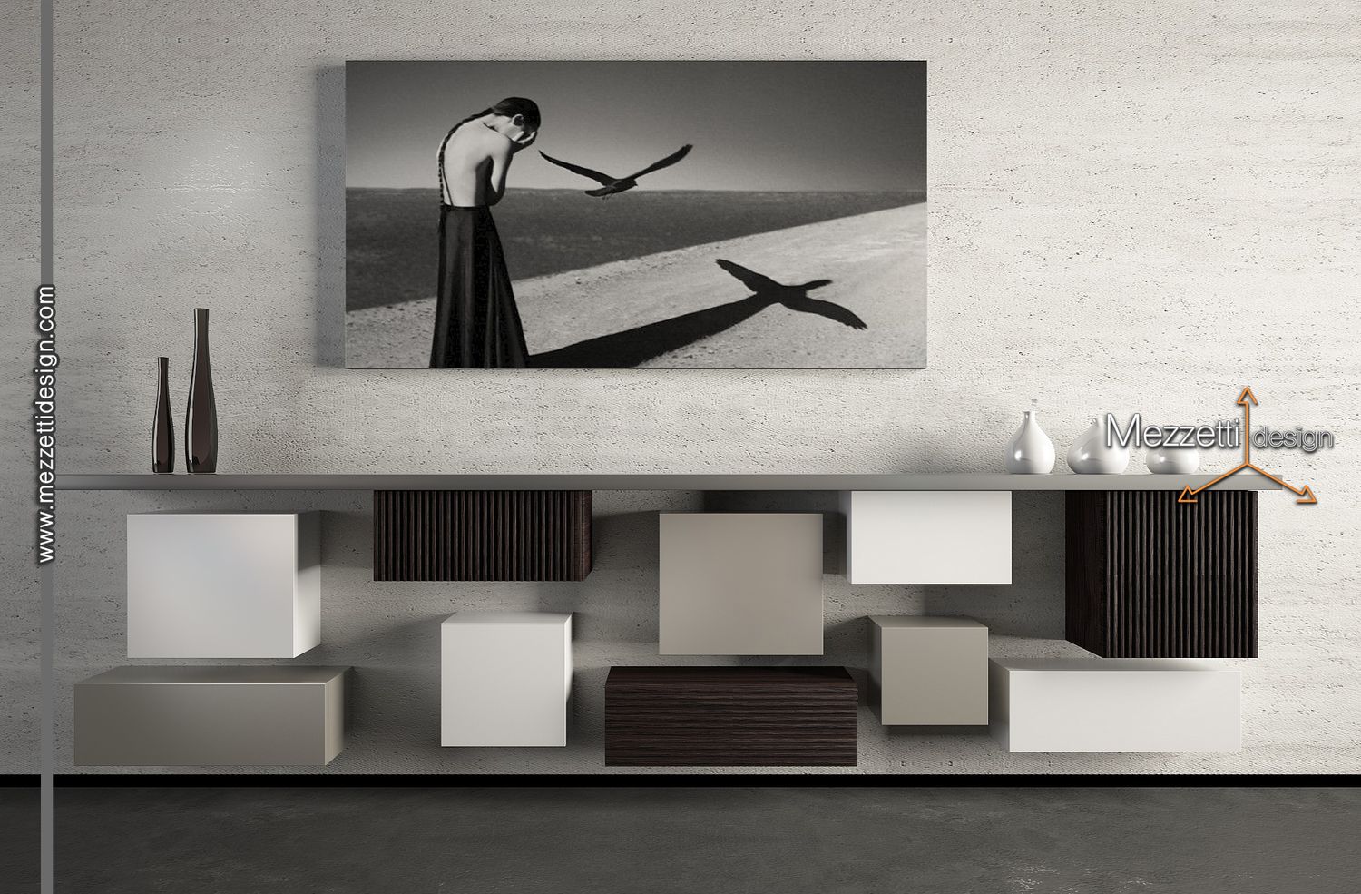 Parete attrezzata composta da vari contenitori in legno di differente finitura, colore e dimensione. Una mensola in alto completa la composizione. Design di Daniele Mezzetti, interior e furniture designer, www.mezzettidesign.com