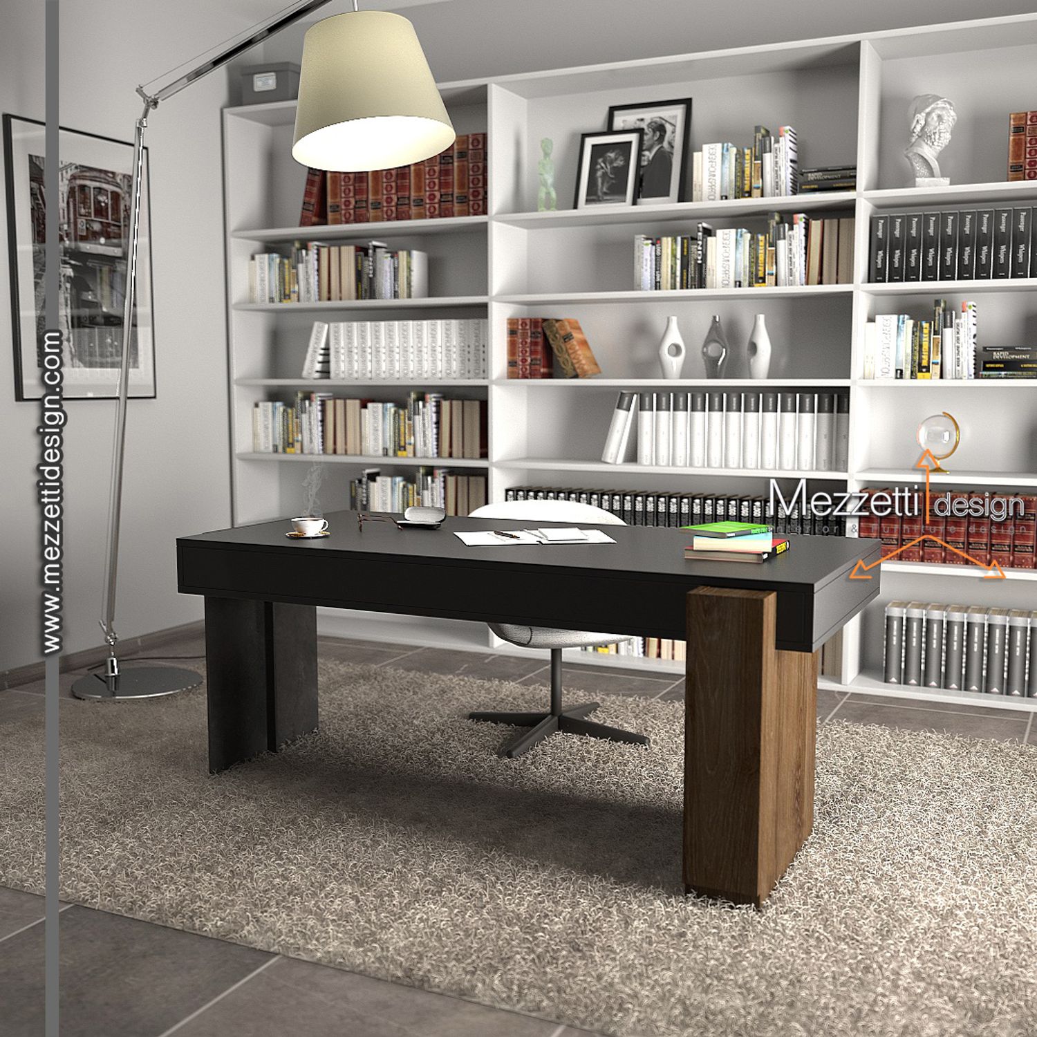 Progetto di una scrivania, piano in legno laccato nero, con cassetti sotto piano. Gamba sinistra in lamiera di ferro naturale, gamba destra in legno essenza noce che contiene 4 cassetti. Design di Daniele Mezzetti www.mezzettidesign.com