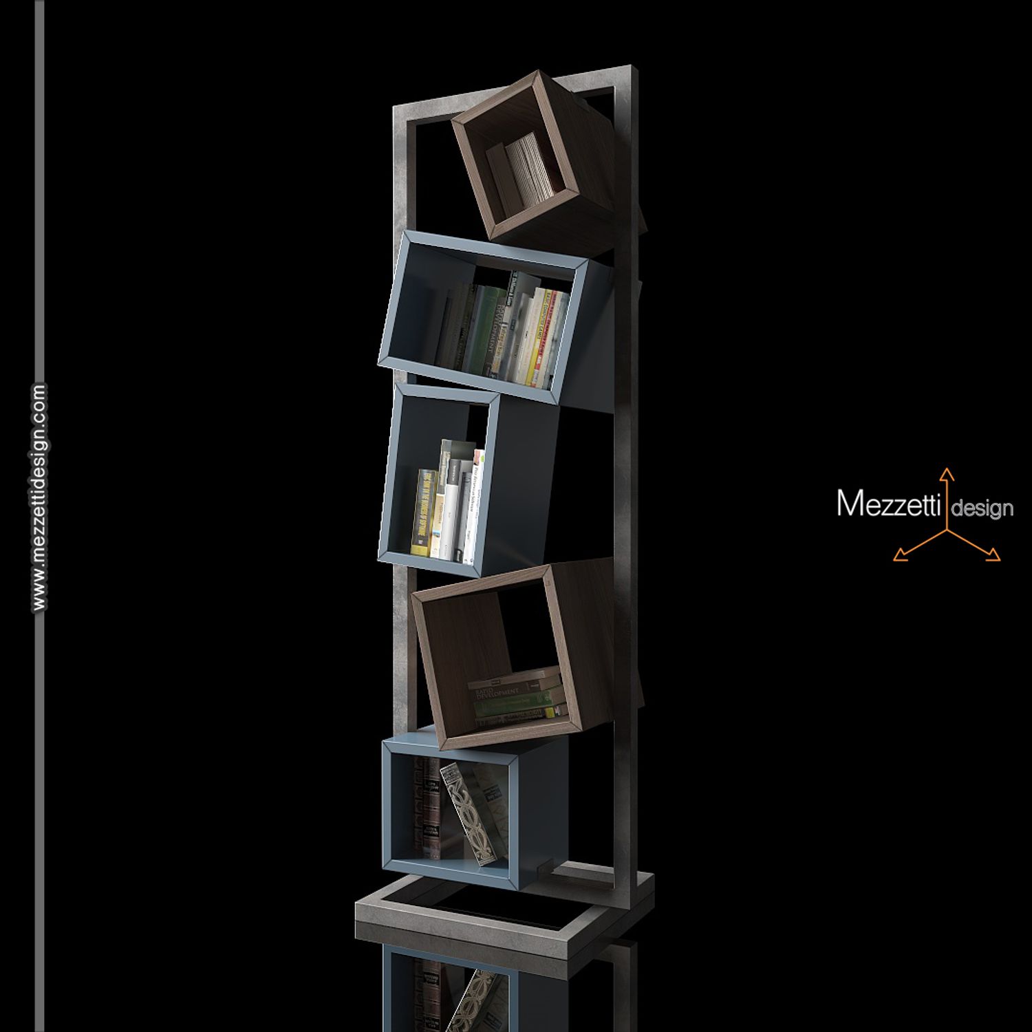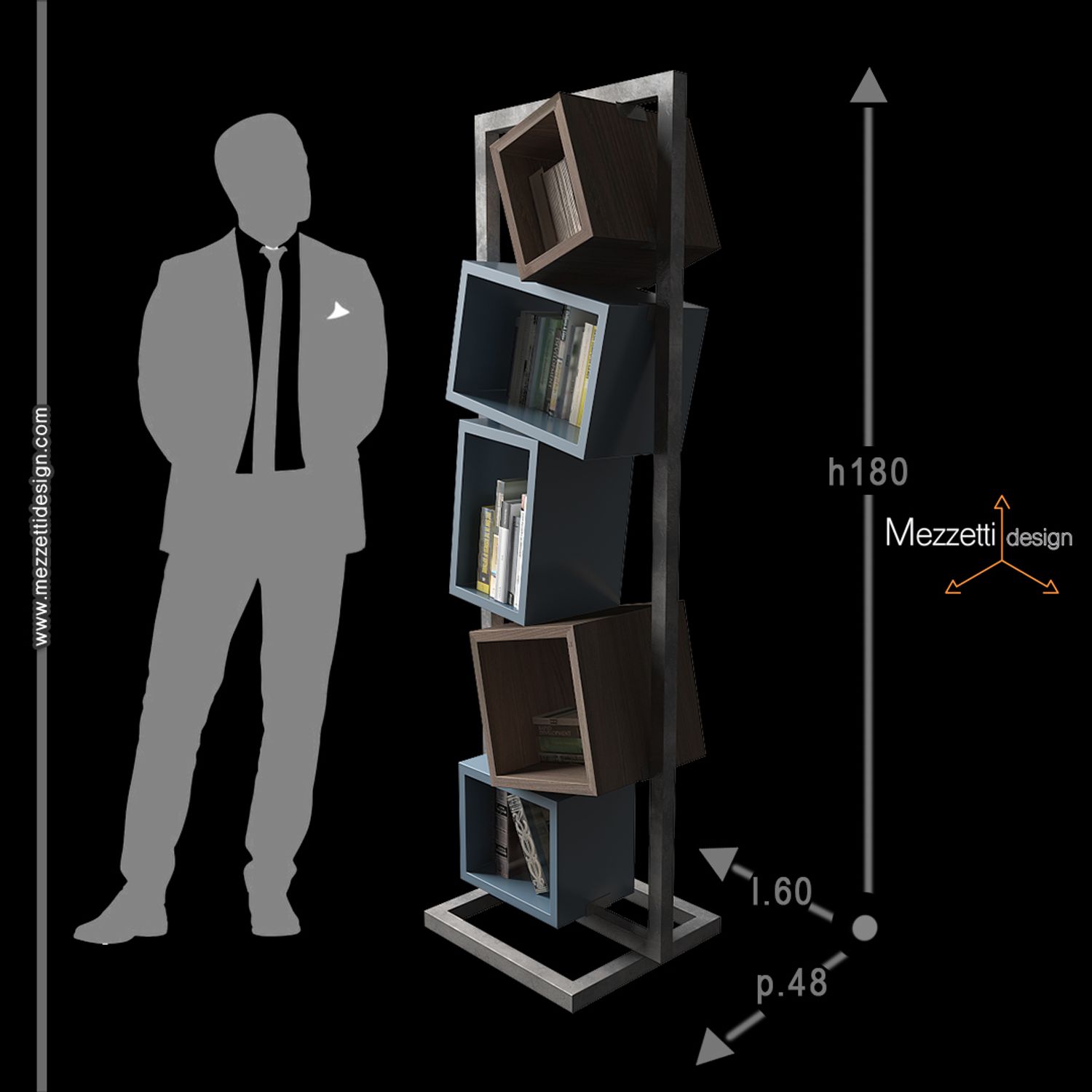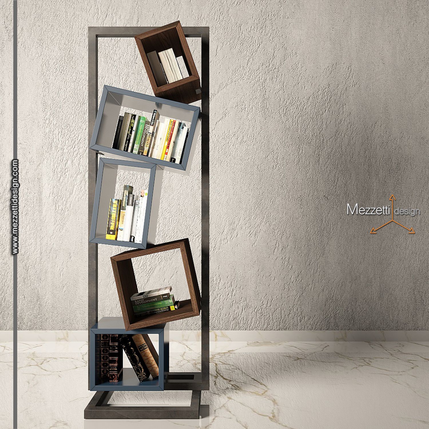 Euilibria è una libreria bifacciale, ovvero fruibile da entrambi i lati, composta da una struttura in ferro che supporta cinque elementi contenitivi. design di Daniele Mezzetti, www.mezzettidesign.com