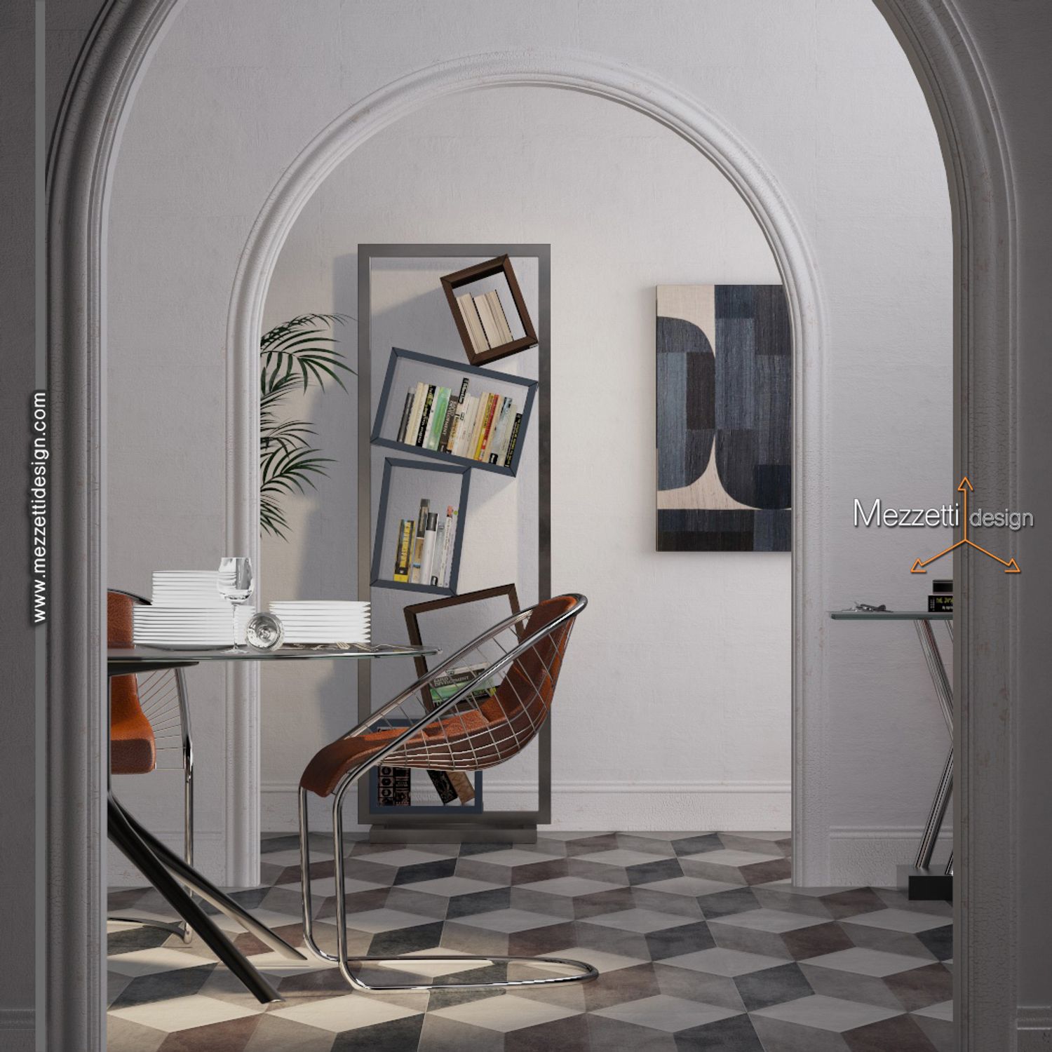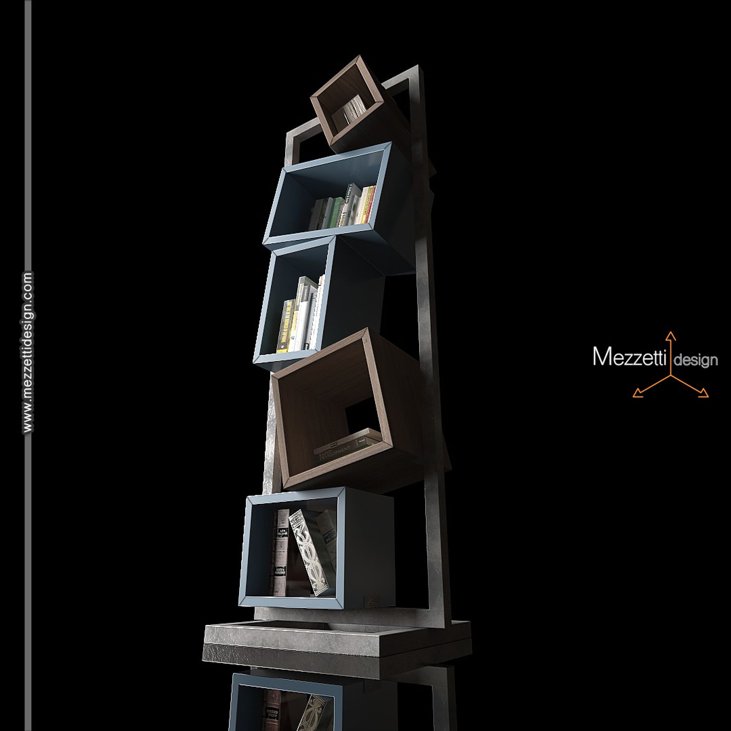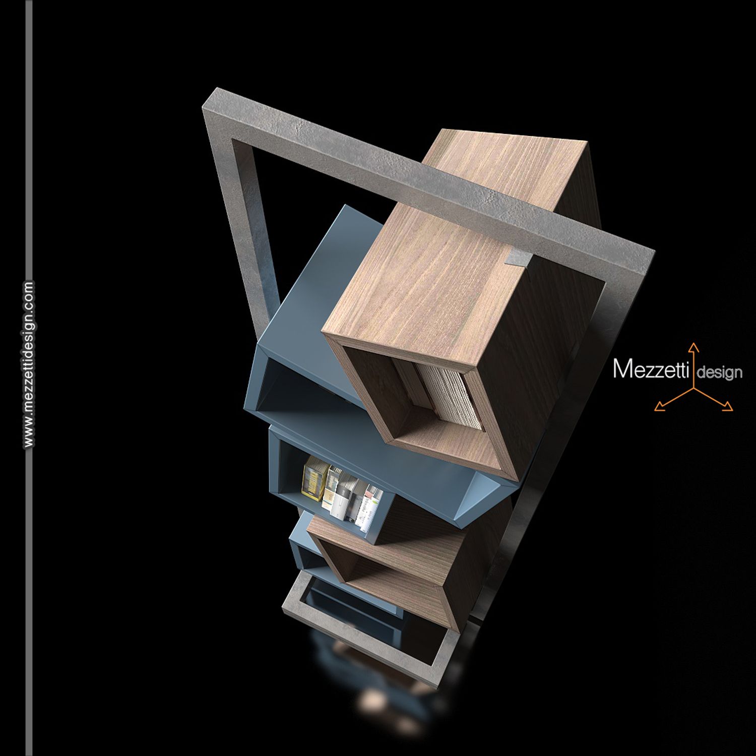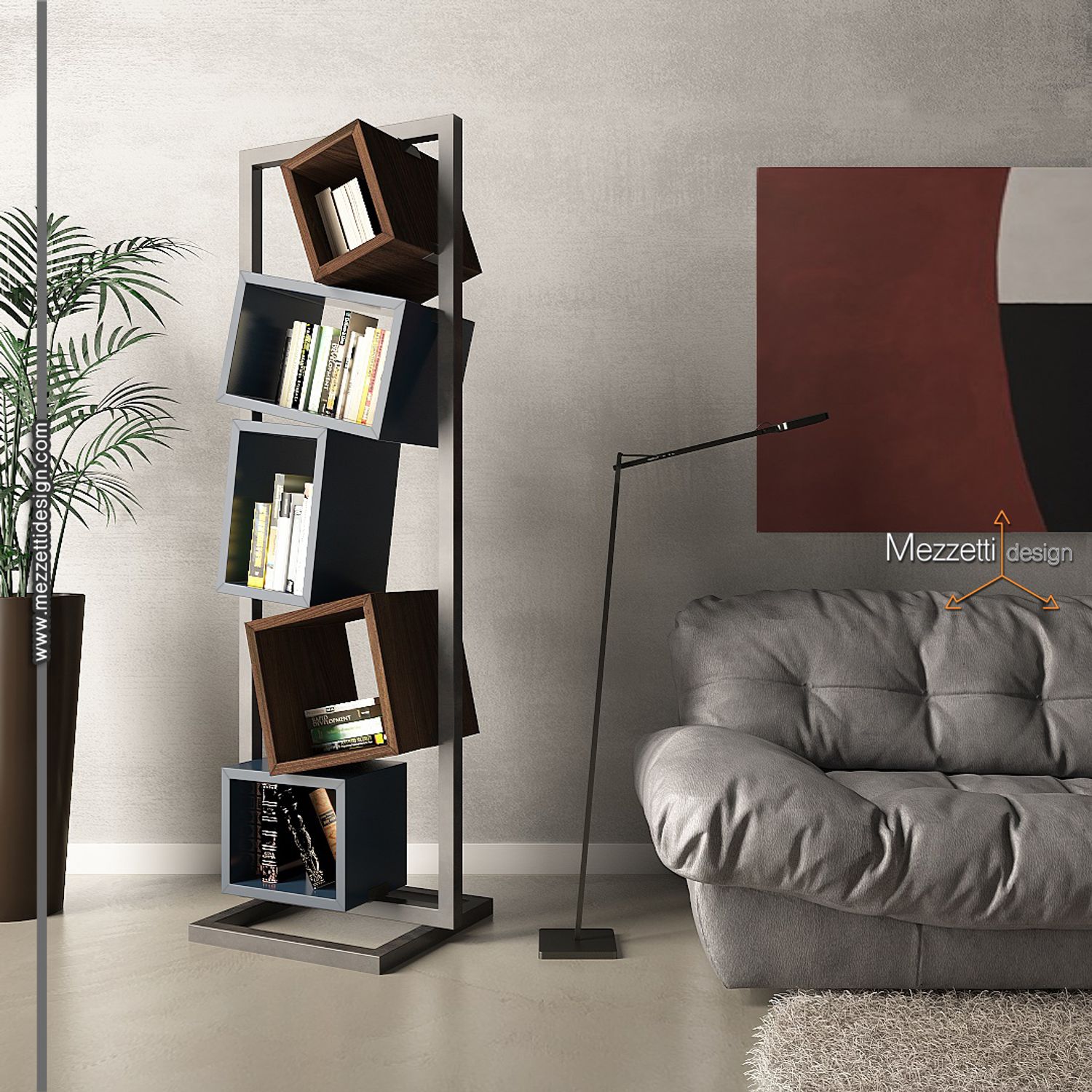Euilibria è una libreria bifacciale, ovvero fruibile da entrambi i lati, composta da una struttura in ferro che supporta cinque elementi contenitivi. design di Daniele Mezzetti, www.mezzettidesign.com