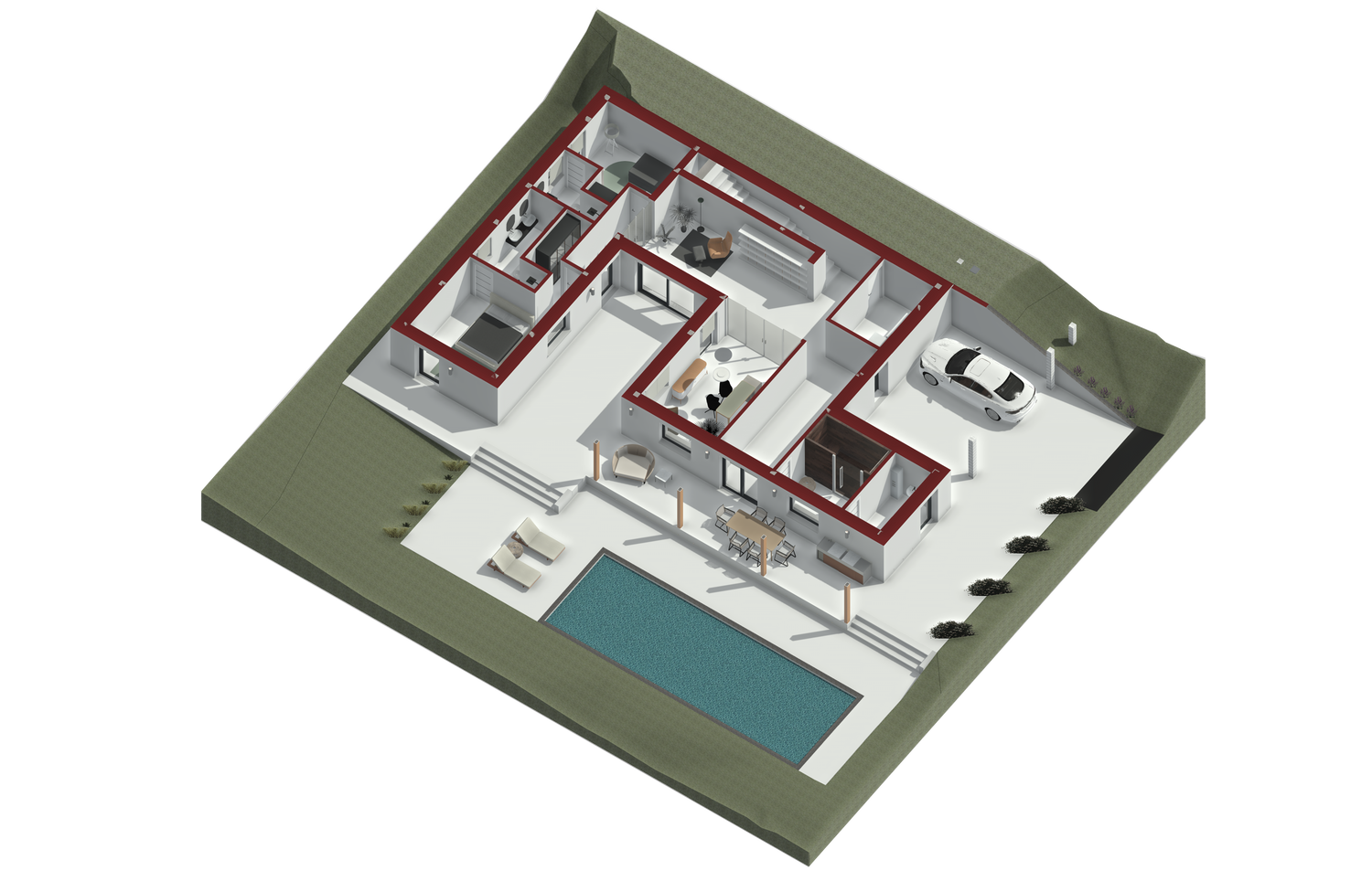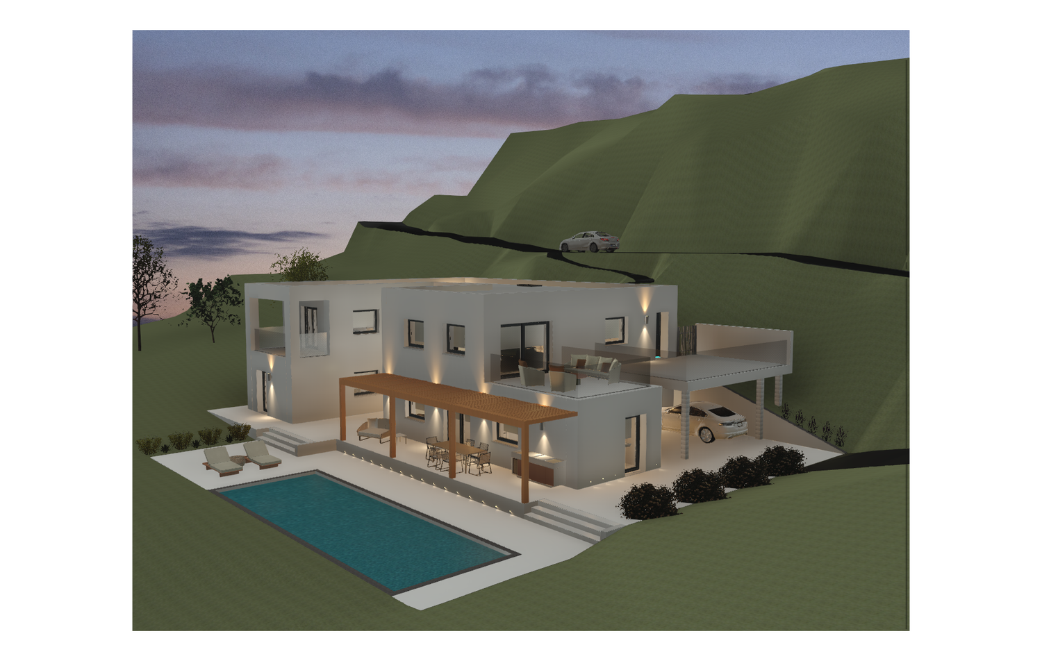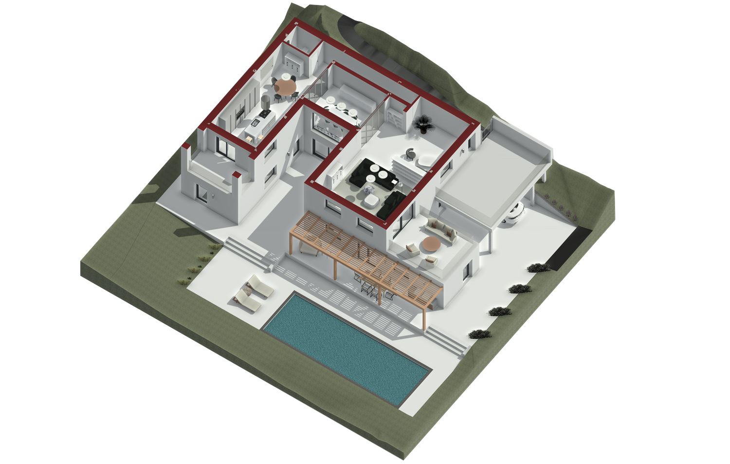 Progetto universitario di villa unifamiliare di ca. 300mq, sulle colline di Contovello (TS). su due livelli, ampio salone con terrazzo e cucina con poggiolo, due camere con bagno interno e spazi di servizio. Viste realizzate con Revit.