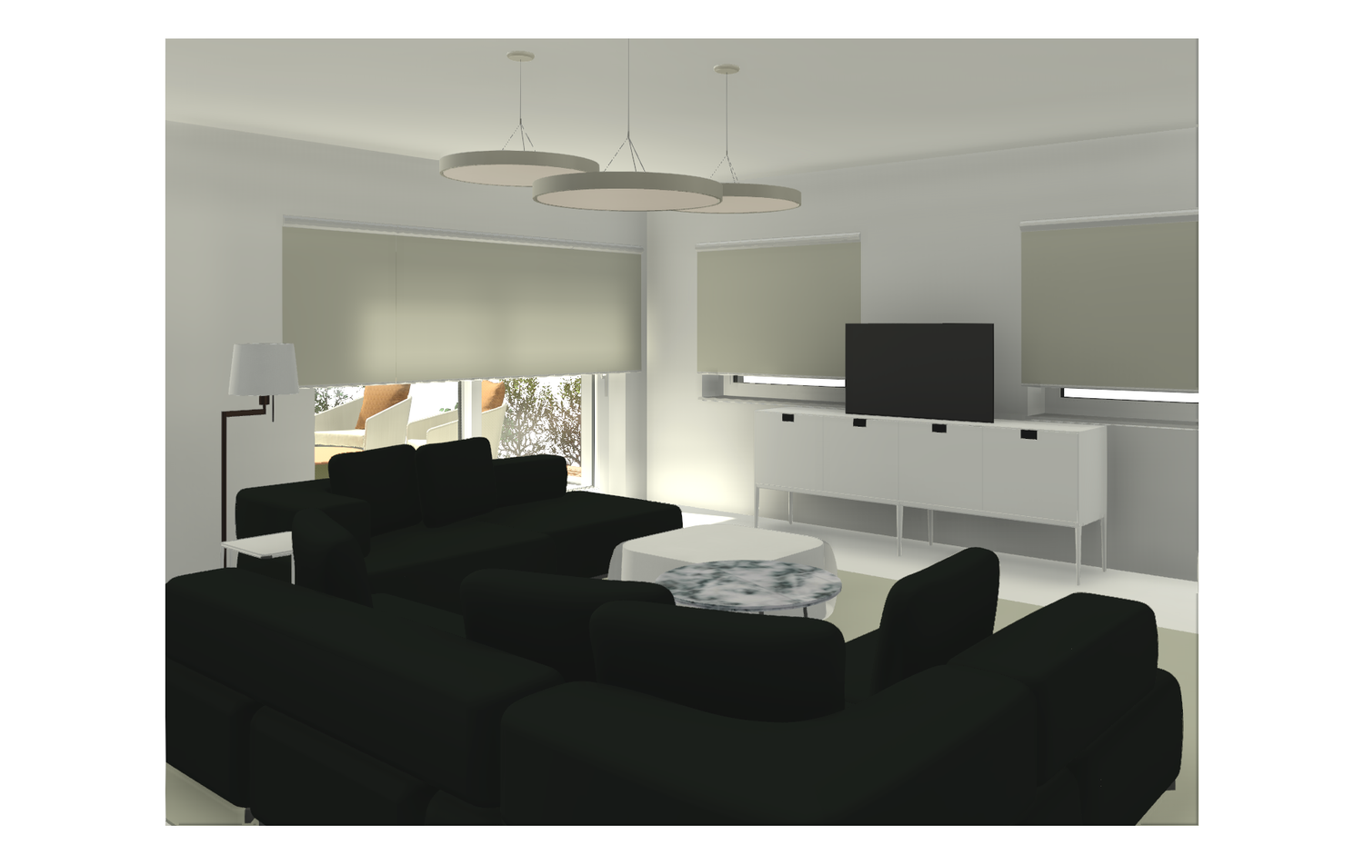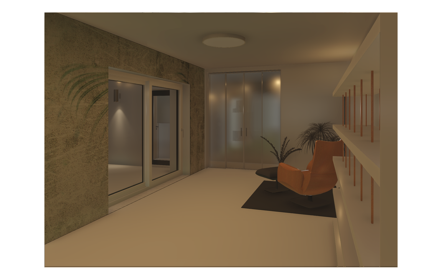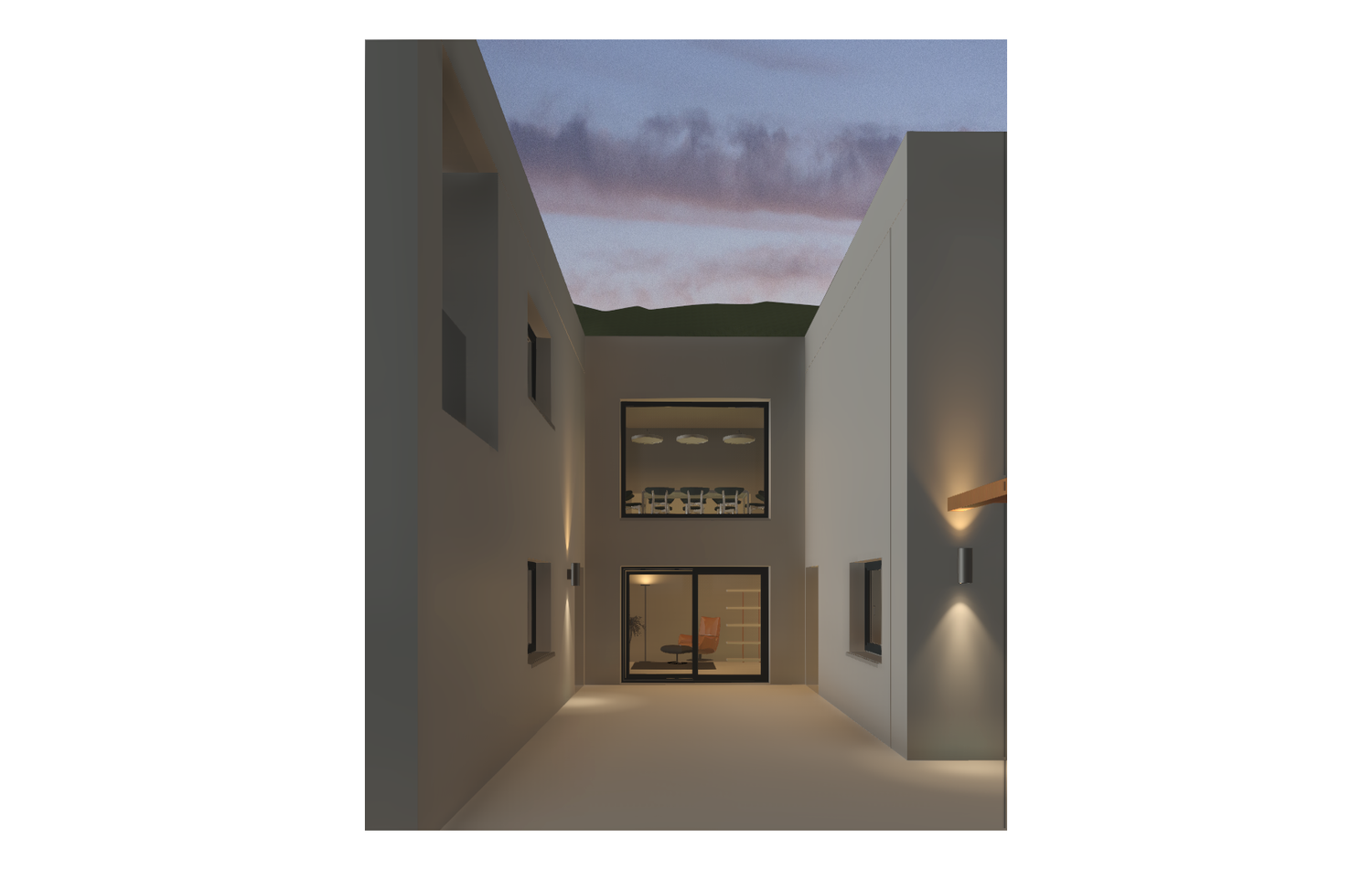 Progetto universitario di villa unifamiliare di ca. 300mq, sulle colline di Contovello (TS). su due livelli, ampio salone con terrazzo e cucina con poggiolo, due camere con bagno interno e spazi di servizio. Viste realizzate con Revit.