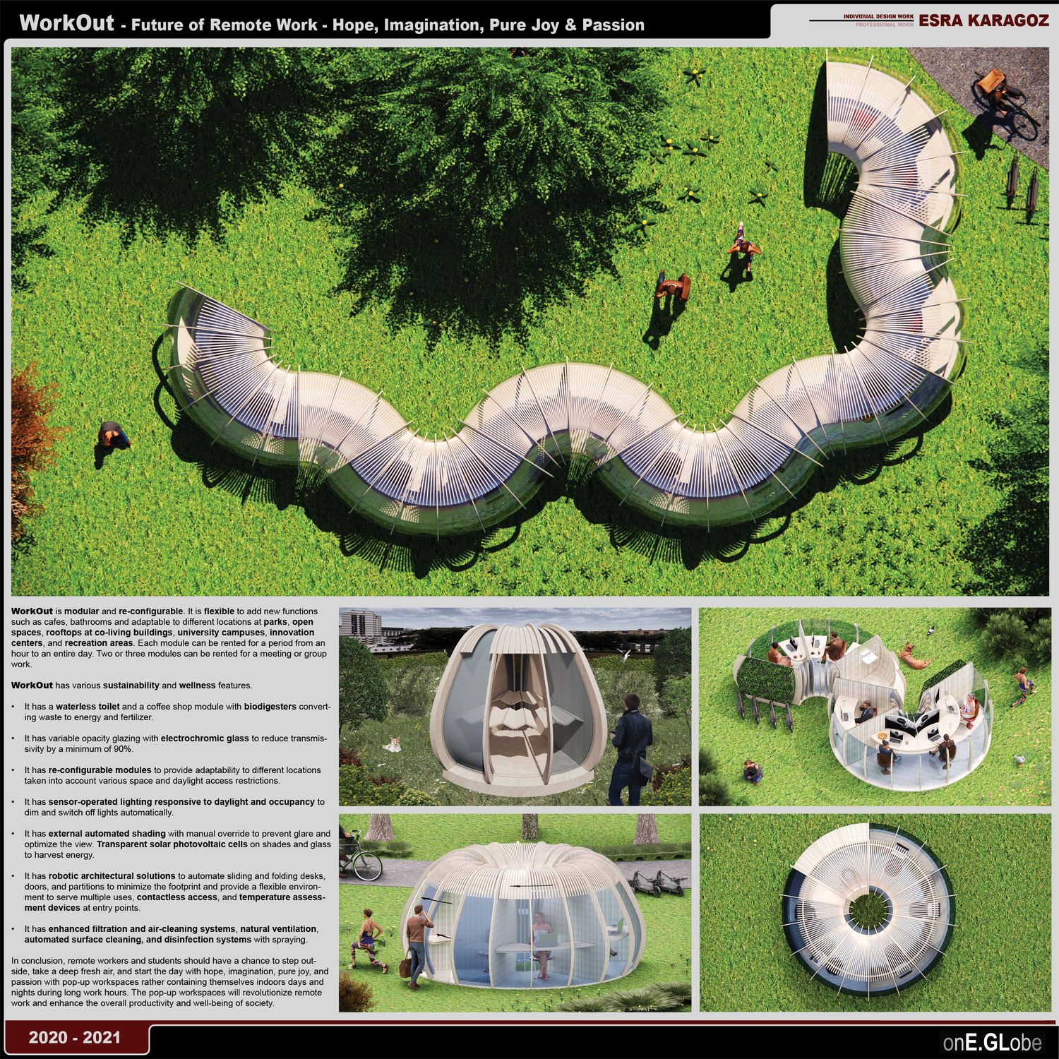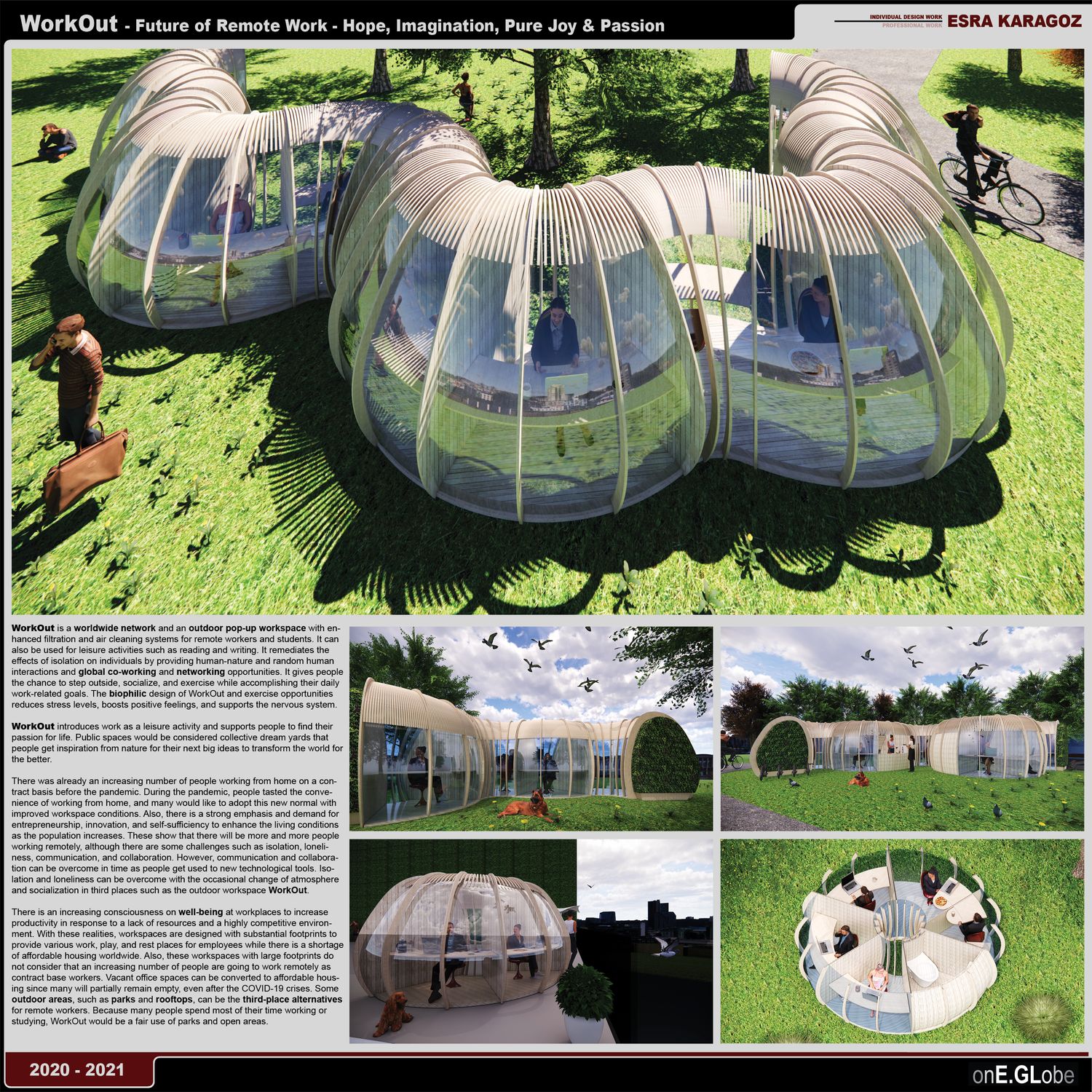 WorkOut is a worldwide network and an outdoor pop-up workspace with enhanced filtration and air cleaning systems for remote workers and students. It can also be used for leisure activities, such as reading and writing. It remediates the effects of isolation on individuals by providing human nature and random human interactions. It enables global co-working and networking for its members. It gives people the chance to step outside, socialize, and exercise while accomplishing their daily work-related goals. The biophilic design of WorkOut and exercise opportunities reduces stress levels, boosts positive feelings, and supports the nervous system.