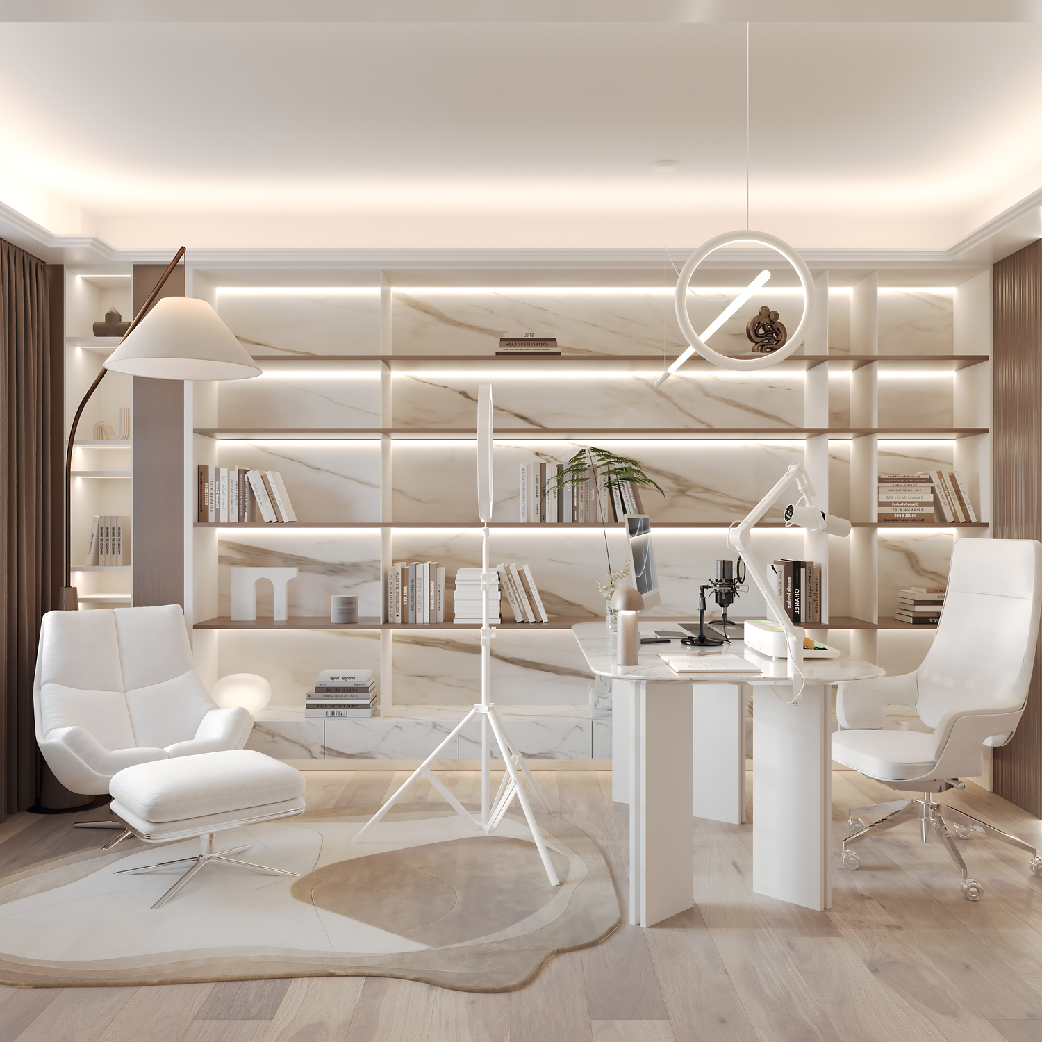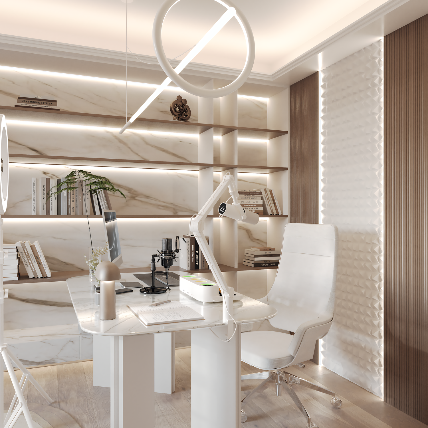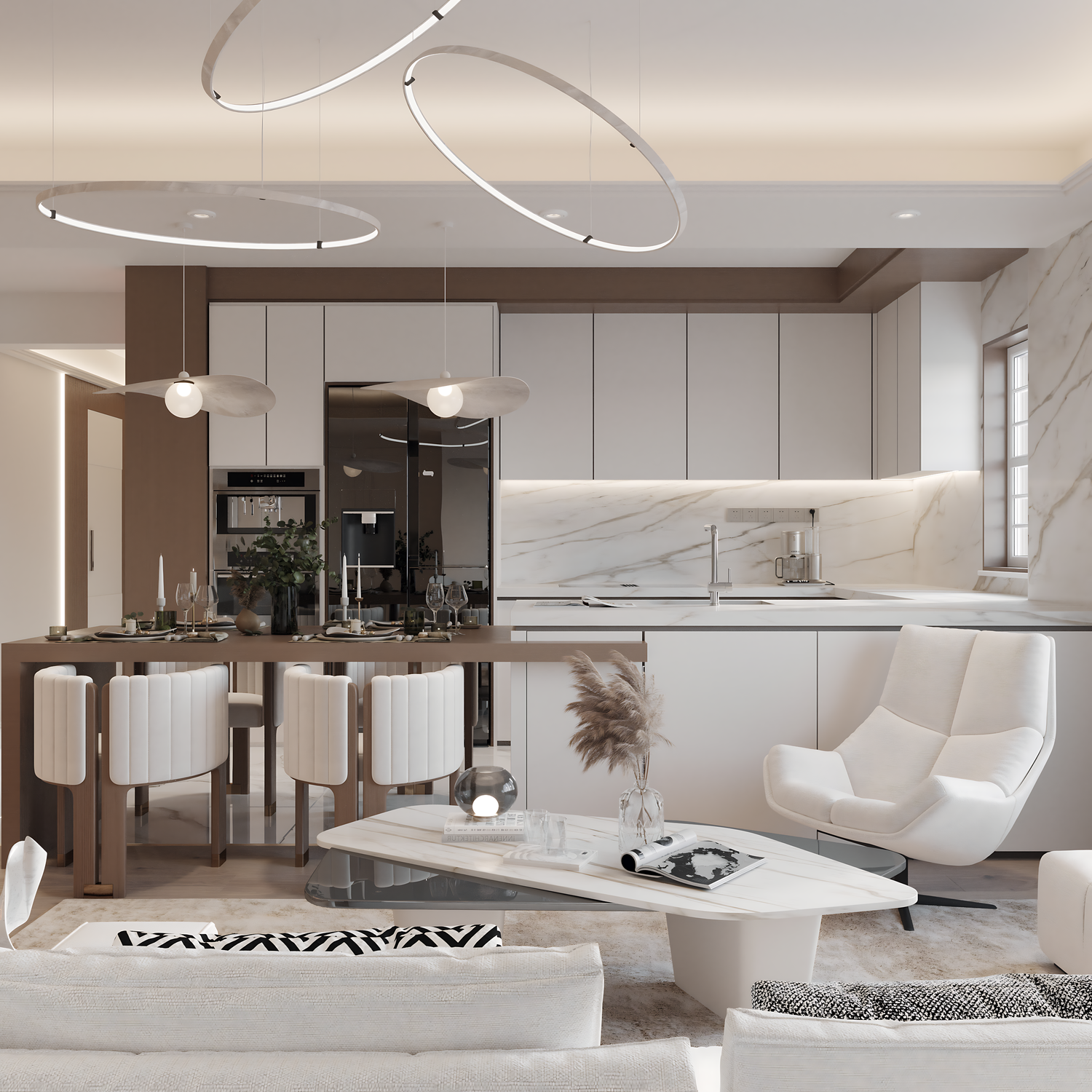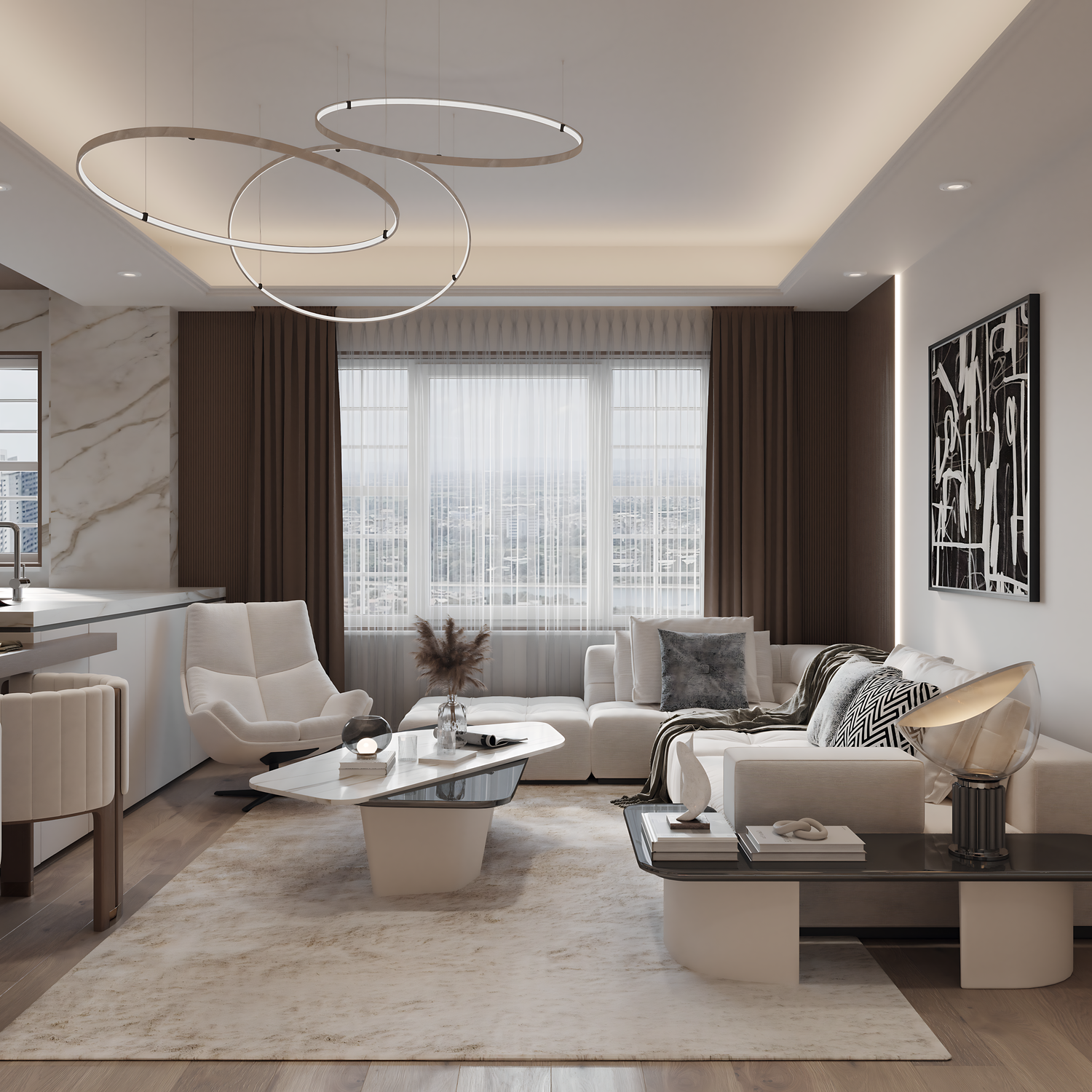 This project is an interior design where modern lines stand out, combining elegance and functionality. In the living room and kitchen, a bright and spacious atmosphere has been created with a light color palette, marble textures, and refined furniture. The seating and dining areas have been designed to ensure spatial continuity, supported by modern lighting and minimal details. In the office, an aesthetic order has been achieved with a marble backdrop and shelving systems, while ergonomic furniture and warm lighting provide a productive and comfortable workspace. The bedroom offers a serene environment with clean lines, warm tones, and concealed lighting. Overall, the project aims to deliver a modern, timeless, and user-oriented spatial experience.