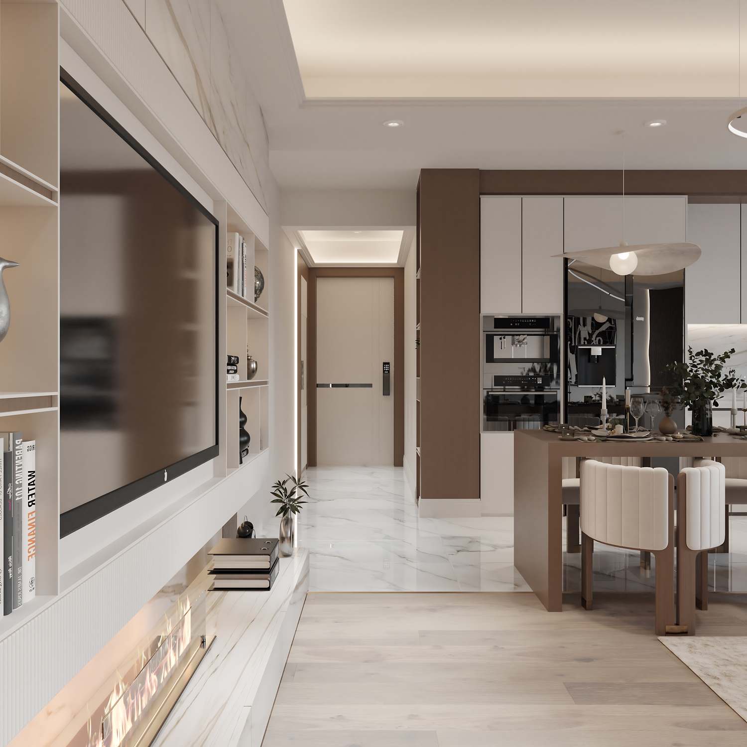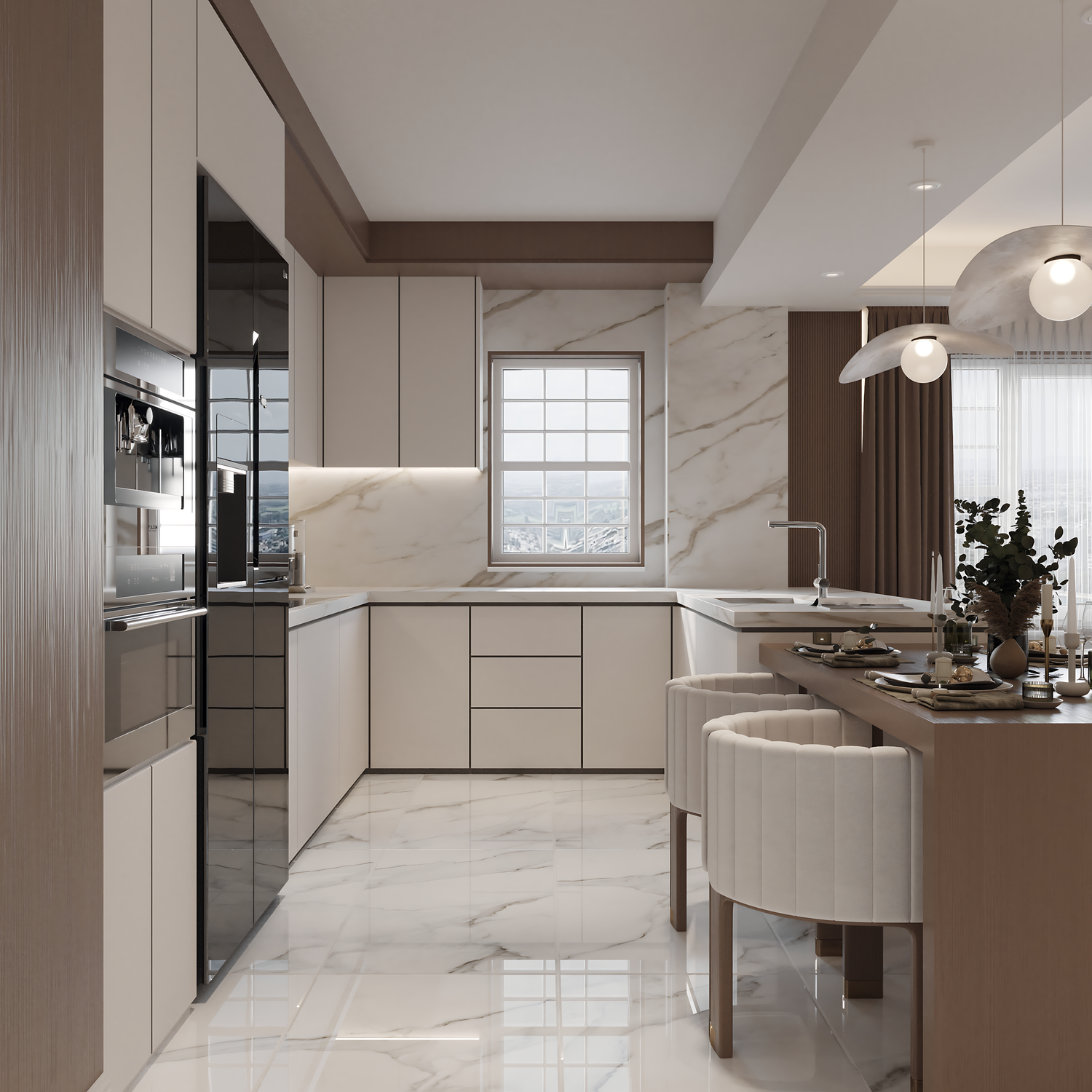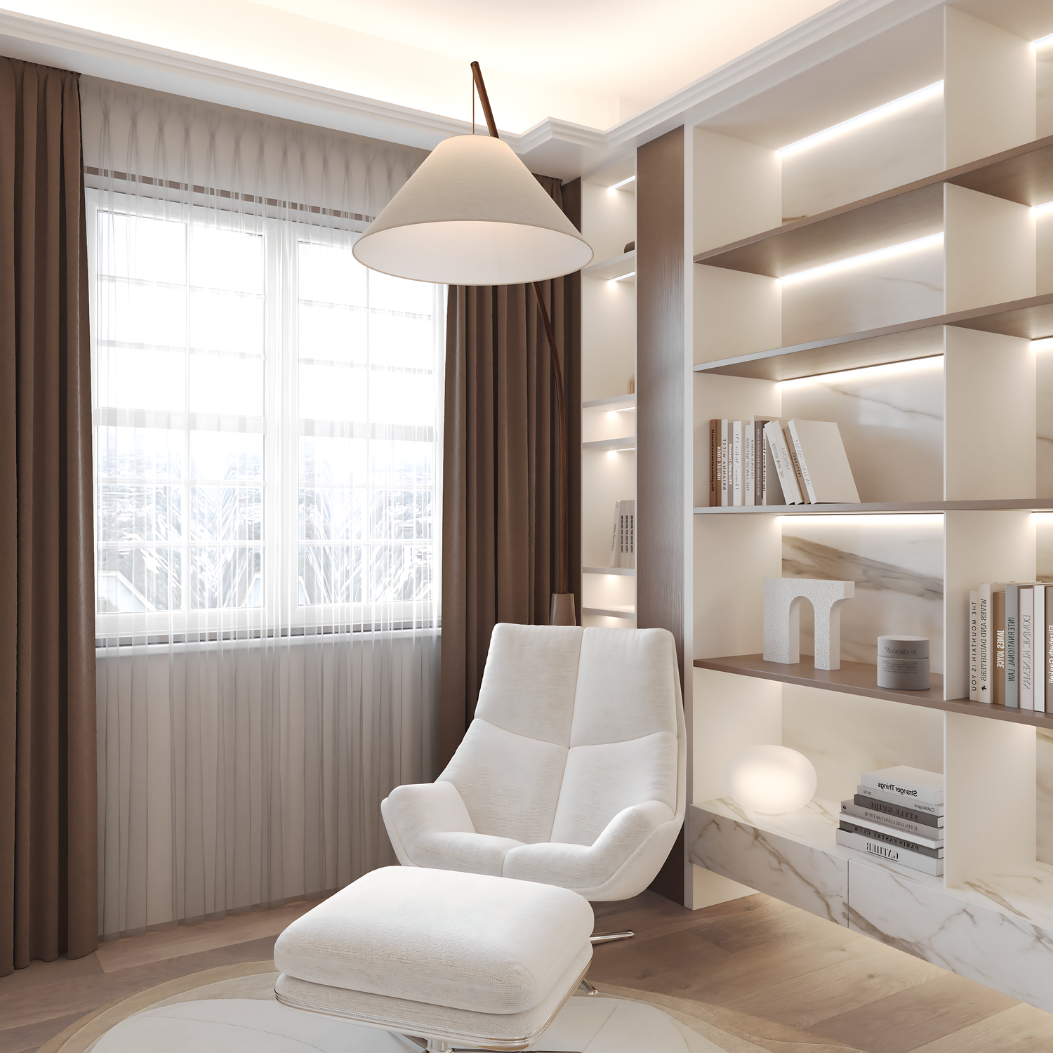 This project is an interior design where modern lines stand out, combining elegance and functionality. In the living room and kitchen, a bright and spacious atmosphere has been created with a light color palette, marble textures, and refined furniture. The seating and dining areas have been designed to ensure spatial continuity, supported by modern lighting and minimal details. In the office, an aesthetic order has been achieved with a marble backdrop and shelving systems, while ergonomic furniture and warm lighting provide a productive and comfortable workspace. The bedroom offers a serene environment with clean lines, warm tones, and concealed lighting. Overall, the project aims to deliver a modern, timeless, and user-oriented spatial experience.
