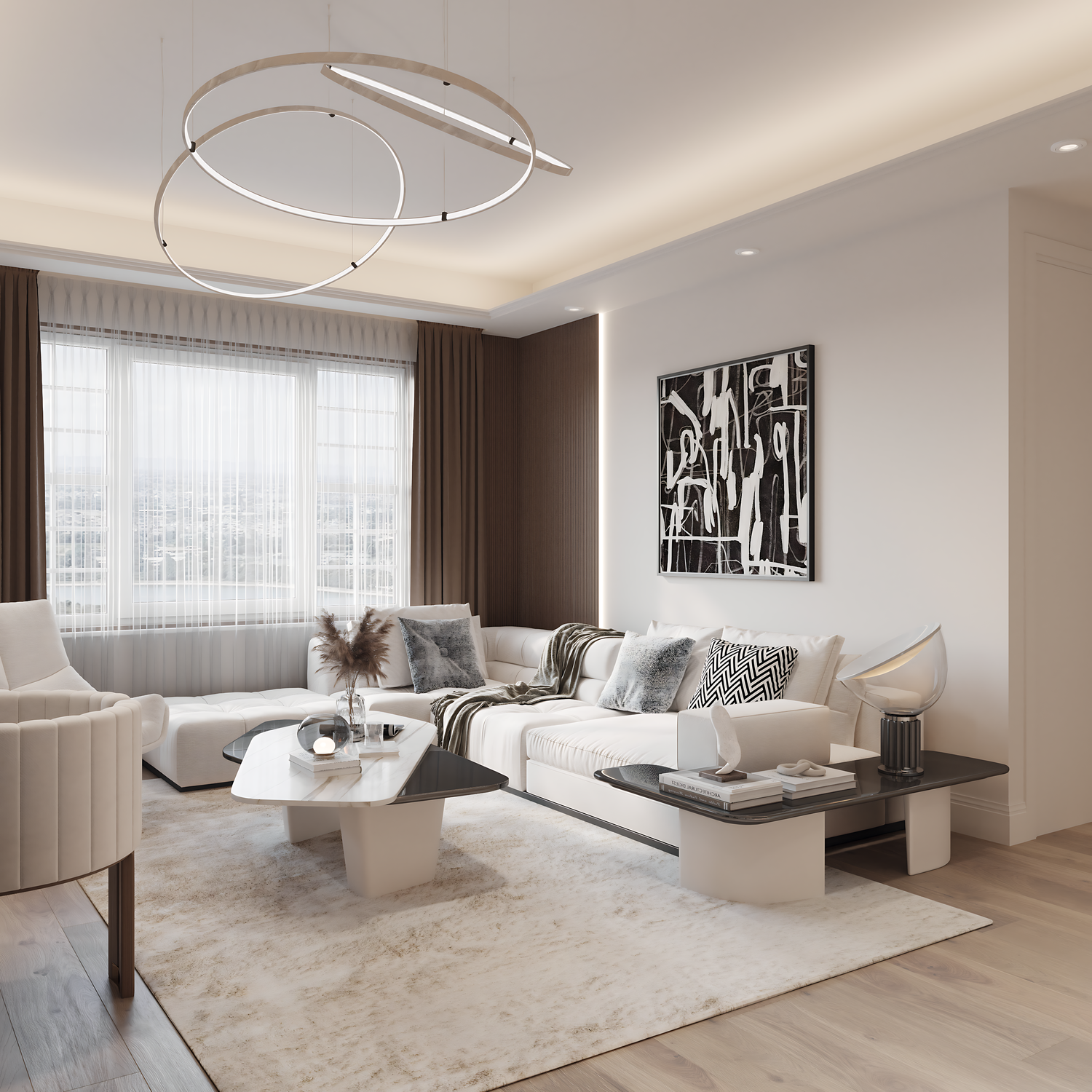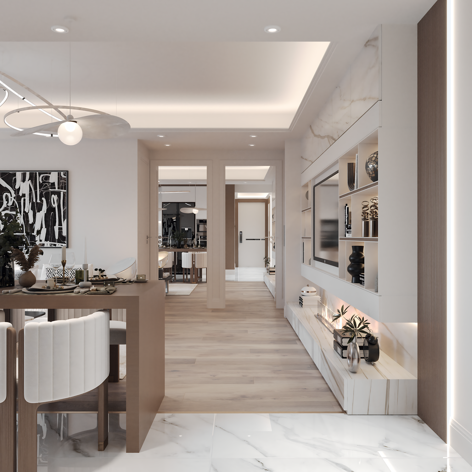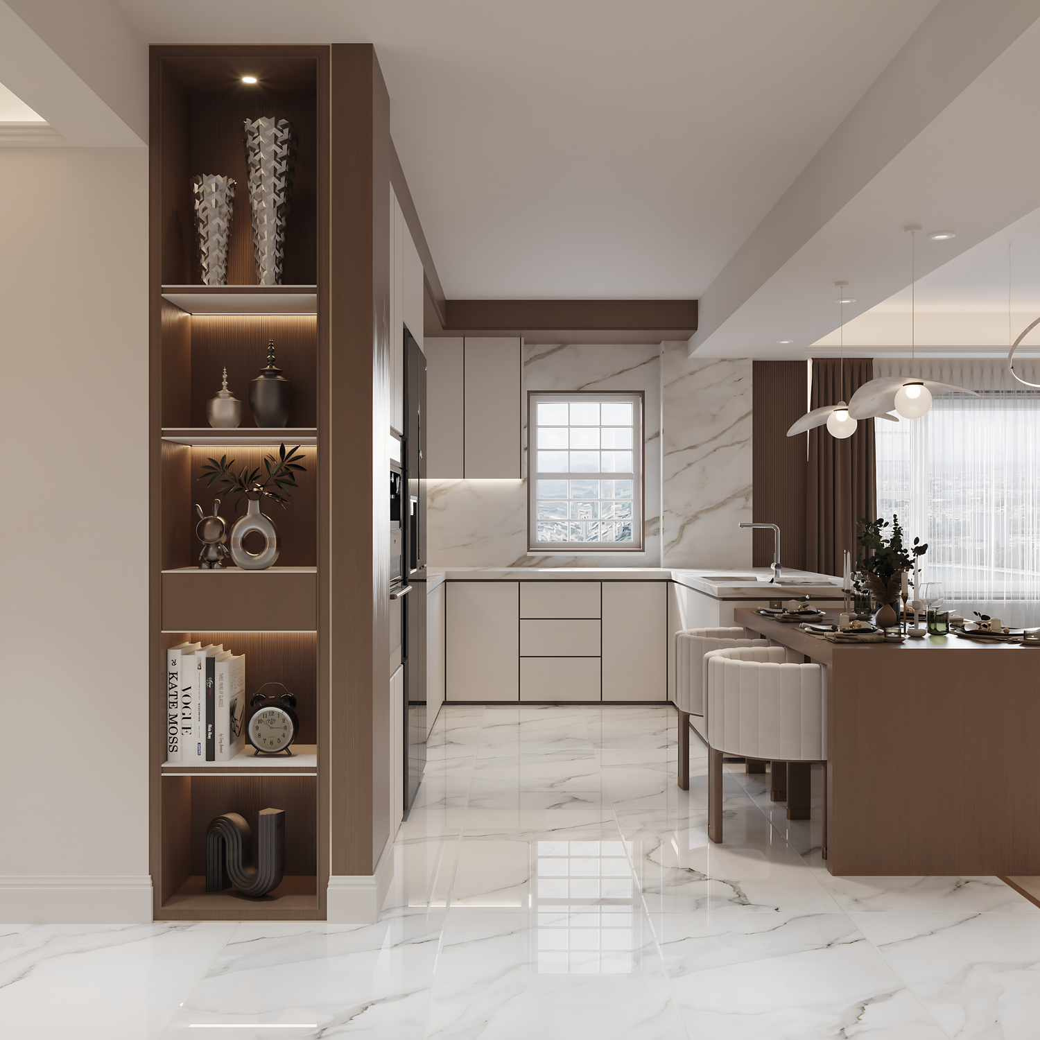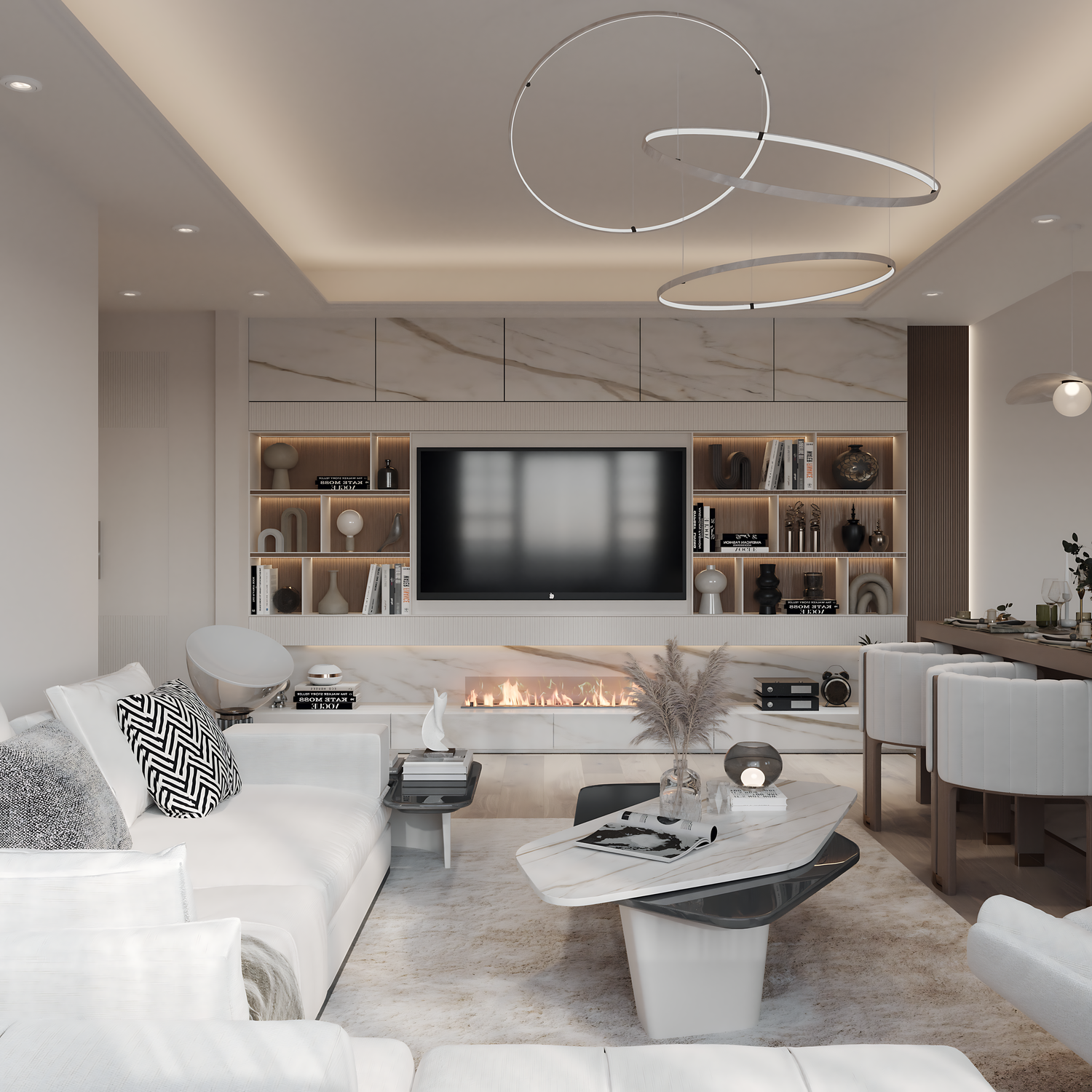This project is an interior design where modern lines stand out, combining elegance and functionality. In the living room and kitchen, a bright and spacious atmosphere has been created with a light color palette, marble textures, and refined furniture. The seating and dining areas have been designed to ensure spatial continuity, supported by modern lighting and minimal details. In the office, an aesthetic order has been achieved with a marble backdrop and shelving systems, while ergonomic furniture and warm lighting provide a productive and comfortable workspace. The bedroom offers a serene environment with clean lines, warm tones, and concealed lighting. Overall, the project aims to deliver a modern, timeless, and user-oriented spatial experience.