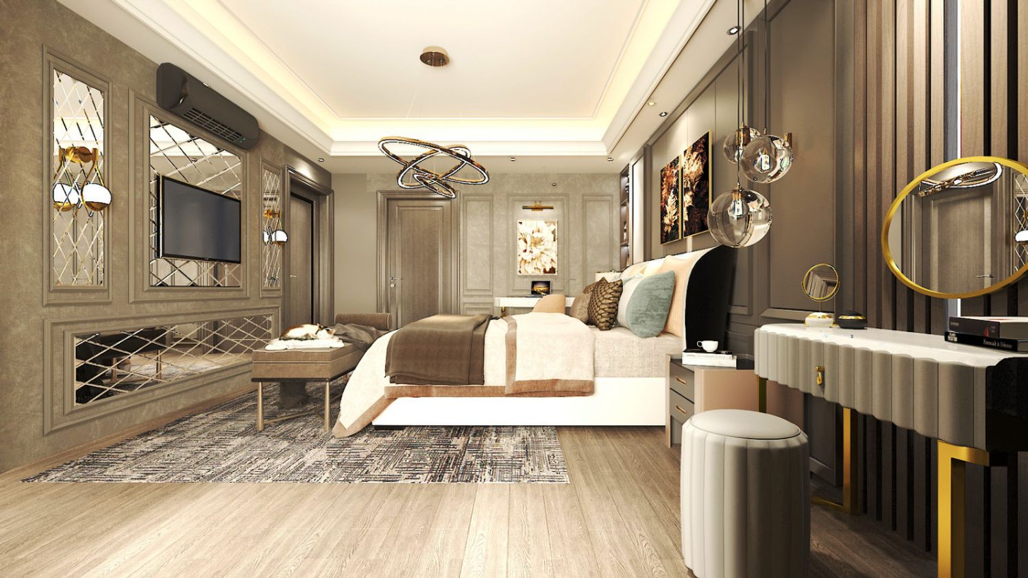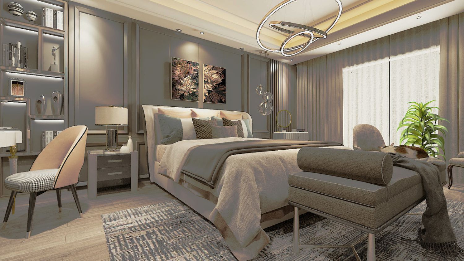 Master bed room has bathrooms as extension The Clint want new classic design ,one big bed,makeup consol,tv unit,desk for laptop