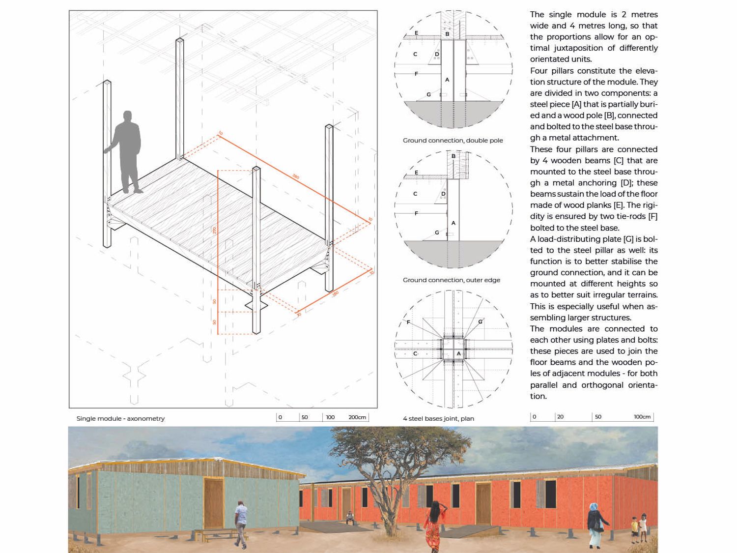 Il modulo singolo è di 2 metri largo e lungo 4 metri, in modo che le proporzioni permettono un’ottimale giustapposizione di diversi unità orientate.