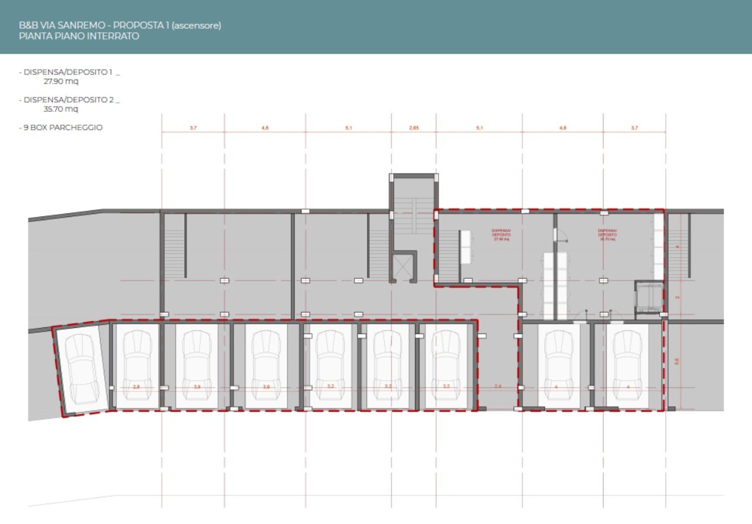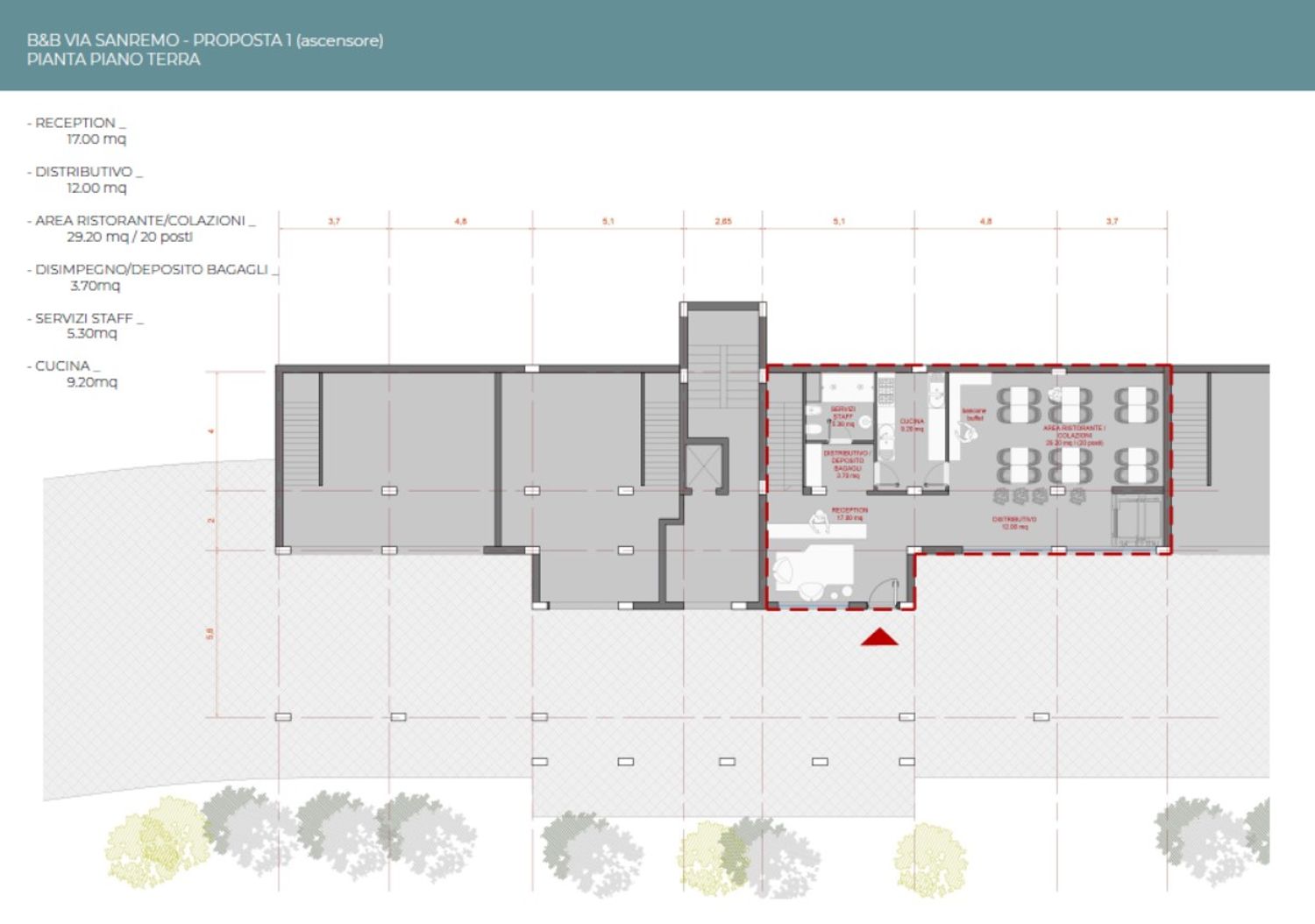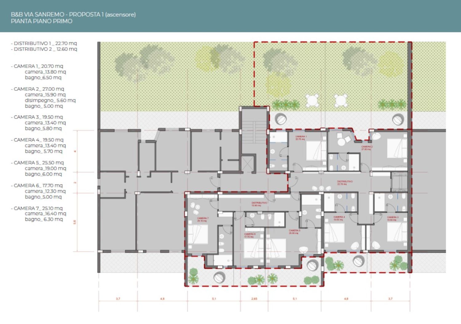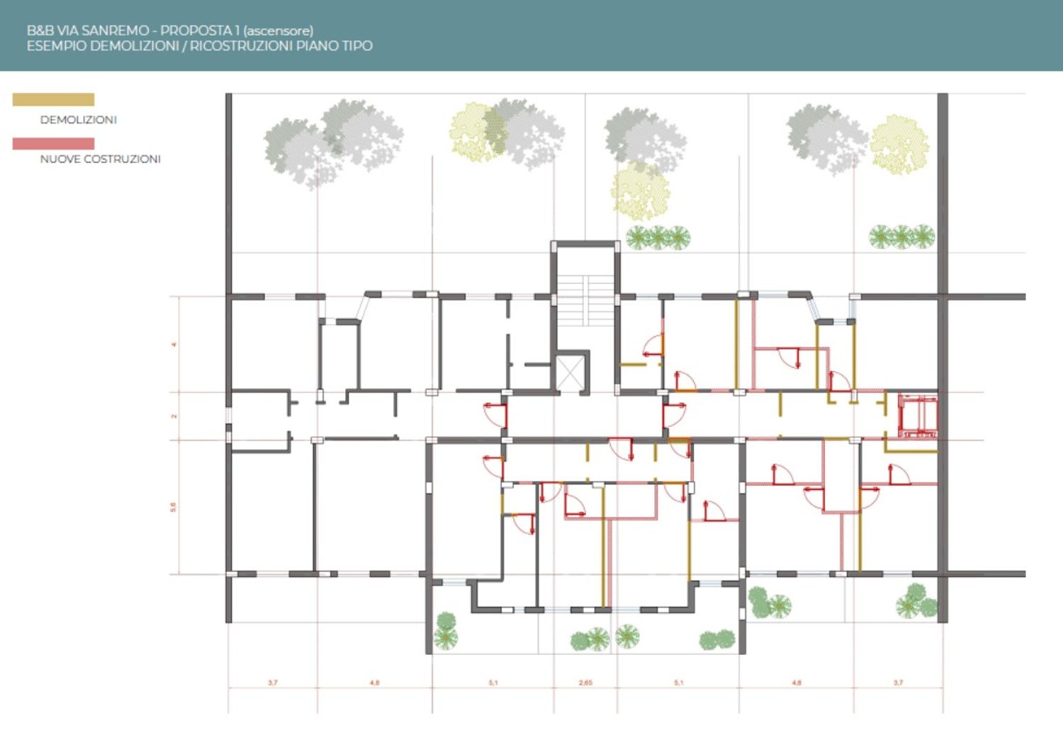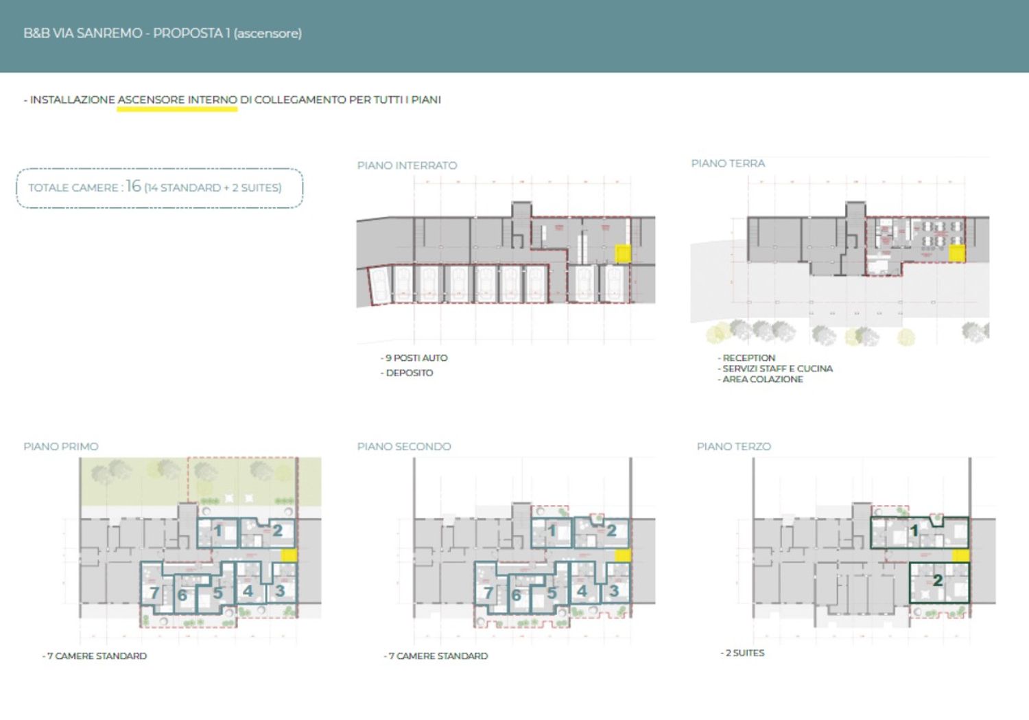 Progettazione architettonica di b&b all'interno di condominio, con sostituzione agli appartamenti di 16 camere di cui 2 suites. Previsione di ascensore interno per collegamento riservato fra tutti i piani
