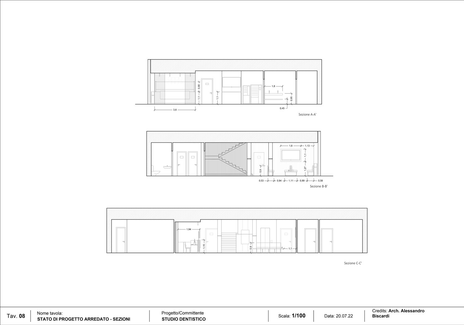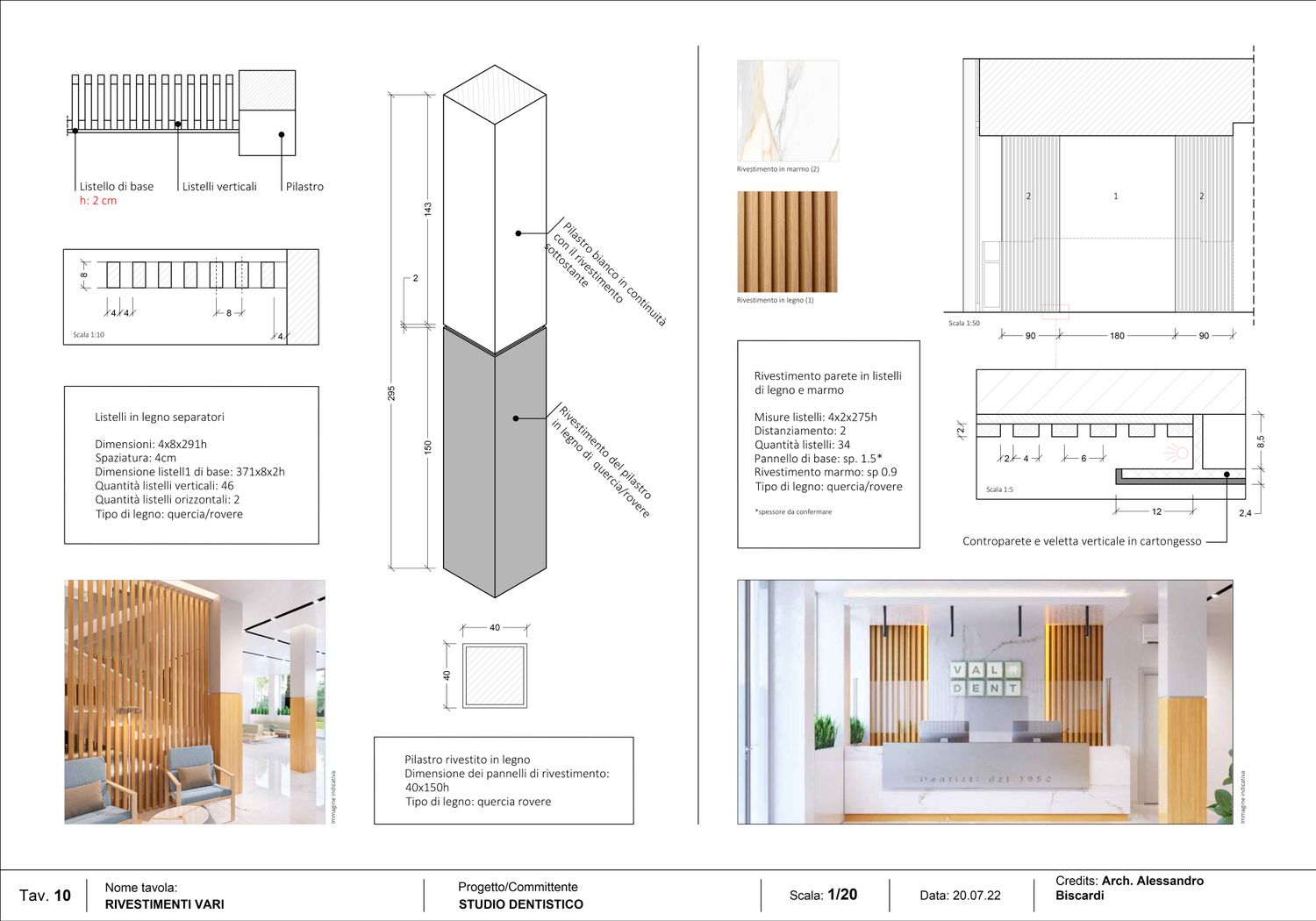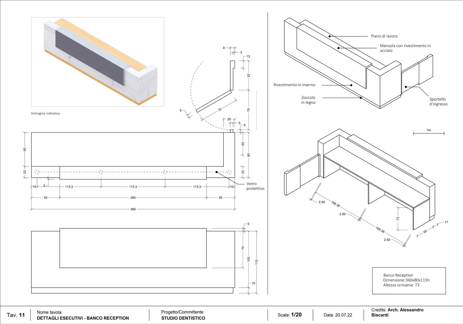 Presso lo studio "Spazio Indipendente" ho potuto collaborare con l'arch. Biscardi alla configurazione dell'area d'attesa e della reception di uno studio dentistico. Lo scopo del progetto era creare uno spazio accogliente e funzionale, dove il transito di addetti ai lavori e non e lo stazionamento dei clienti potessero coesistere, il tutto in un ambiente pulito, moderno e adatto ad una struttura sanitaria. I materiali scelti e il design degli arredi è in linea con il rebranding fatto per lo studio dentistico. In allegato ci sono alcune delle tavole esecutive da me realizzate (i render visibili non stati realizzati da me)