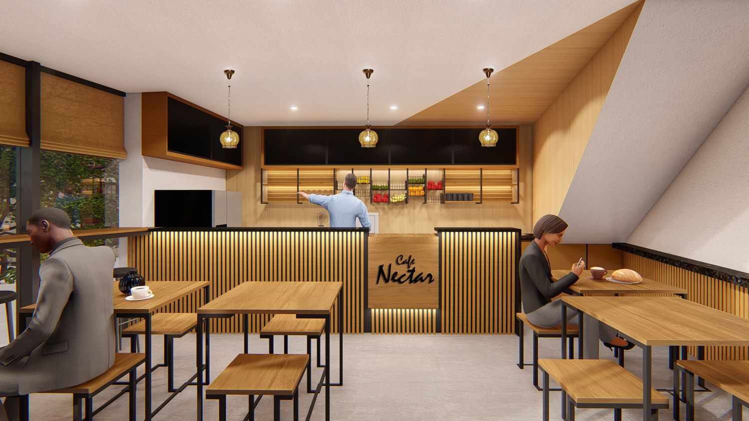 This is a design proposal, to be executed soon, for a cafe. It embraces a war wooden theme, and allows maximum daylight usage. There is optimized usage of space, yet allowing room to breath.