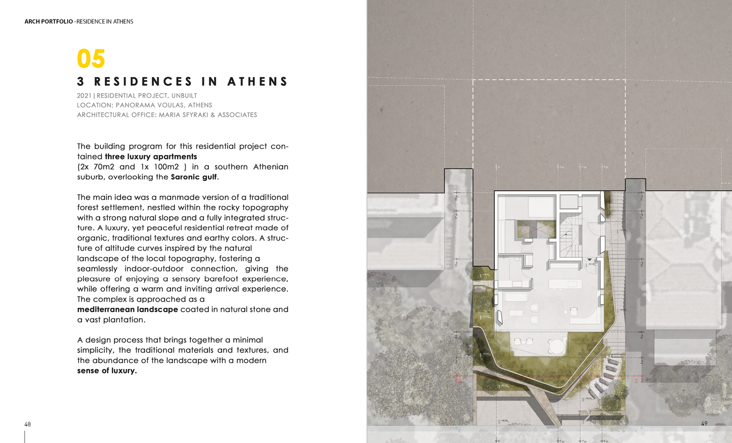 The main idea was a manmade version of a traditional forest settlement, nestled within the rocky topography with a strong natural slope and a fully integrated structure. A luxury, yet peaceful residential retreat made of organic, traditional textures and earthy colors. A structure of altitude curves inspired by the natural