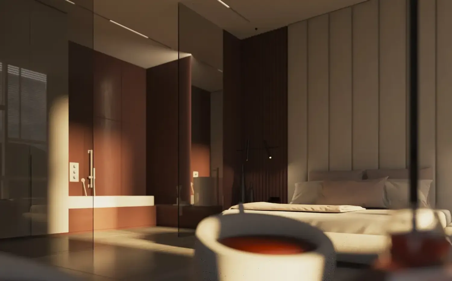 The separating bedroom wall was removed, and added a frosted glass wall to make the room feel much bigger.