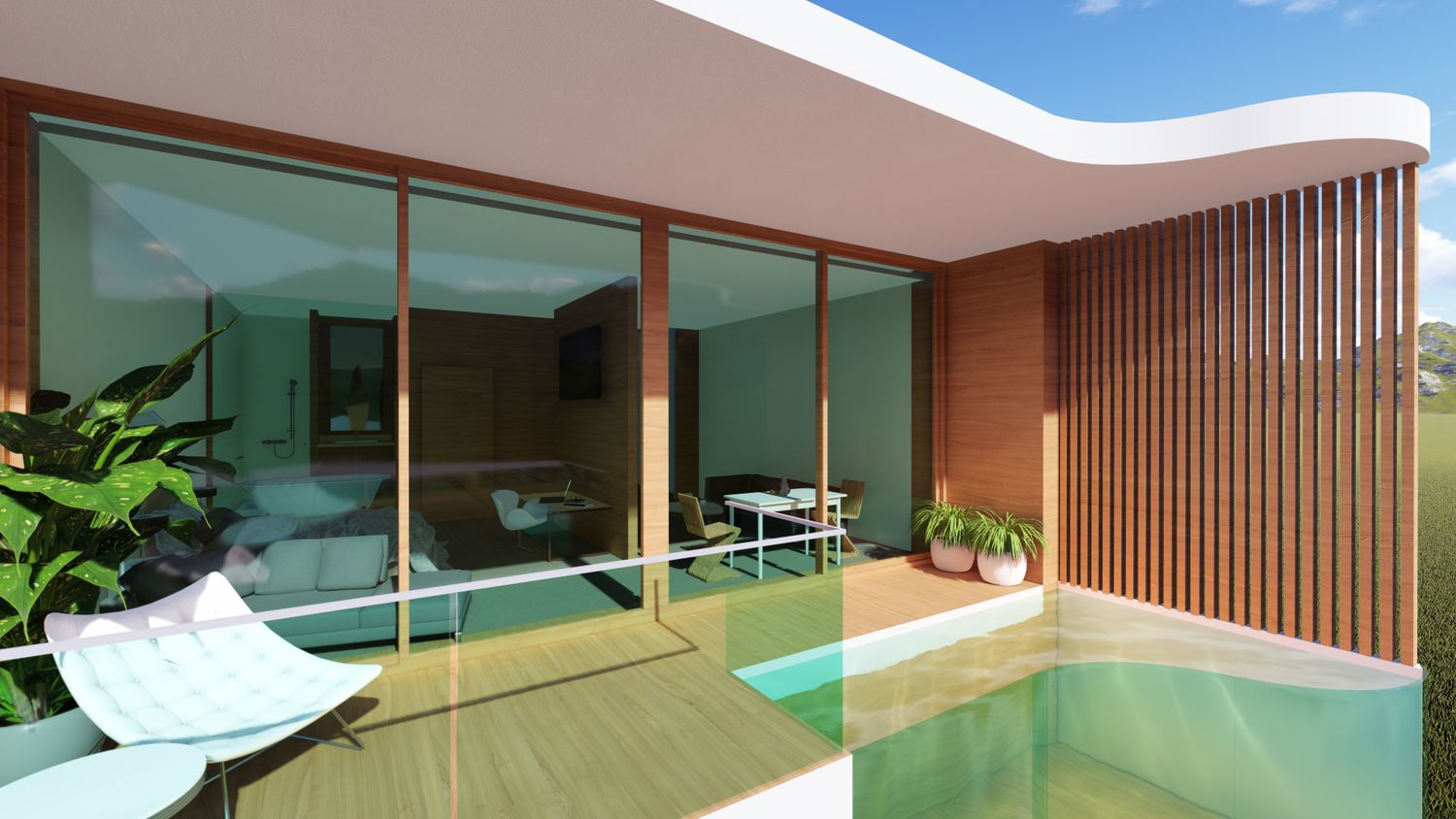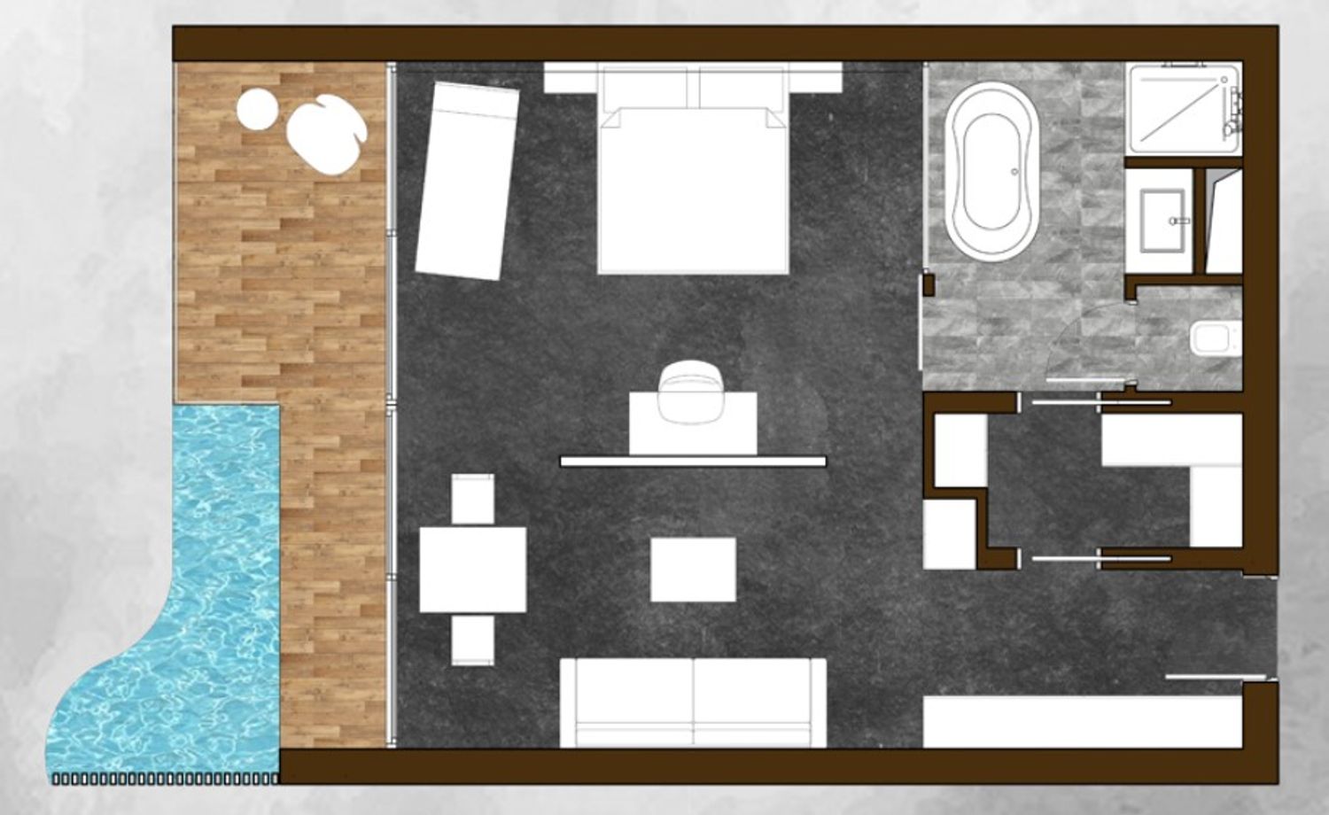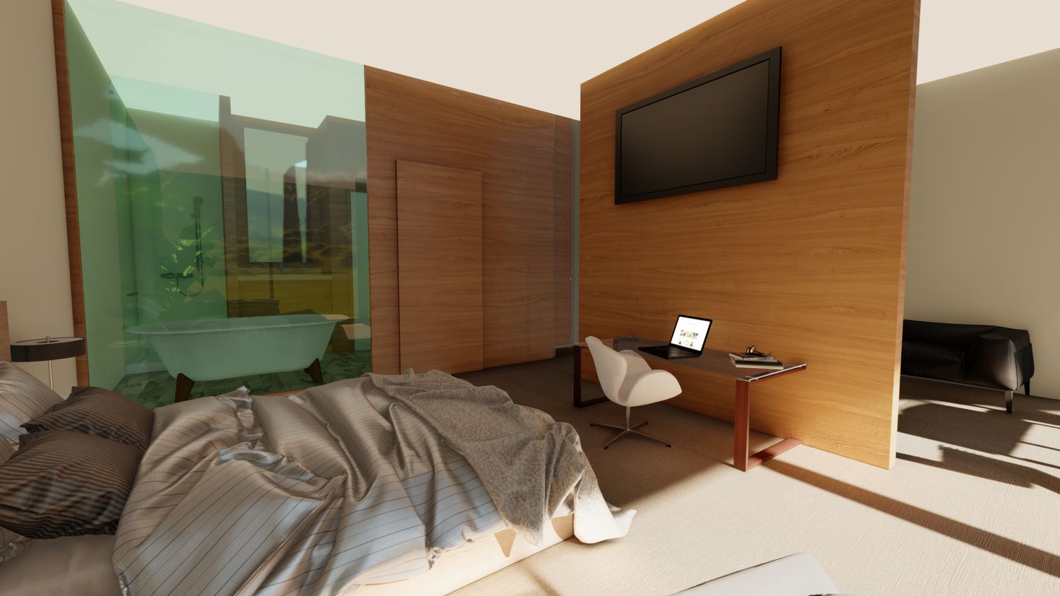In shaping this opulent 5-star hotel suite, the concept revolves around creating a space that seamlessly integrates various activities while preserving a serene ambiance. The design features a unified area where guests can engage in diverse pursuits, feeling both connected and secluded at the same time. The living space, dining area, and bedroom converge, with the bed offering a tranquil view of the pool from the balcony. Expansive glass windows amplify the sense of openness and tranquility. The exquisite bathroom facilitates a seamless connection with the rest of the room, providing a unique shower experience while maintaining a connection to the overall ambiance. The bathroom effortlessly transitions into the dressing area, accessible through an alternative entrance. A pivotal TV unit serves both the living space and the bed, complementing the intimate coffee corner. This architectural marvel is crafted to deliver not only comfort but also a comprehensive experience where each element contributes harmoniously to a feeling of well-being and tranquility