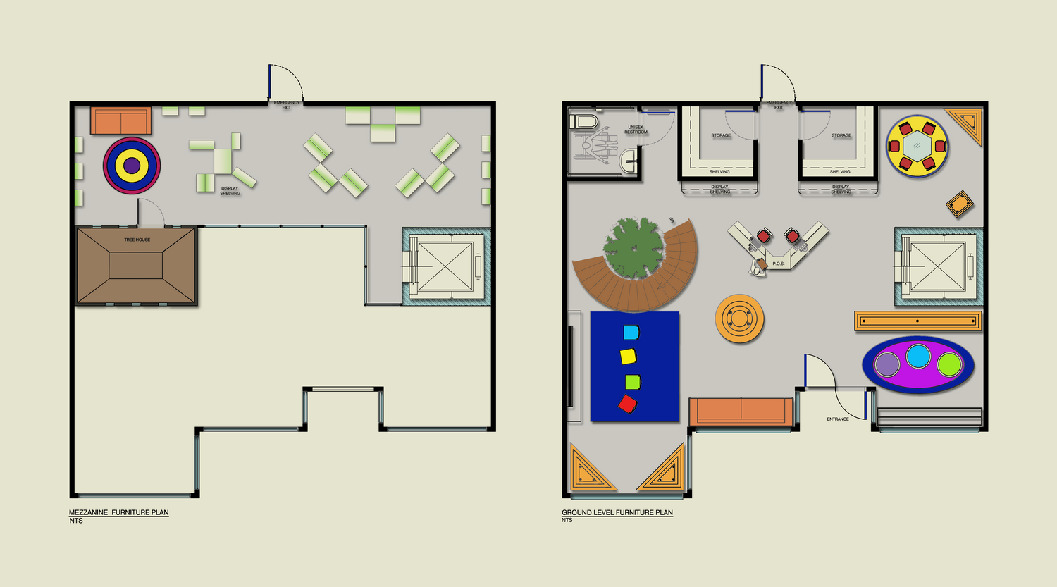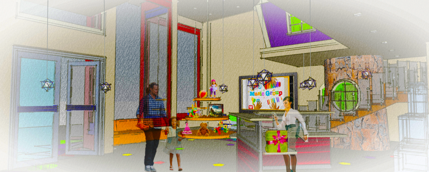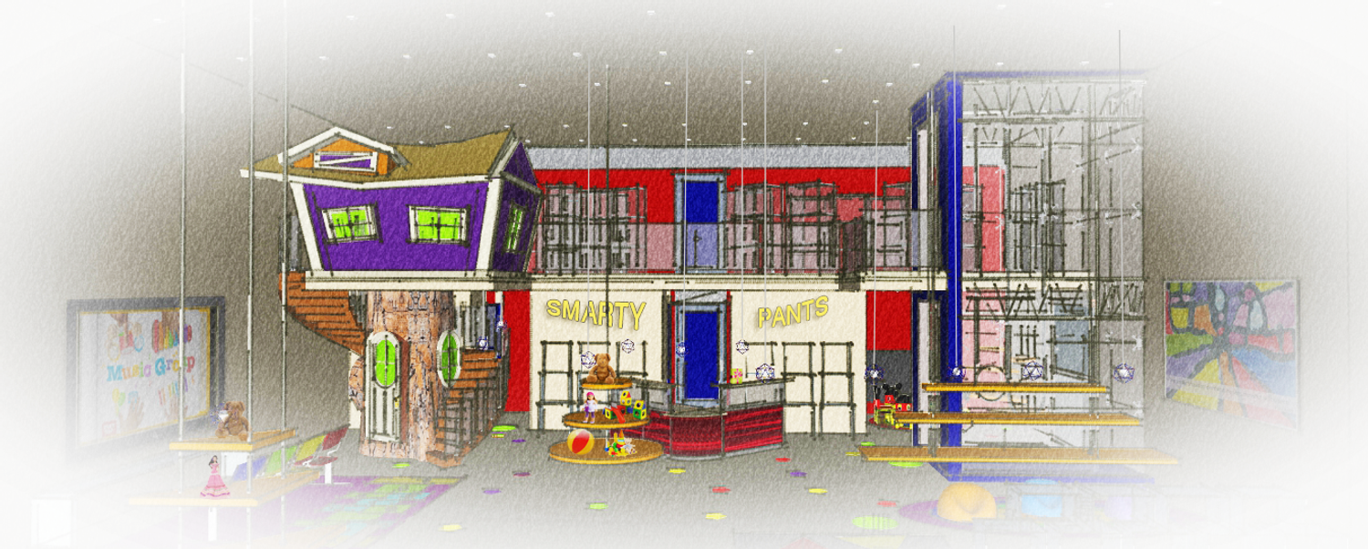 A creative concept for a children’s toy store: with bold colors, balanced lighting, custom fixture design, Piezoelectricity in the flooring for stimulating the children, Piezoelectricity for subliminal way finding, a tree house with the surrounded spiral staircase 6”riser sized for children, as well, the Smarty Pants logo and signage. Seventh heaven for children!