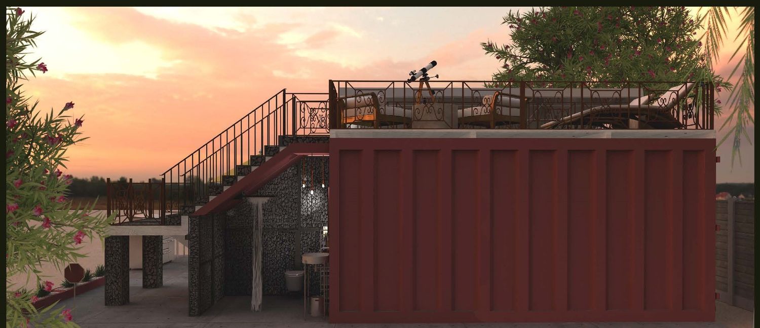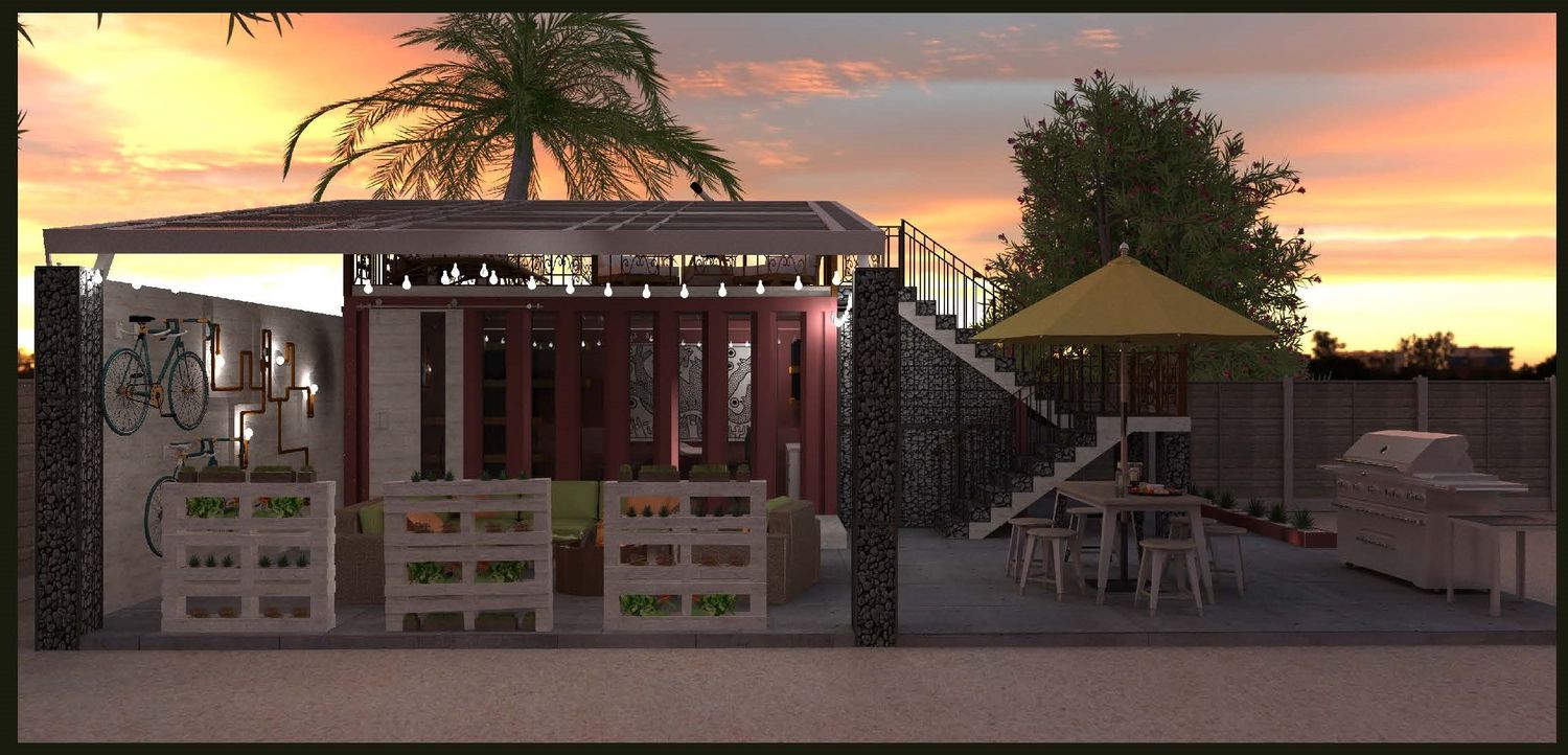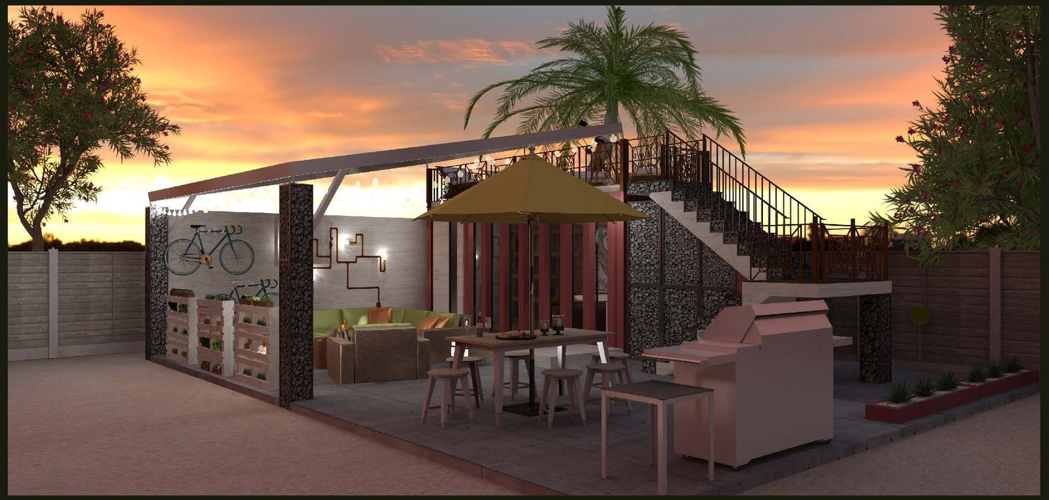 The object of this project was to design an inviting space for a shipping container used as an office and integrate the solar panel designed by Develosol Solar. I opted to have an open living area to incorporate the solar panel above. Next, I created a sun/star gazing deck on the roof of the shipping container. I developed the 3D model in SketchUp Pro, adding materials, lighting, images and landscape. And lastly, I generated photo-realistic renderings using SU Podium software.