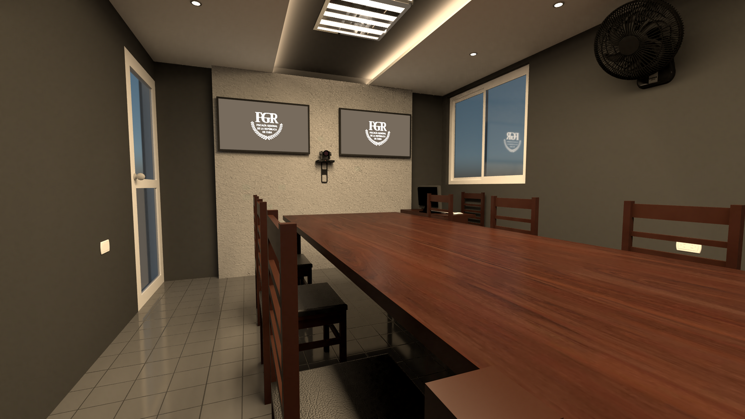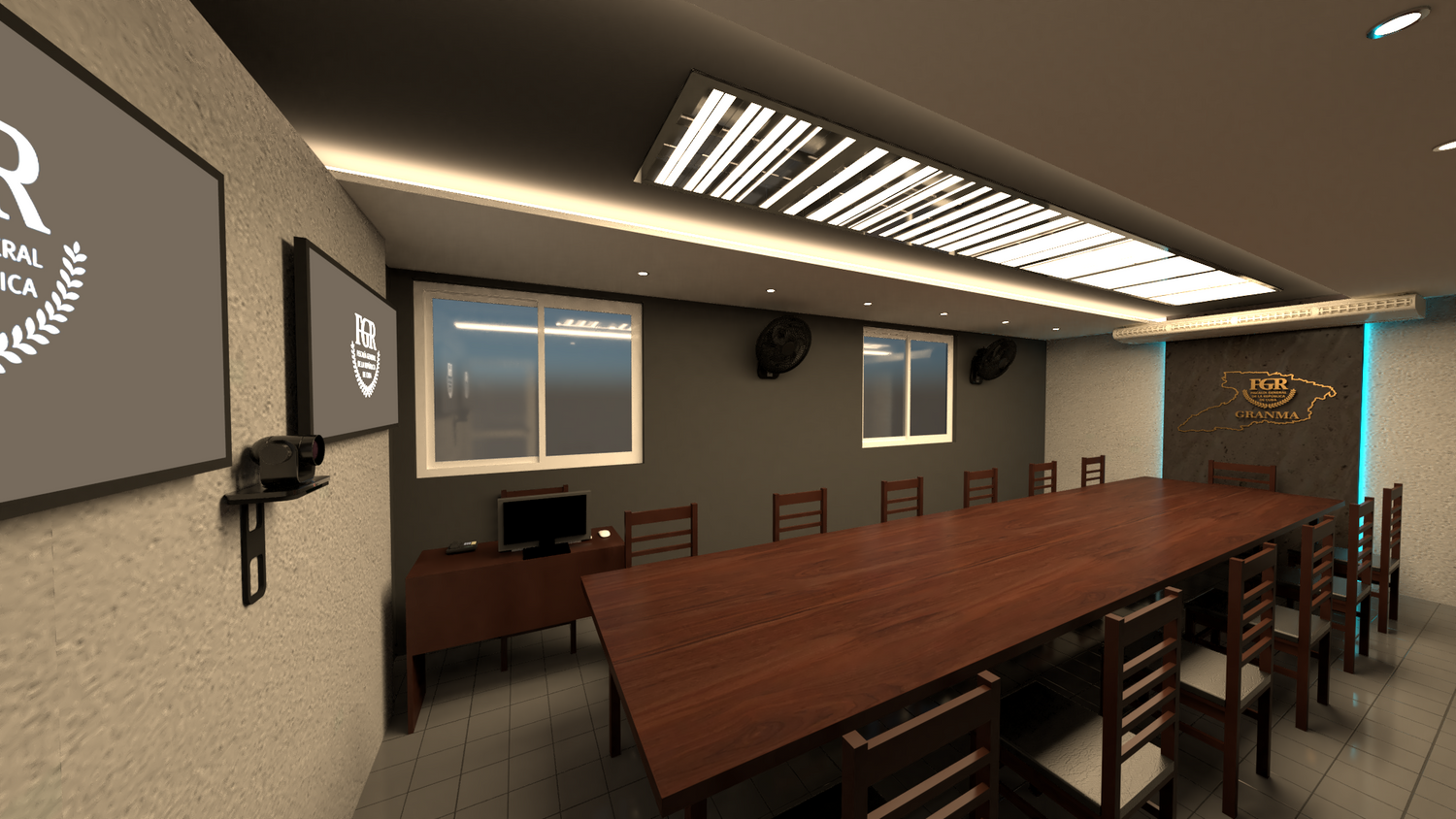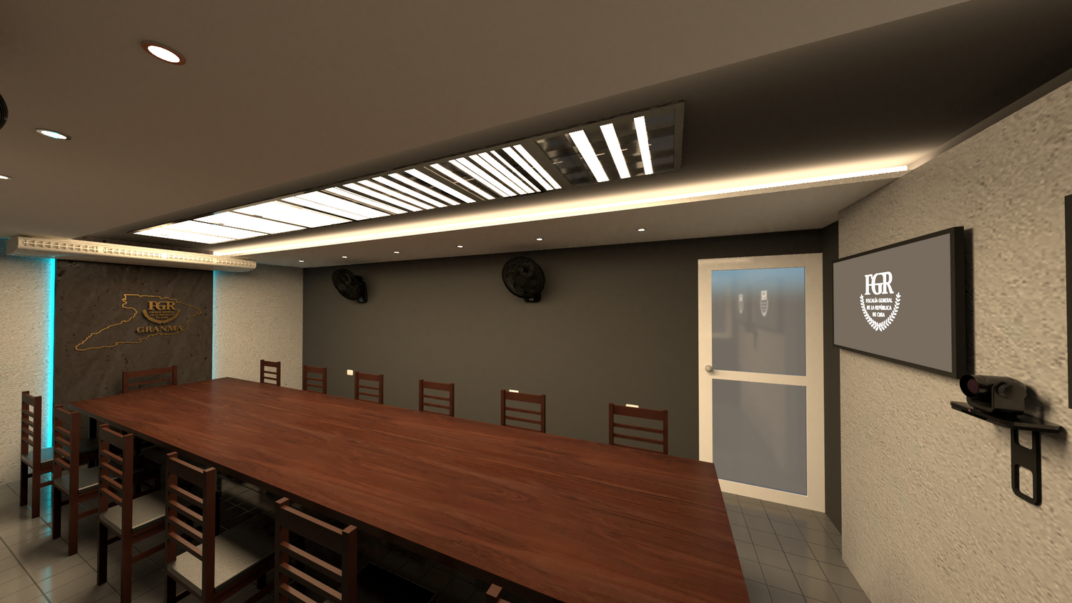 The project consists of adapting an existing meeting room into a videoconference room for the FGR. A simple design was sought, without points of emphasis that captured the attention of the participants. The colors evoke the sober character of the judicial institution. For the spatial design of the furniture and technical equipment, the document issued by the company Solintel, S.A. that establishes the parameters to be considered for better results was taken as a reference.